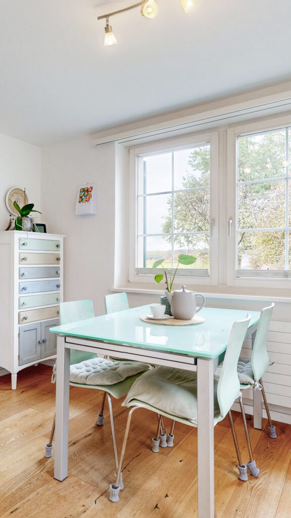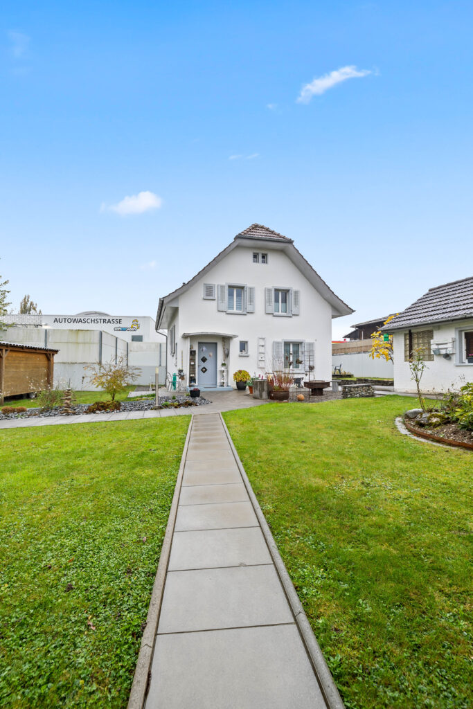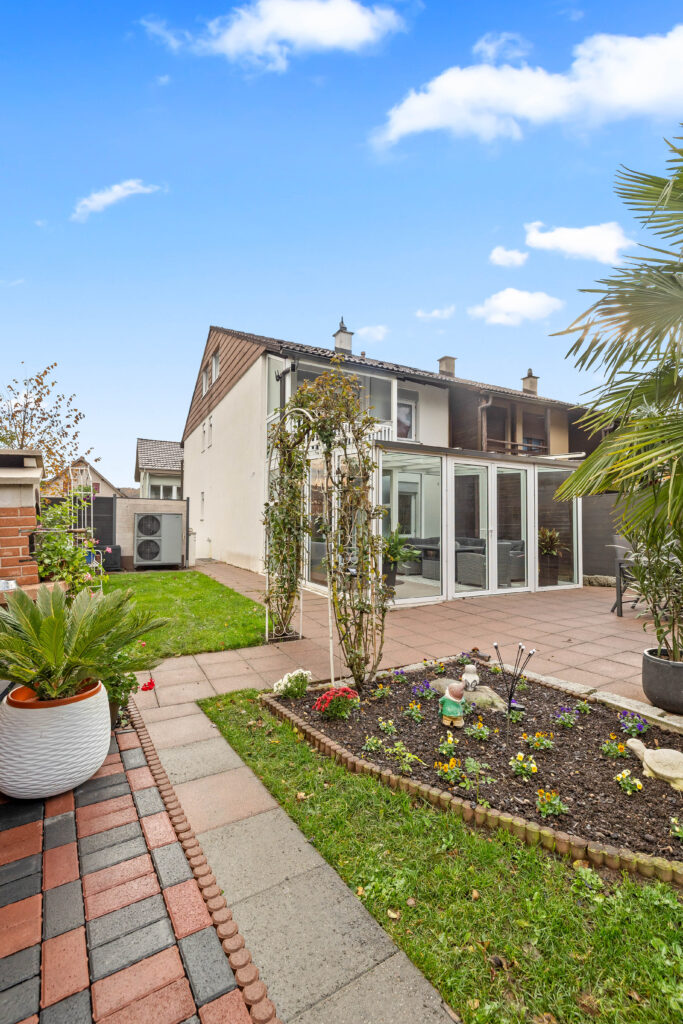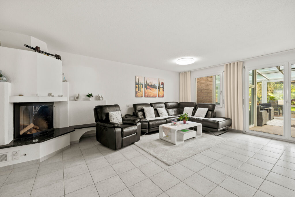 189 m² Nutzfläche, heller Wohn-/Essbereich mit Cheminée, grosse Küche, Einliegerwohnung, gepflegter Garten mit Fernsicht. Zwei Garagenplätze und zusätzliche Baulandreserve inklusive.