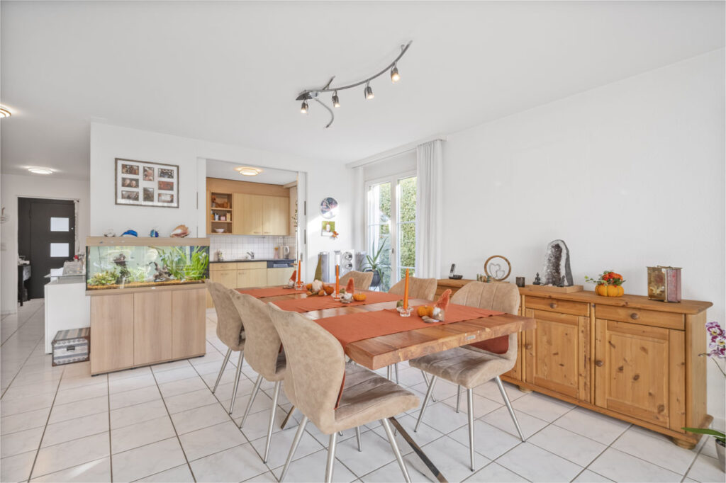 Pfäffikon: Charmantes Reiheneinfamilienhaus (130 m²) mit 3.5 Zimmern, Wohn-/Essbereich mit Schwedenofen, Küche mit Essplatz, Bad/WC mit Wäscheturm, Balkon mit Seesicht. Keller, Technik- & Heizungsraum.
