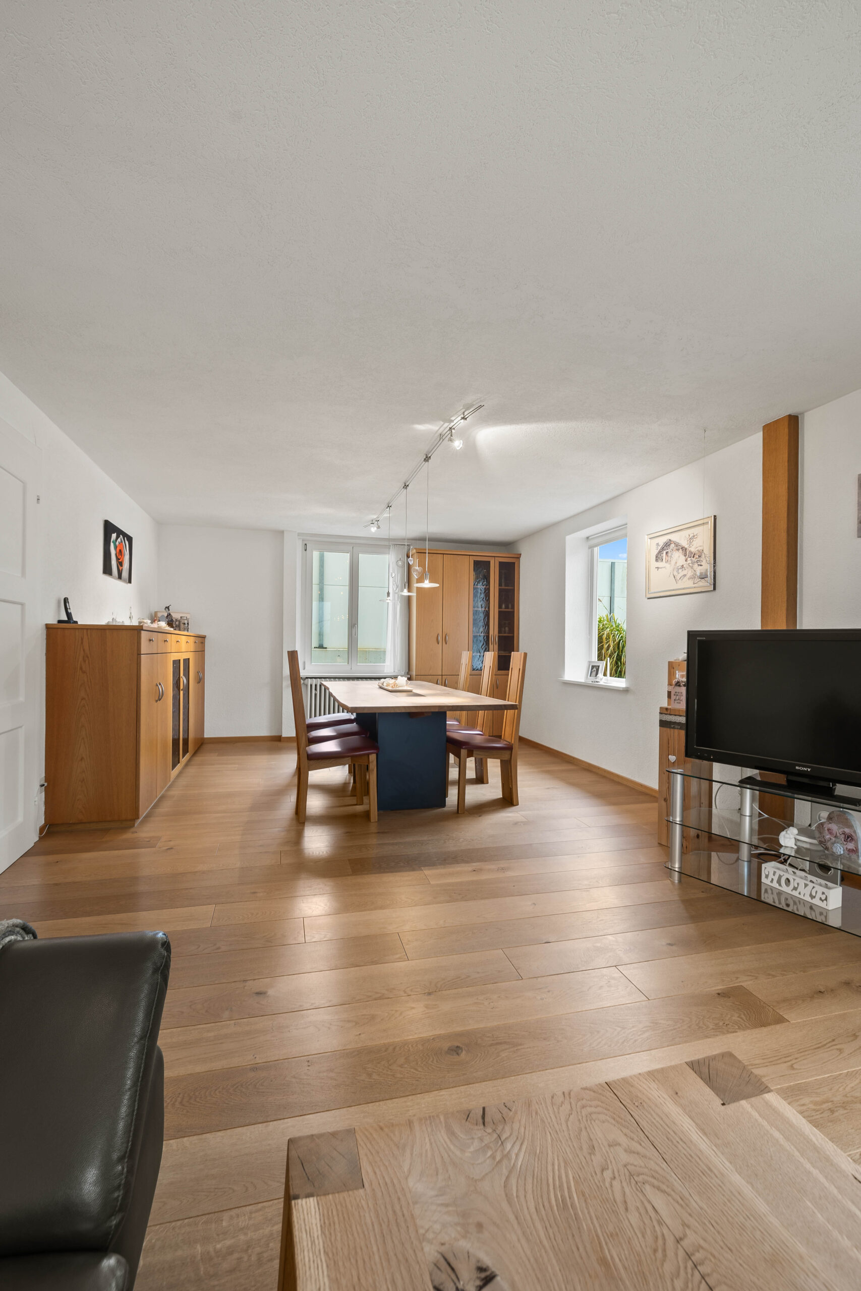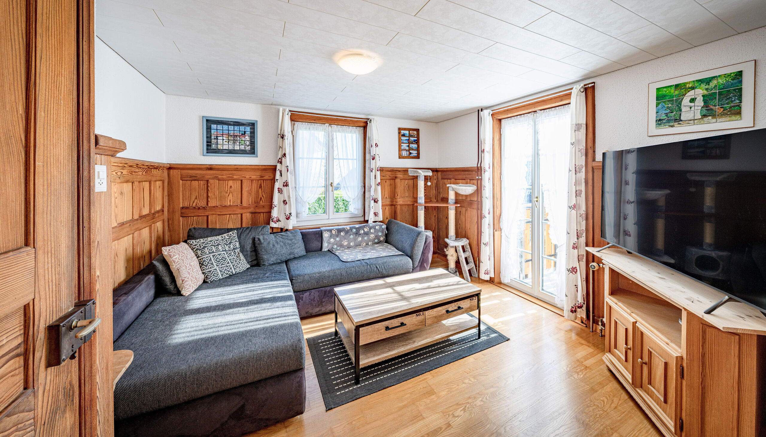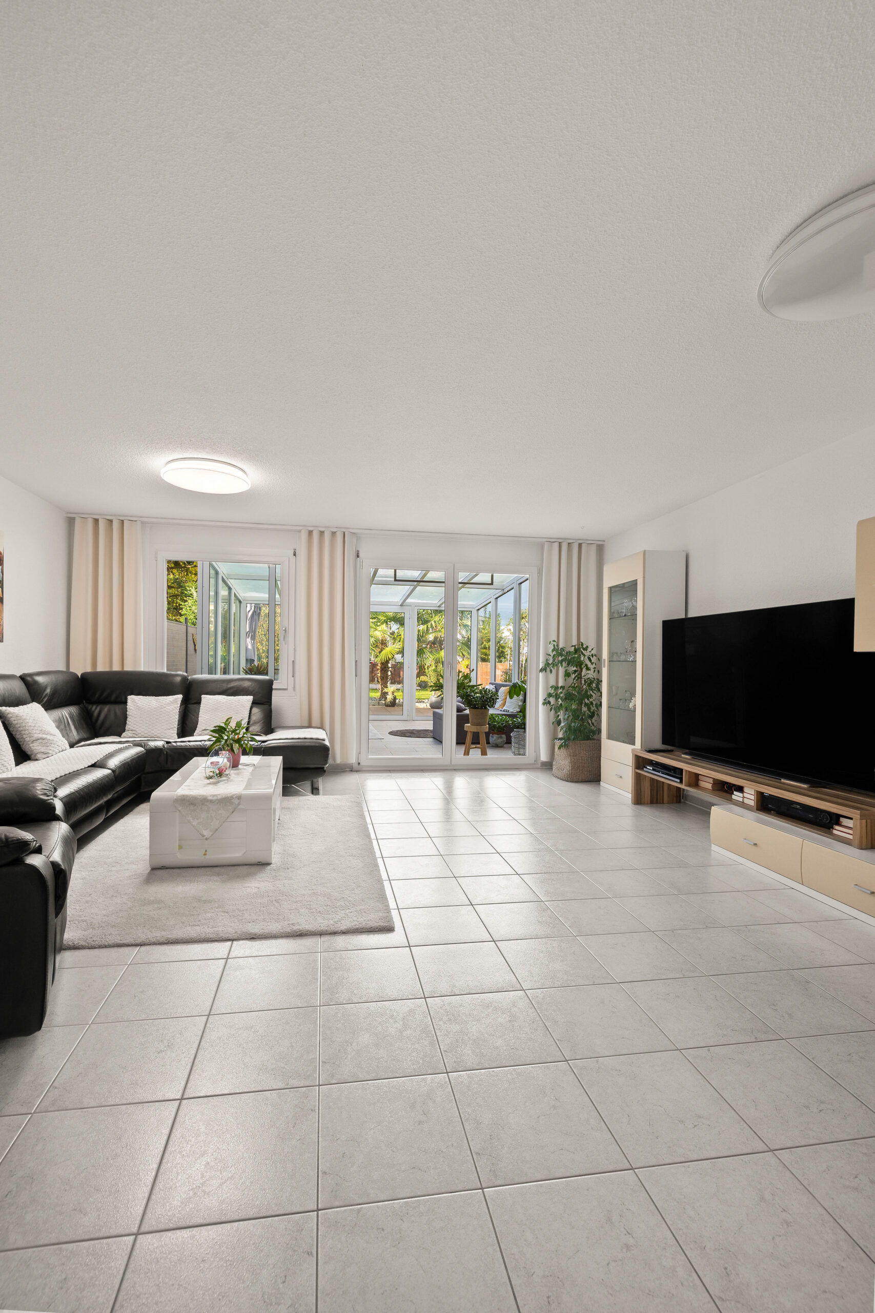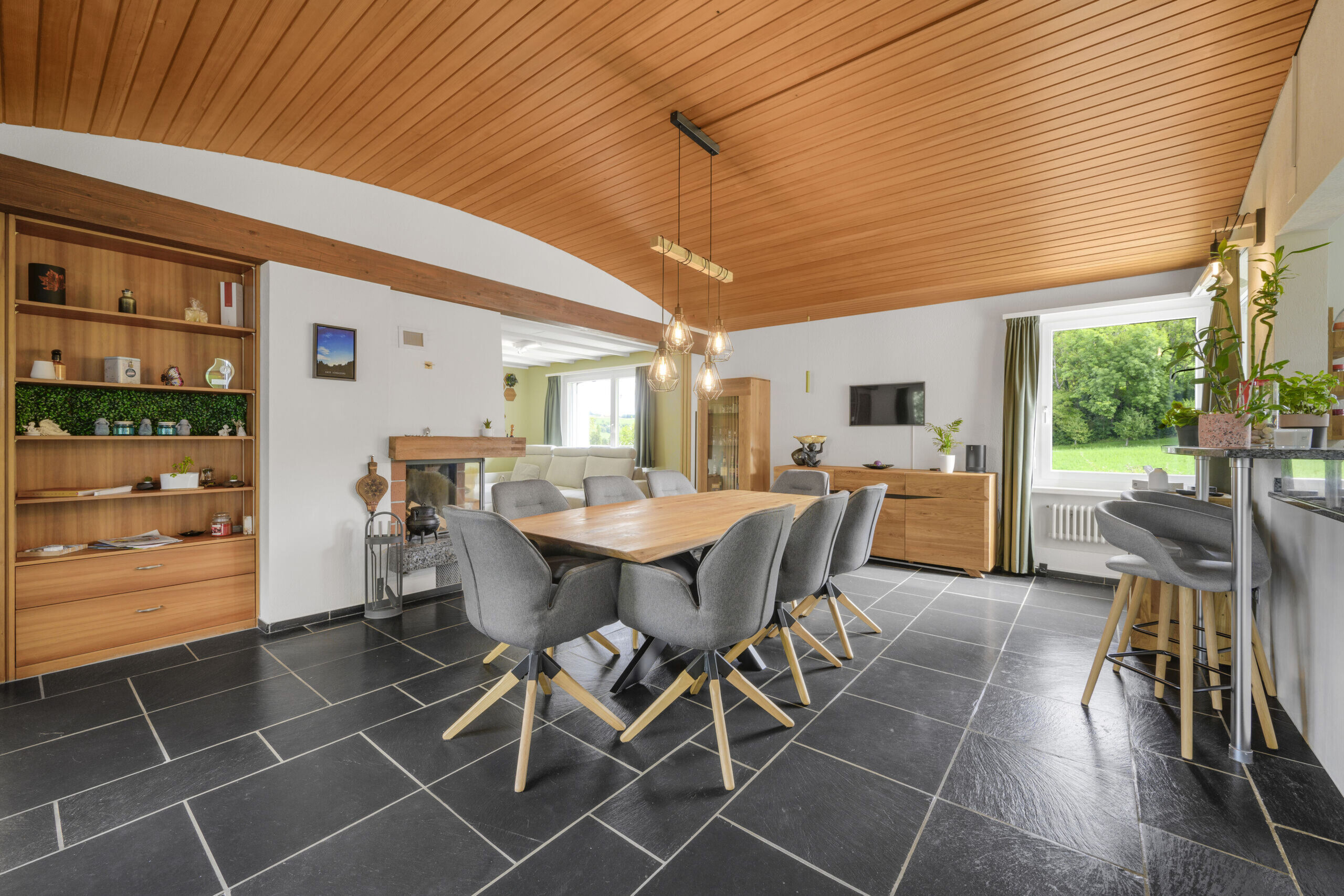 189 m² Nutzfläche, heller Wohn-/Essbereich mit Cheminée, grosse Küche, Einliegerwohnung, gepflegter Garten mit Fernsicht. Zwei Garagenplätze und zusätzliche Baulandreserve inklusive.