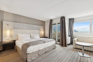 Chambre d'hôtel exclusive au 16ème étage de l'Hôtel Mona à Montreux - directement sur le lac Léman. Chambre moderne avec salle&de&toilette, balcon avec vue sur le lac, gestion hôtelière et avantages attractifs pour les propriétaires
