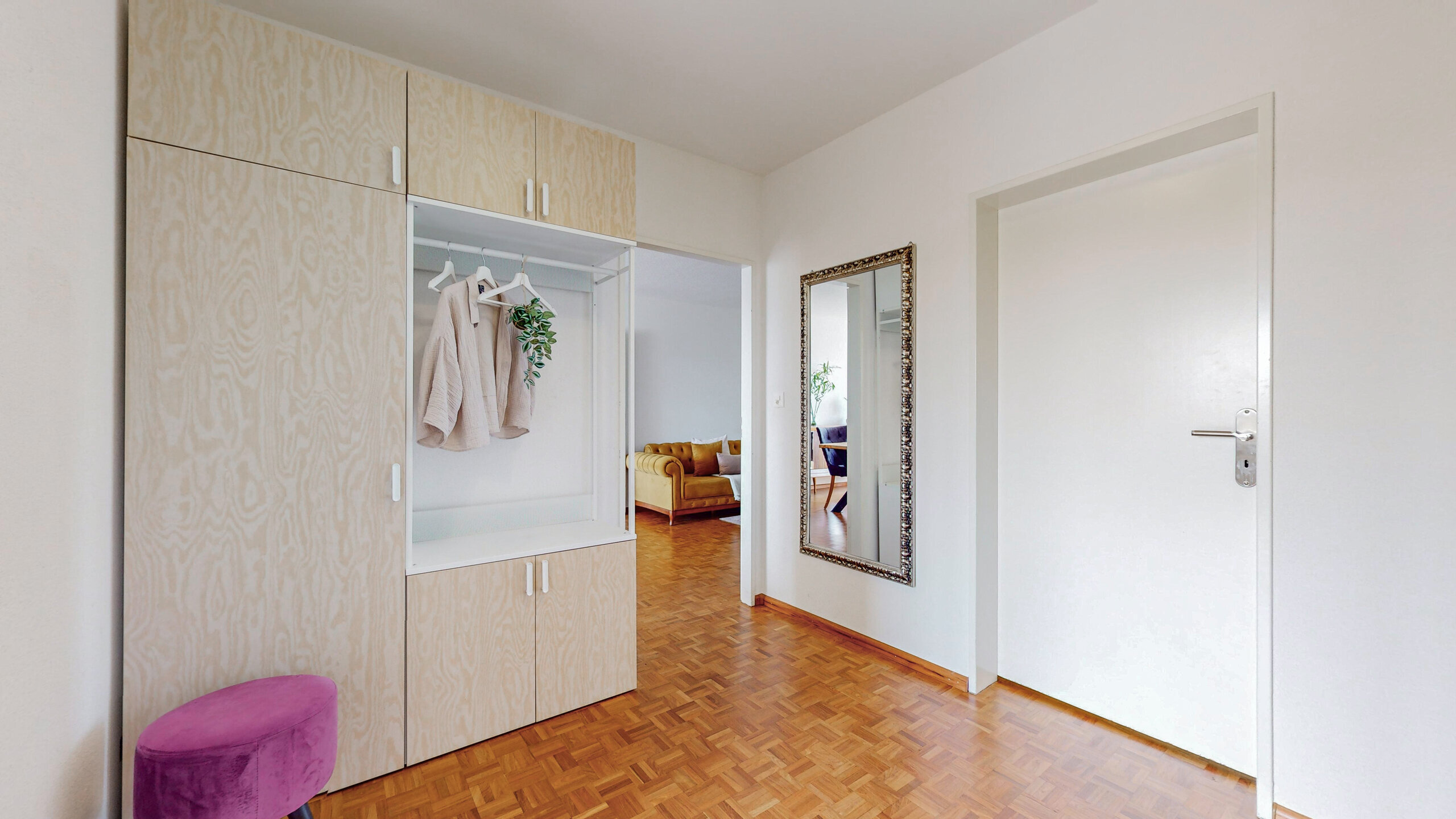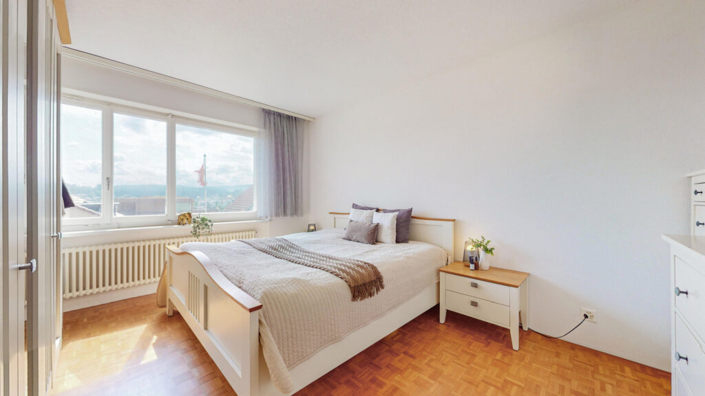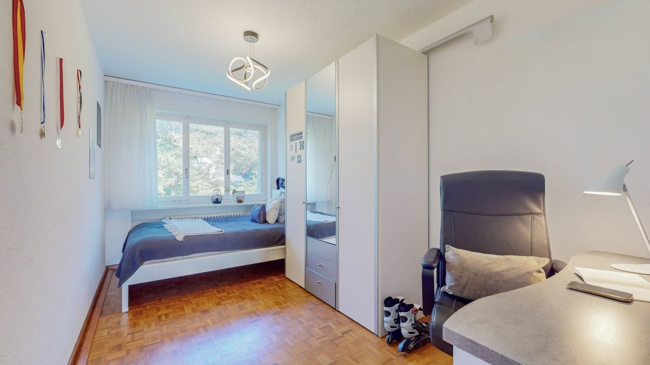 Das Herzstück ist der grosszügige Wohn- und Essbereich, der dank direktem Zugang zum überdachten Balkon mit Sonnensegel eine helle und einladende Wohnatmosphäre schafft. Hier lässt es sich wunderbar entspannen und gemütliche Stunden im Freien geniessen.