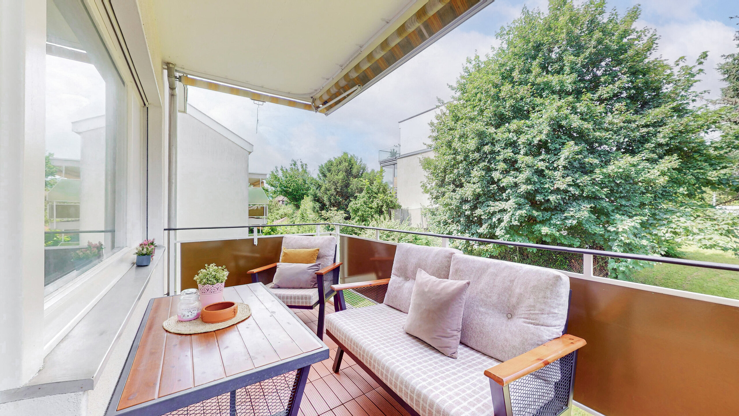 • Überdachter Balkon mit Sonnensegel
