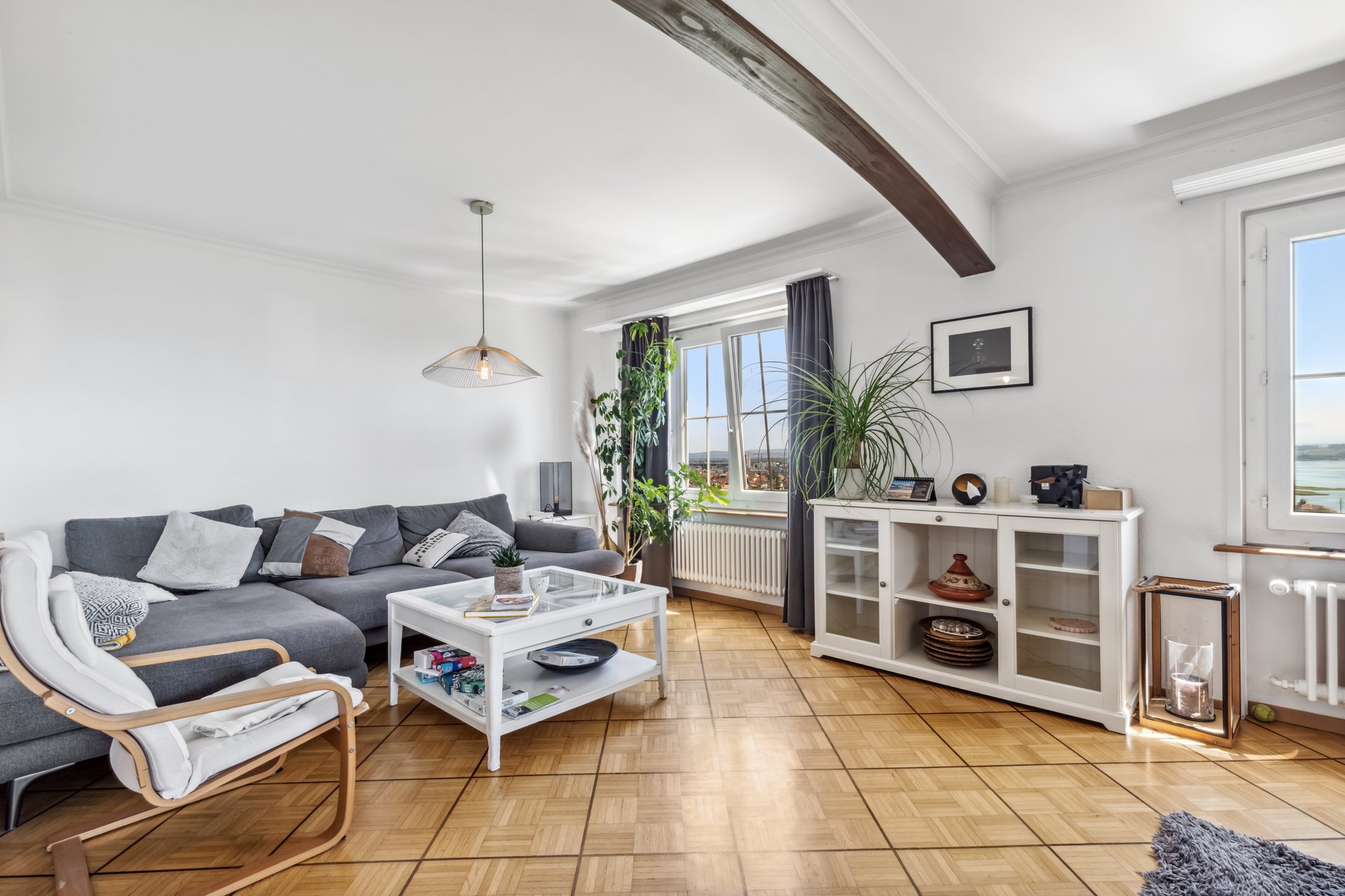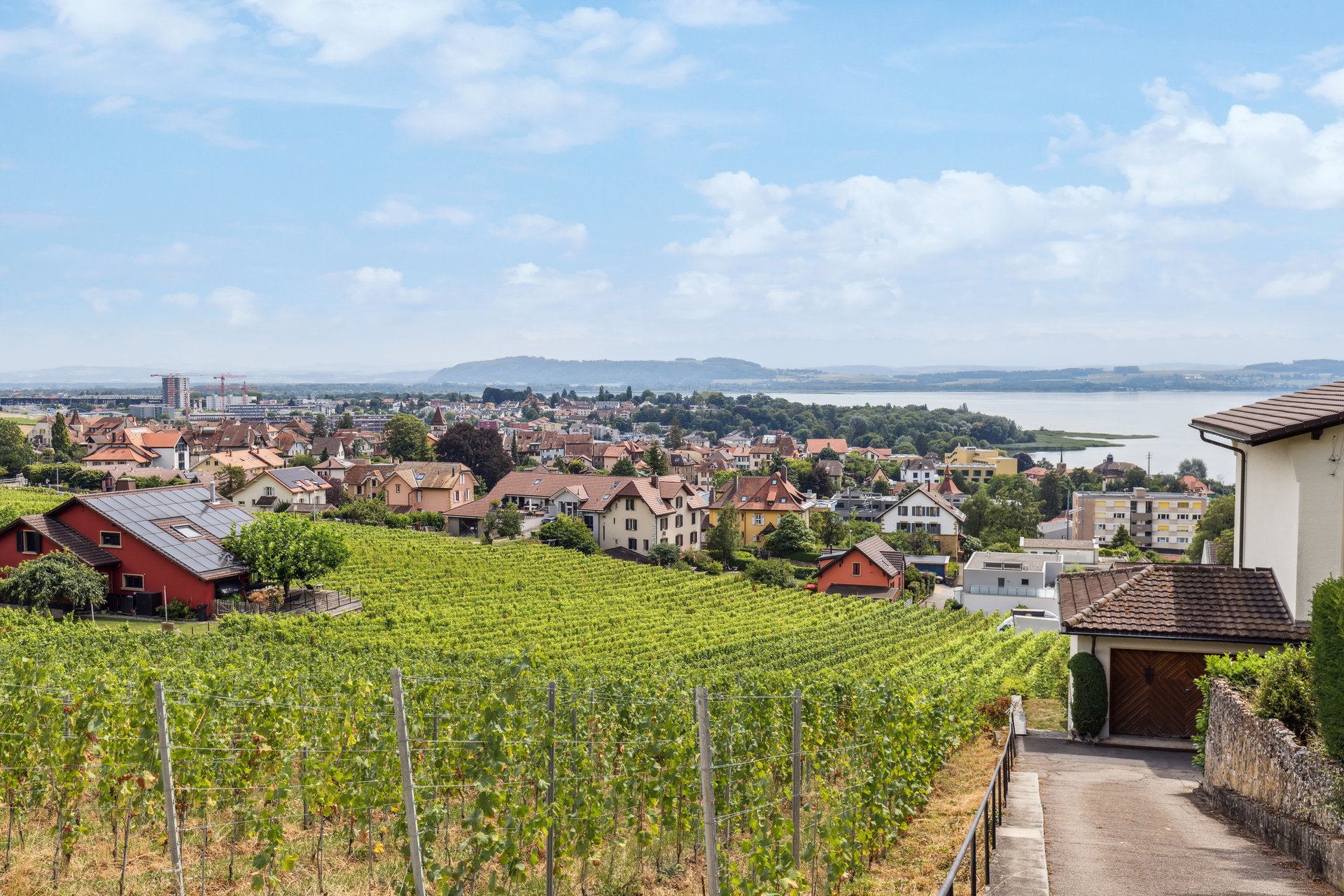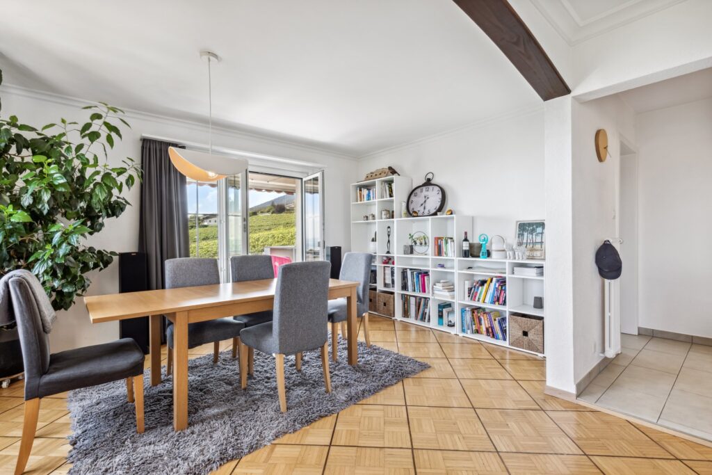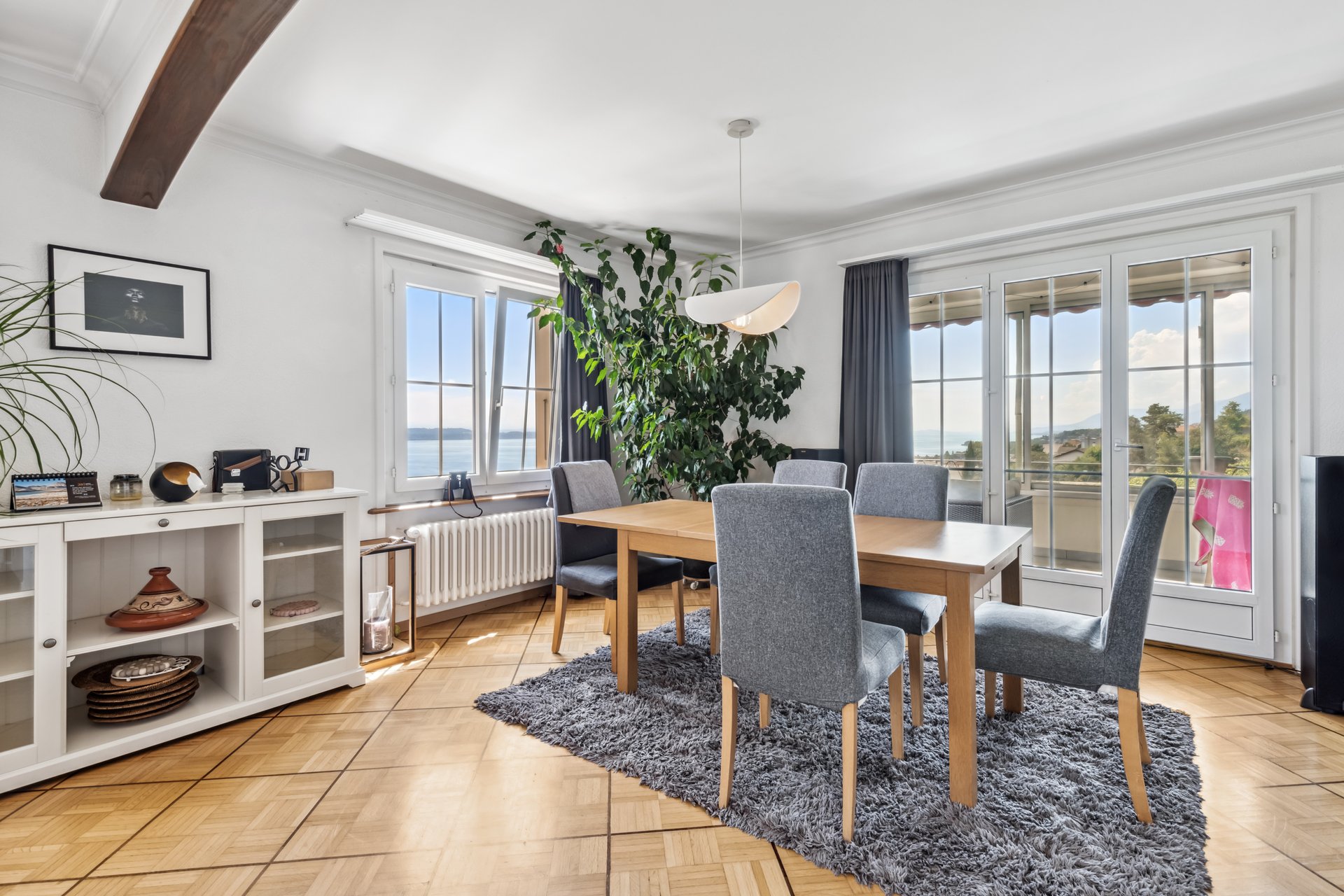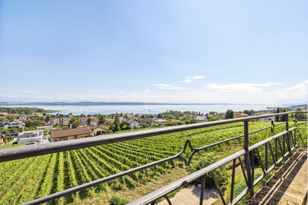 Besonders eindrucksvoll ist der Ausblick auf die umliegenden Weinberge und den Neuenburgersee – ein Panorama, das den Alltag verschönert und für echte Lebensqualität sorgt. Das schöne Esszimmer mit direktem Zugang zur Terrasse oder zum Balkon schafft ein einladendes Ambiente für Familie und Gäste.