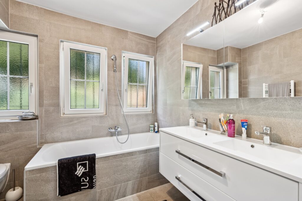 Die Liegenschaft verfügt über gepflegte Badezimmer in allen Etagen: mit Badewanne, Dusche und WC in den Obergeschossen sowie mit WC und Badewanne im Erdgeschoss. Der grosszügige Garten mit Terrasse bietet Raum für Entspannung, Gartenarbeit oder gesellige Momente im Freien.