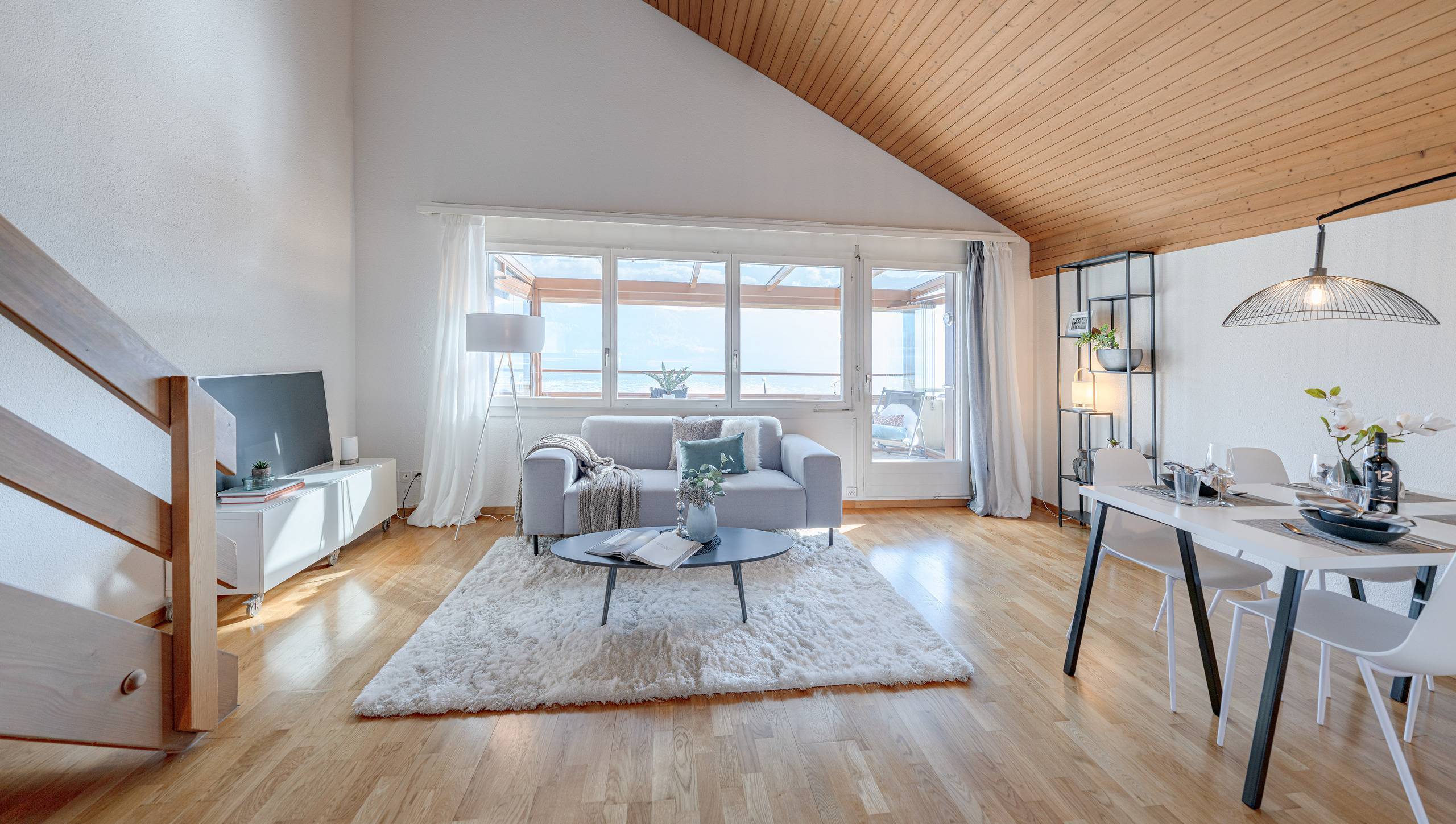 Der Wohn- und Essbereich beeindruckt mit überdurchschnittlich hohen Decken, einem gemütlichen Cheminée und direktem Zugang zum Wintergarten. Von hier eröffnet sich eine spektakuläre See- und Bergsicht, die den Wohnraum zu jeder Jahreszeit erweitert.