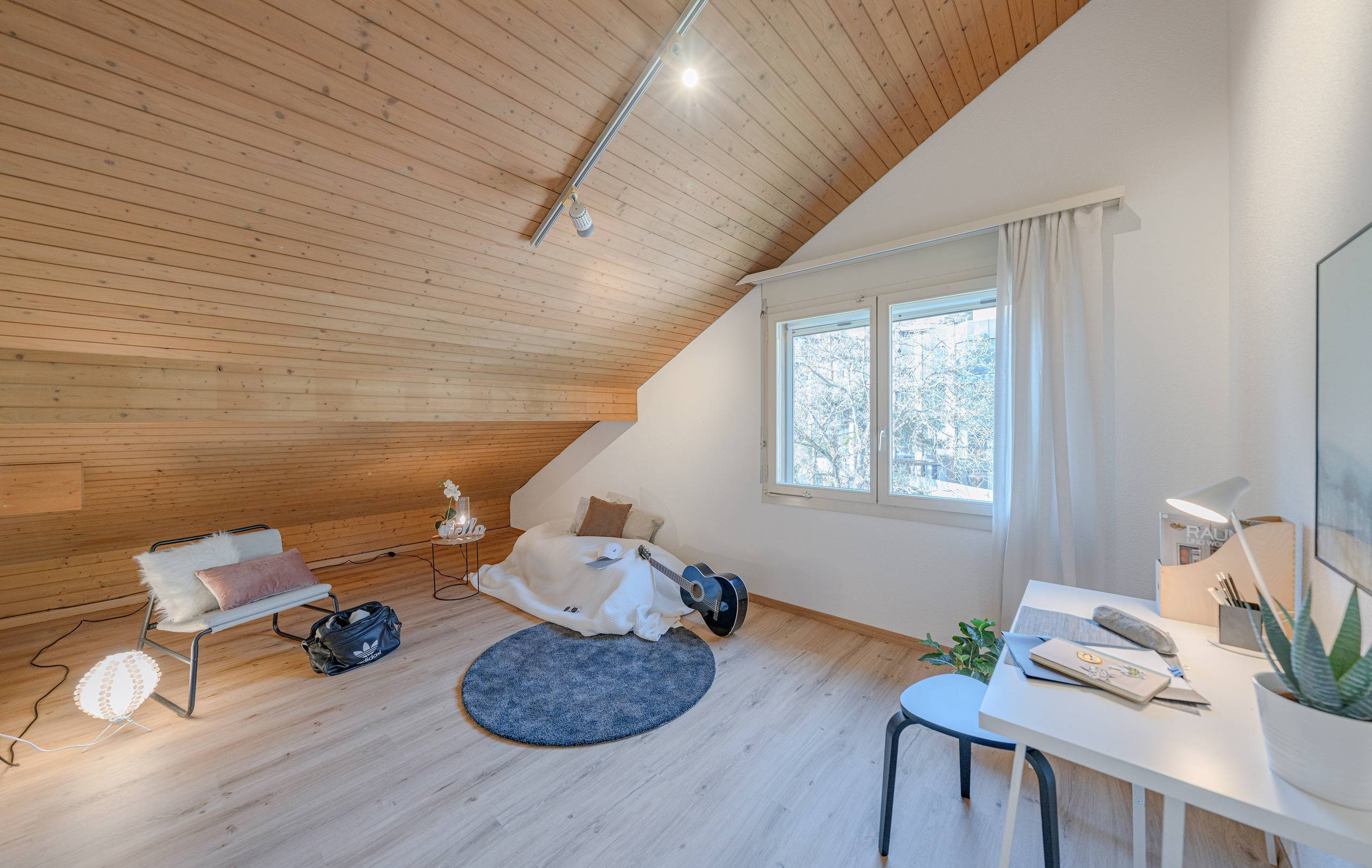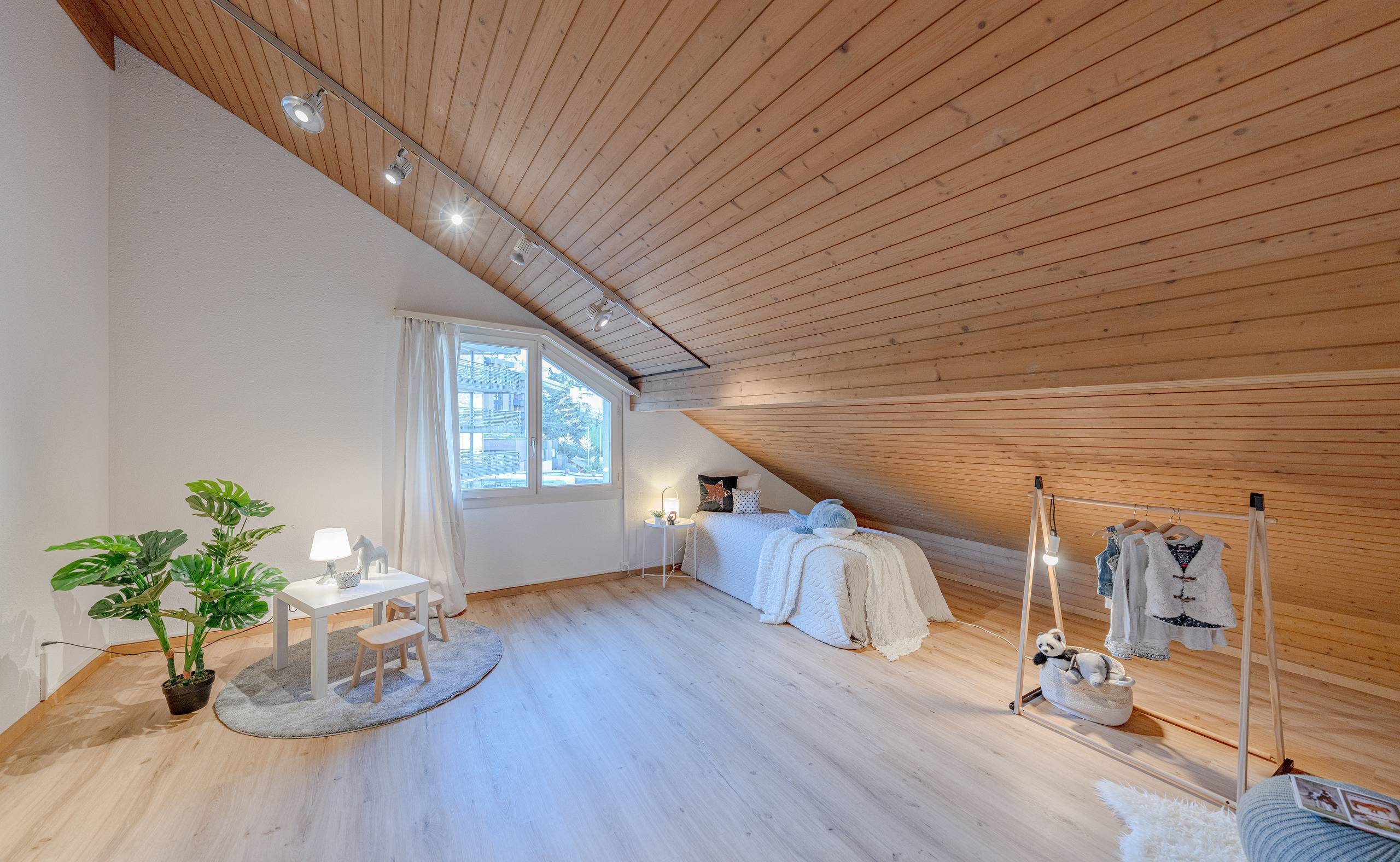 Ein weiteres Highlight ist der Balkon mit Blick auf die Rigi, ergänzt durch den Wintergarten mit freier Sicht auf See und Berge. Rund ums Haus stehen Rasenflächen und Spielbereiche zur Verfügung – perfekte Bedingungen für Familien mit Kindern.