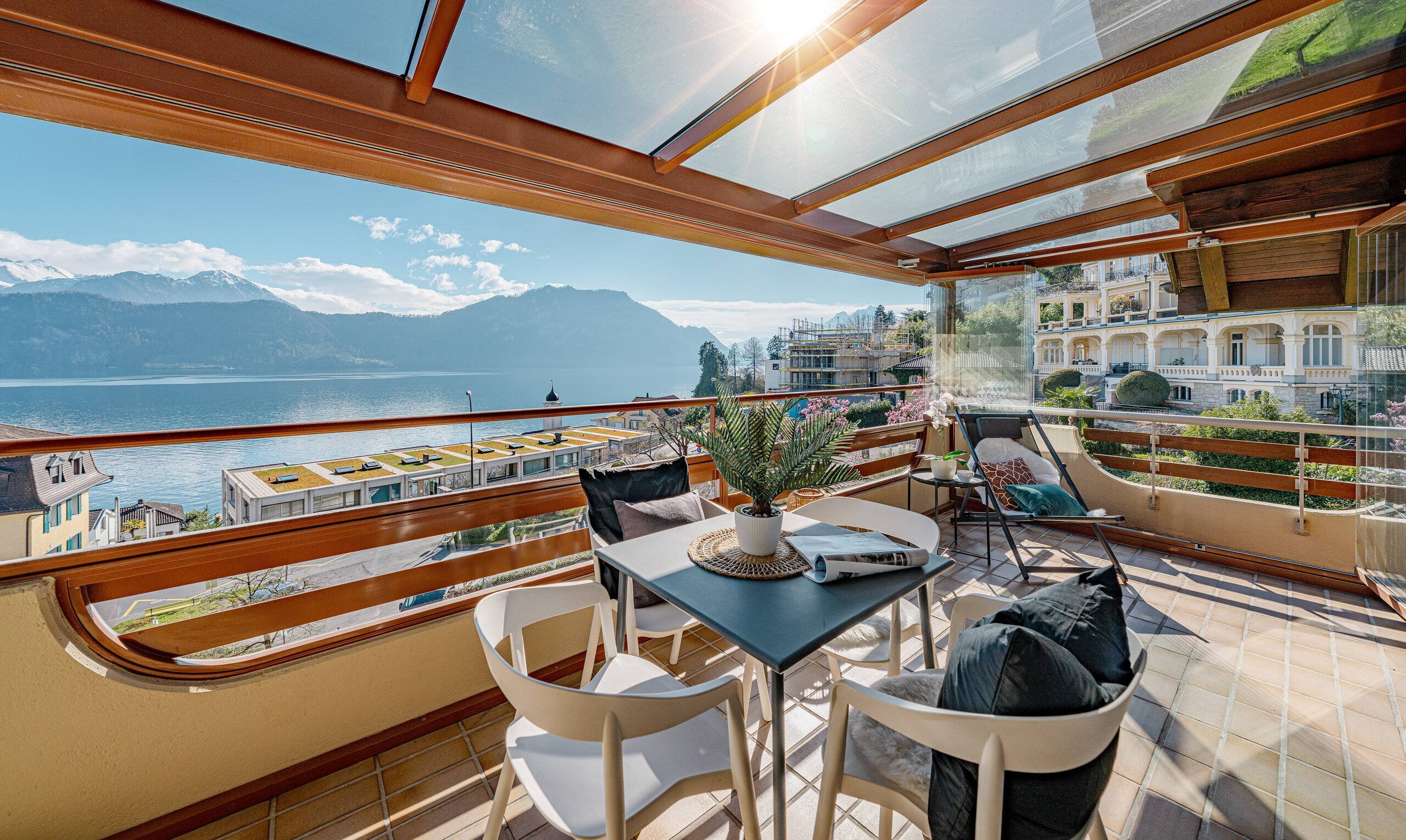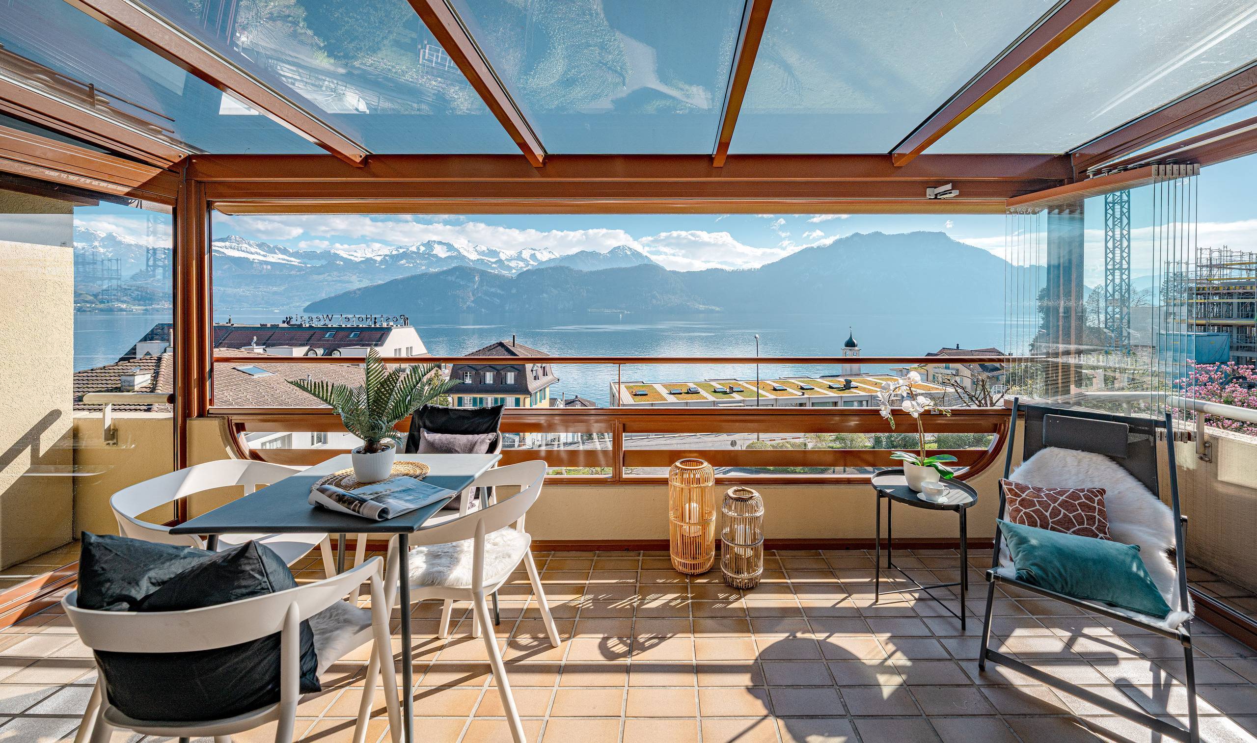 • Balkon und Wintergarten: Balkon mit Blick auf Rigi sowie Wintergarten mit atemberaubender See- und Bergsicht