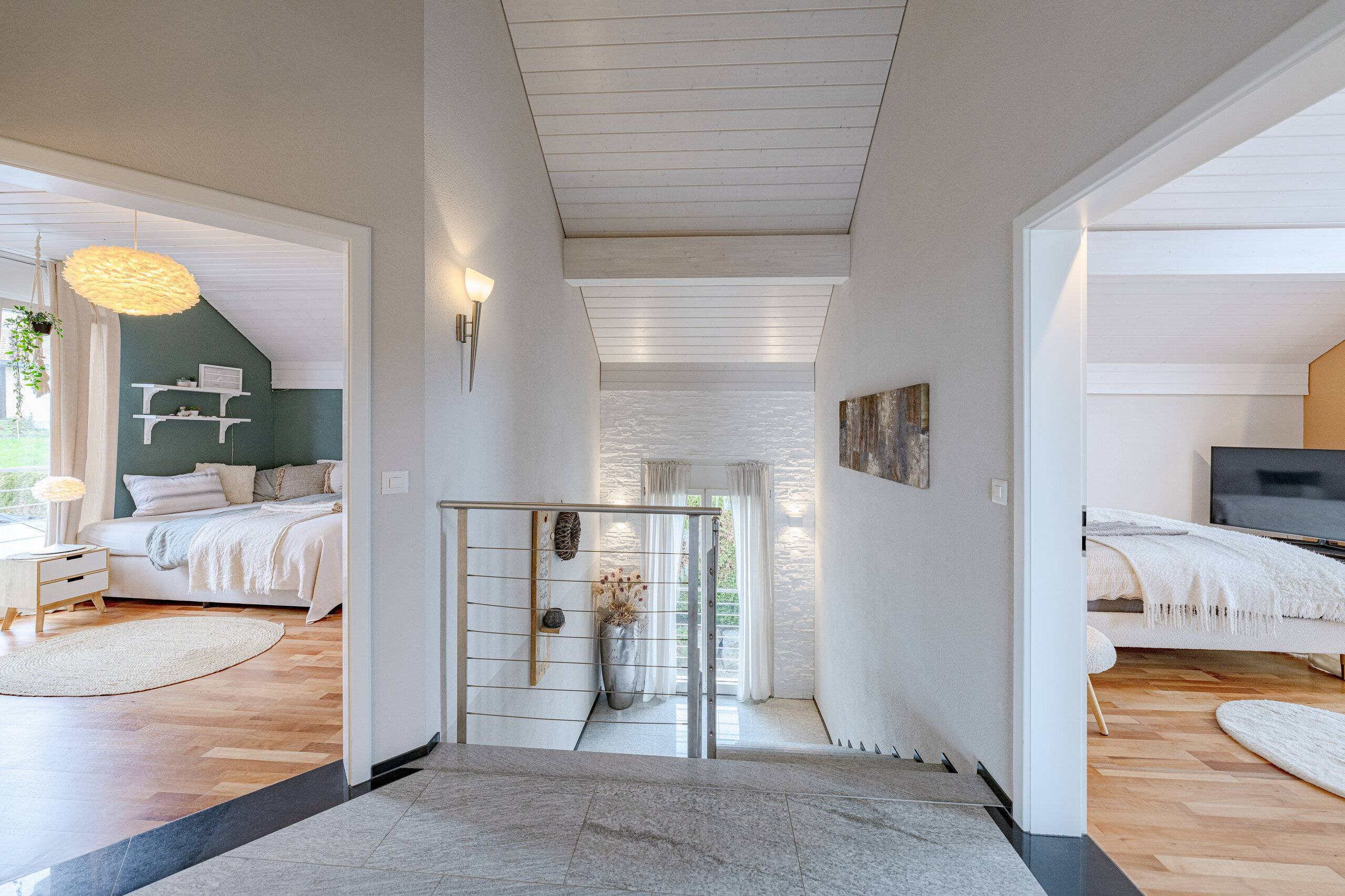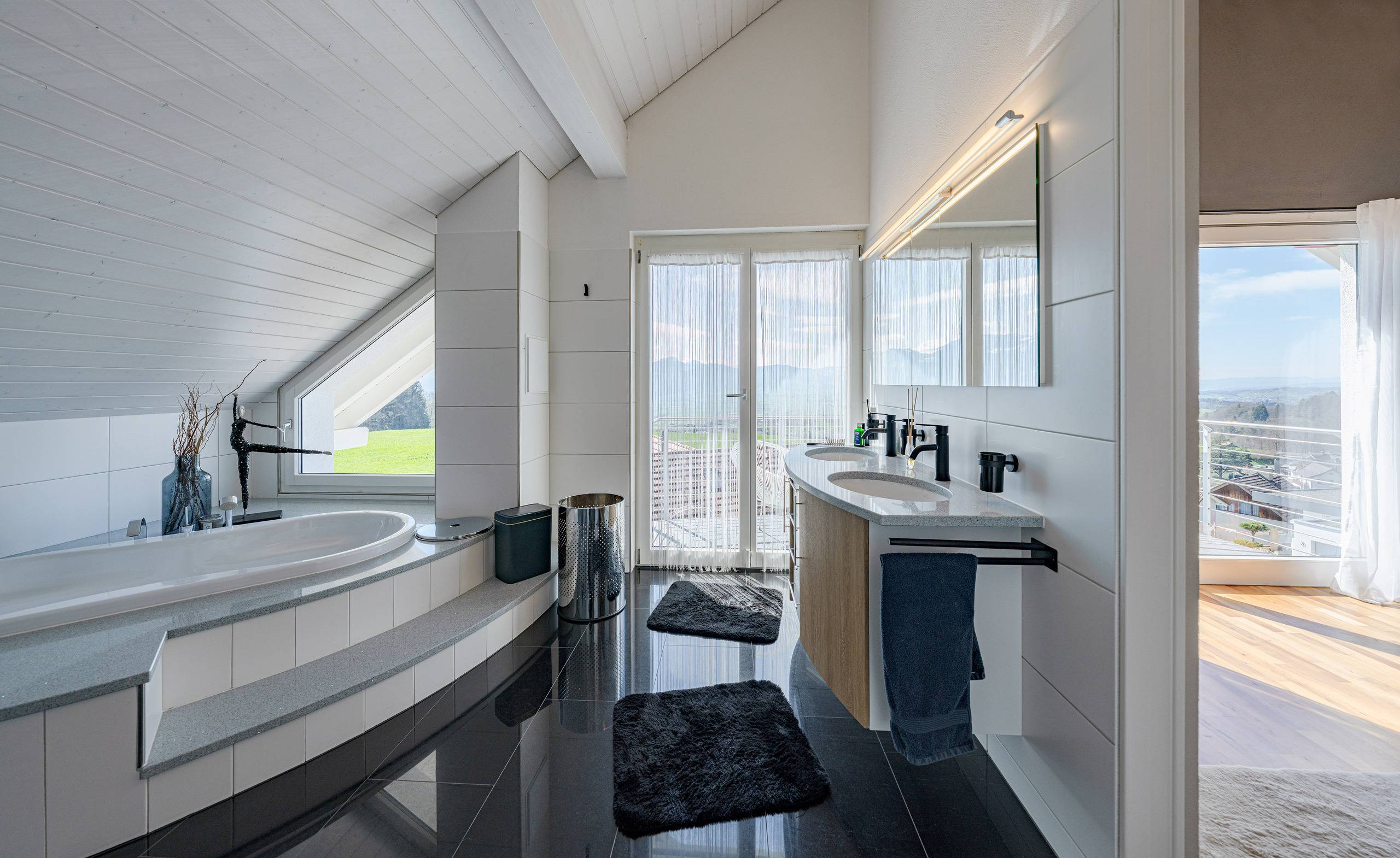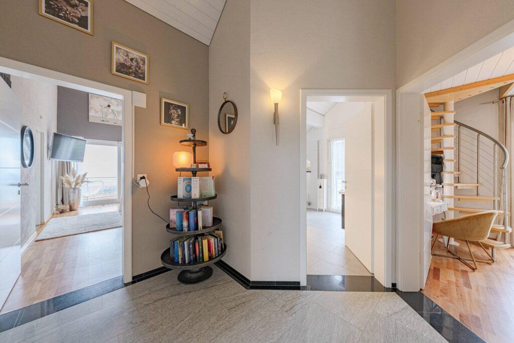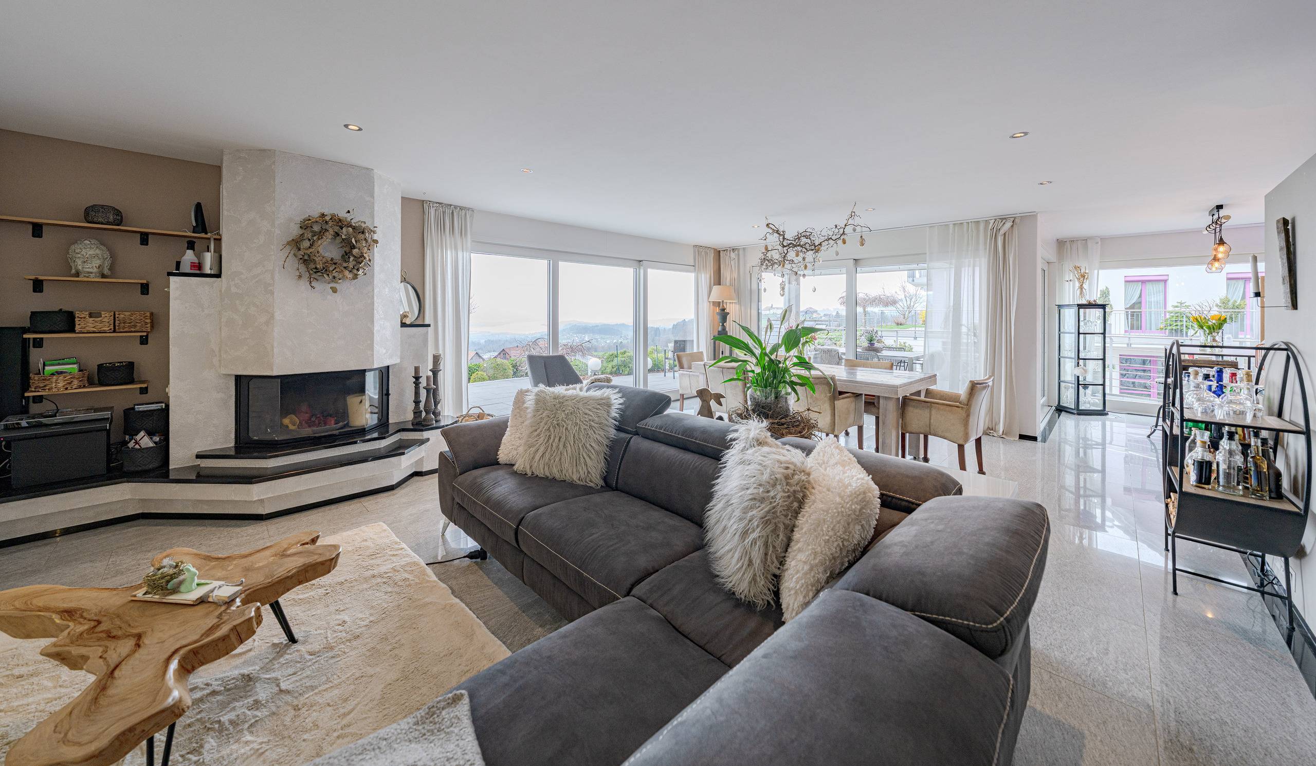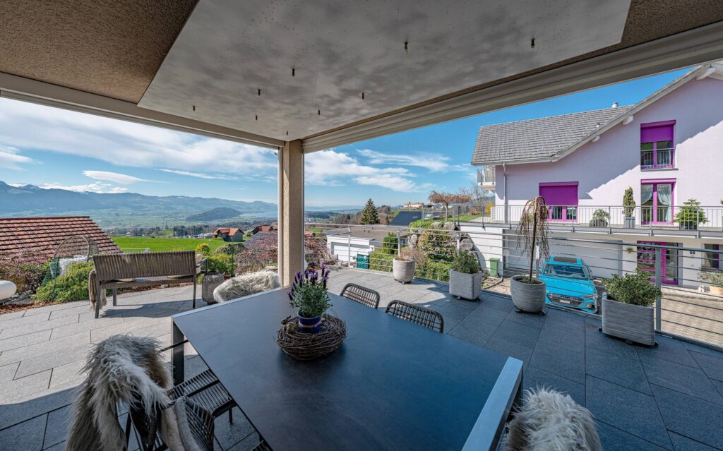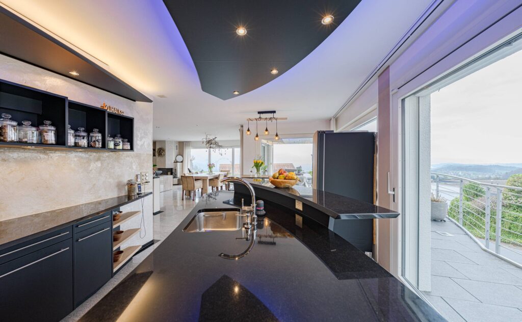Das Herzstück bildet der offene Wohn- und Essbereich mit Cheminée, der durch Helligkeit und Weitläufigkeit besticht. Von hier aus gelangt man direkt auf die rund 135 m² grosse Terrasse, die einen beeindruckenden Panoramablick auf See und Berge eröffnet. Die moderne, offene Küche mit Granitabdeckung fügt sich harmonisch ein und bietet sowohl Stauraum als auch Platz für gemeinsames Kochen.