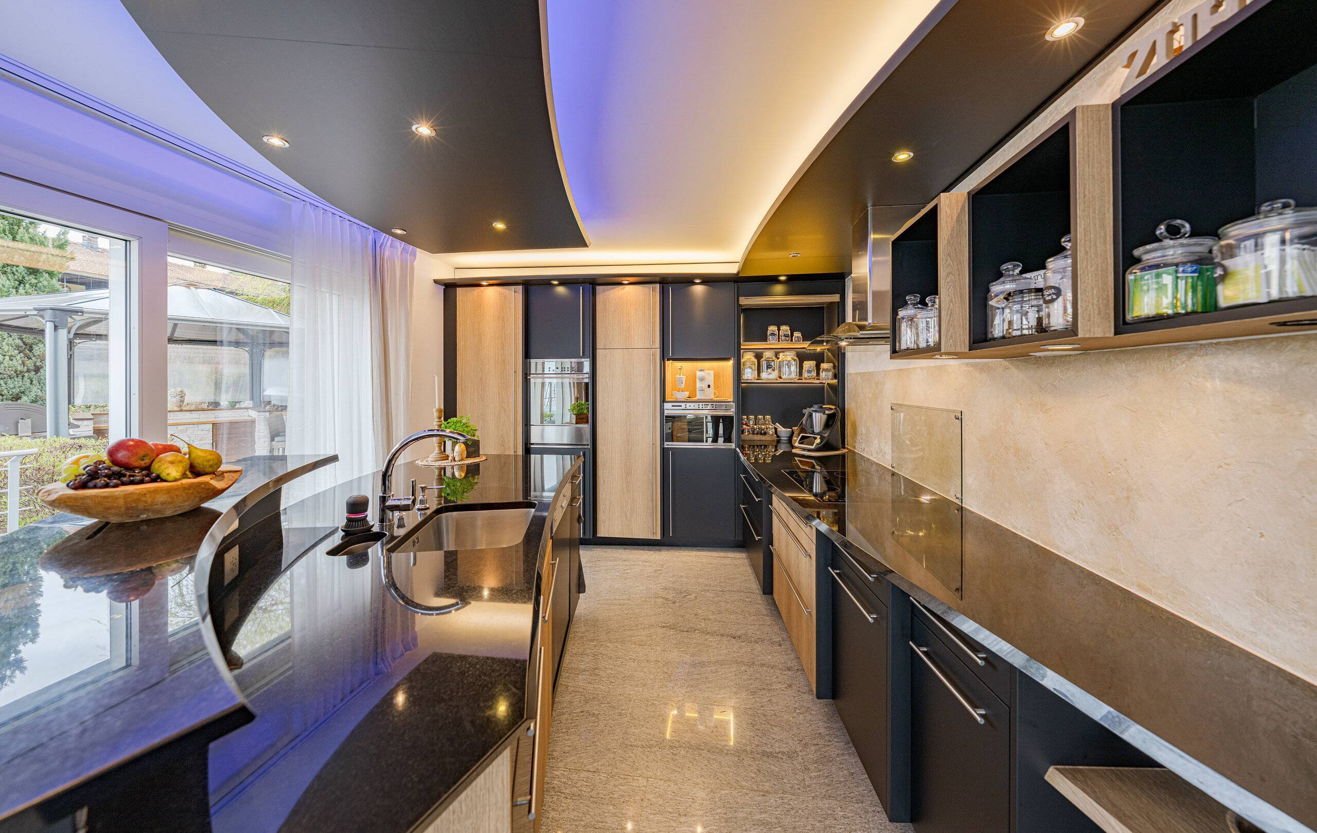 - Küche: Offene Küche mit Granitabdeckung und viel Stauraum