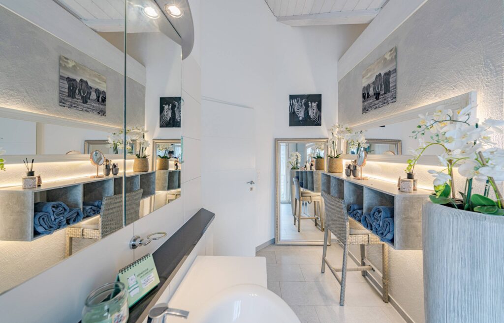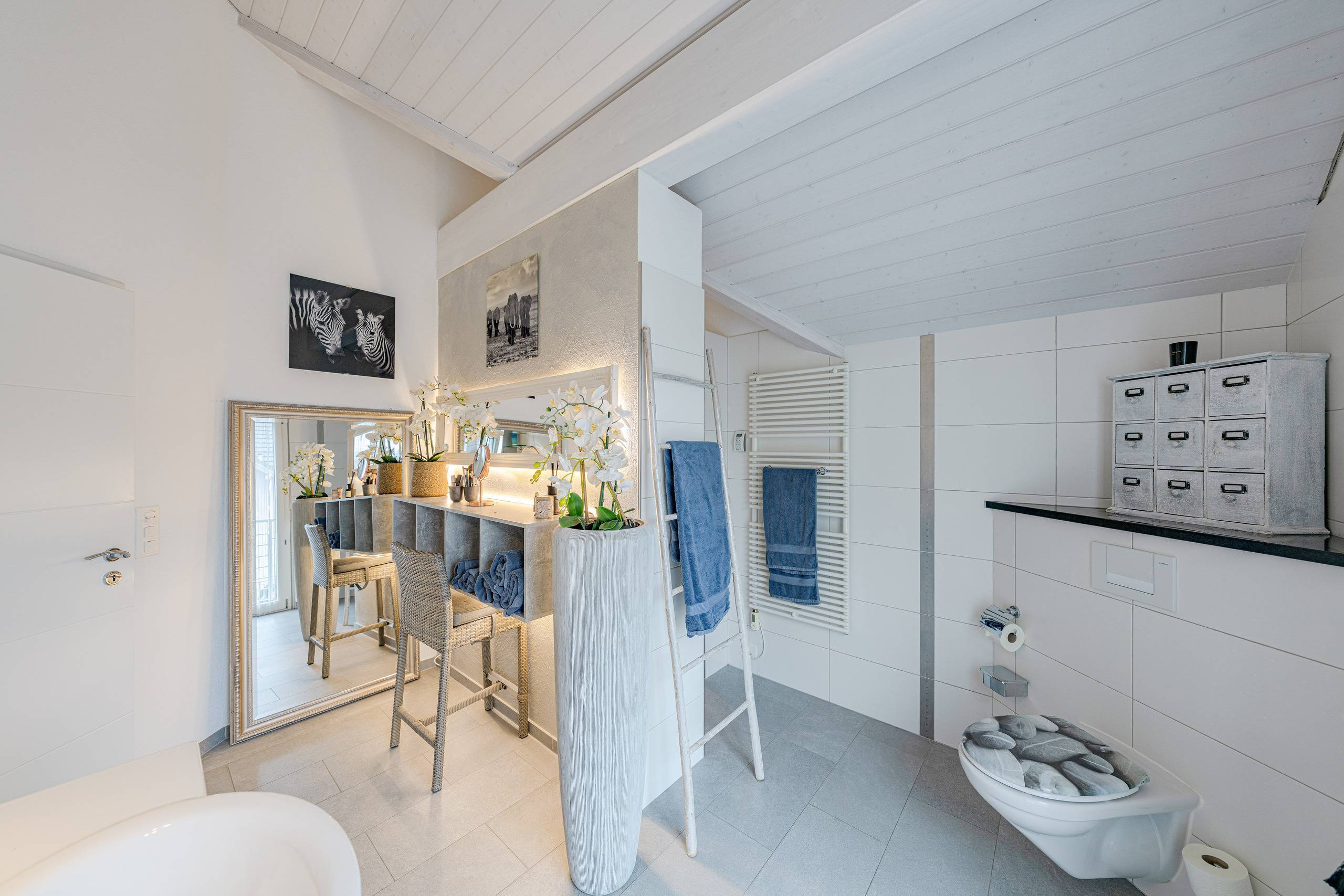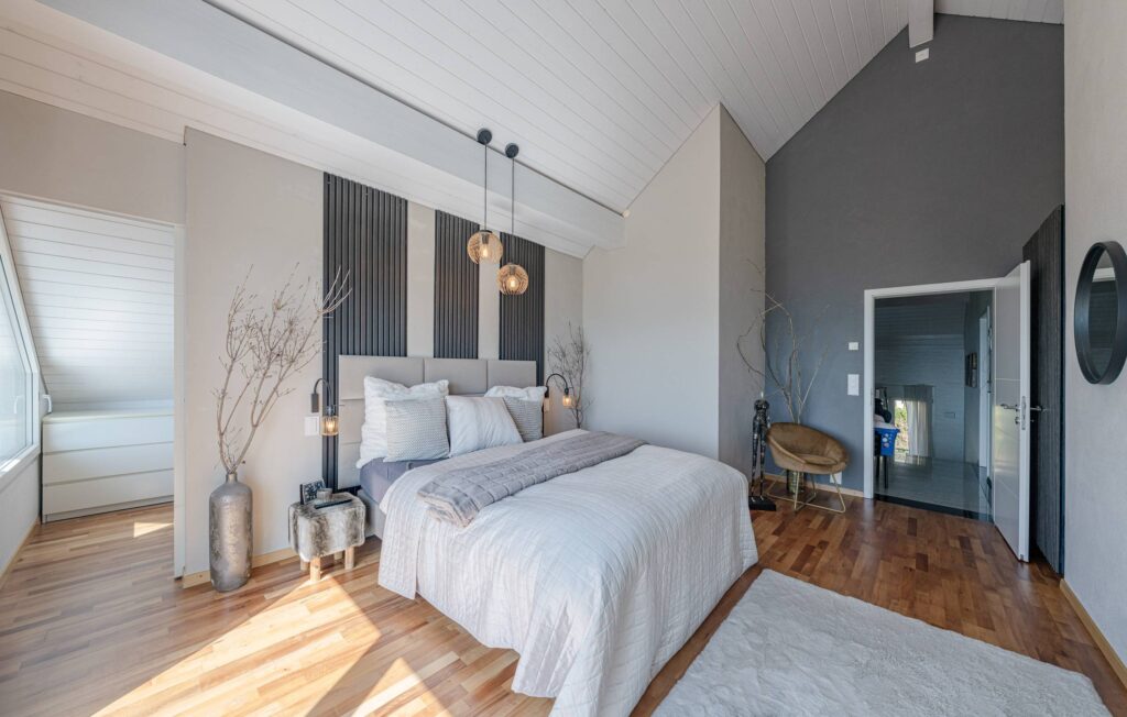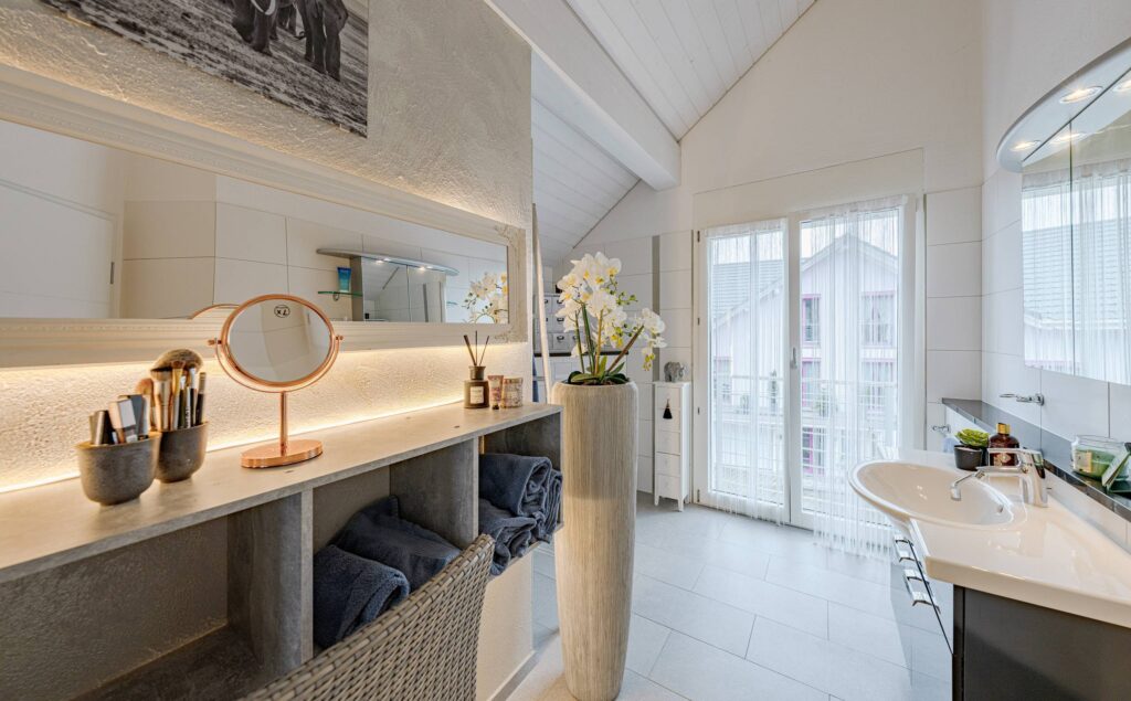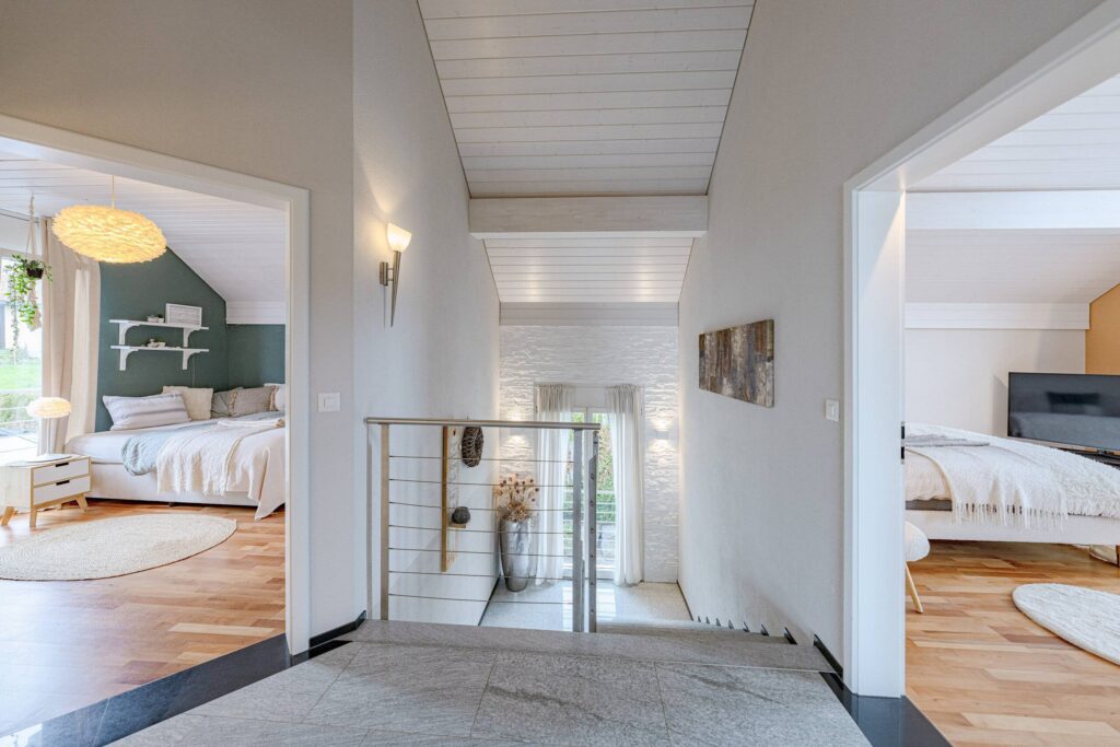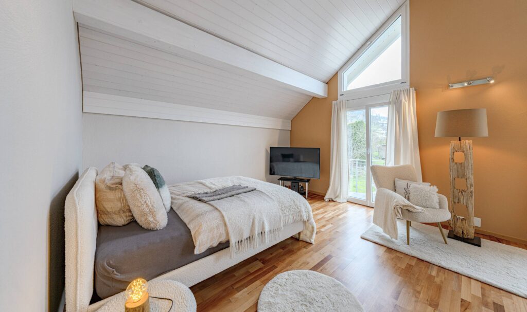 Mit drei komfortablen Nassbereichen – einem Bad/WC und zwei Bad/WC/Dusche – ist das Haus bestens für Familien oder Gäste ausgestattet. Die grossen, hellen Zimmer mit hohen Decken unterstreichen das luftige Raumgefühl und bieten vielseitige Nutzungsmöglichkeiten.