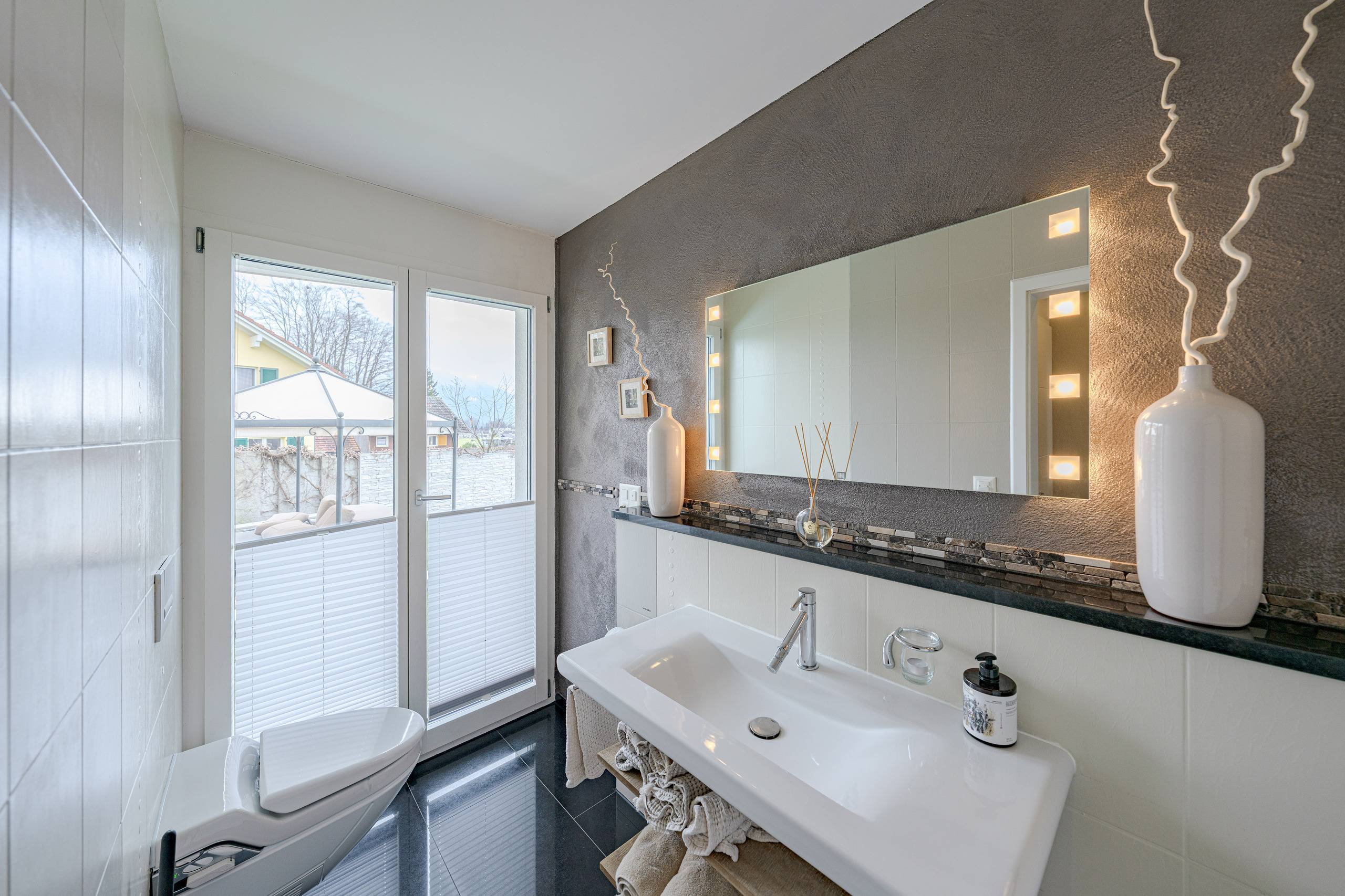 - Drei Moderne Nassbereiche: Ein Bad/WC sowie Zwei Bad/WC/Dusche