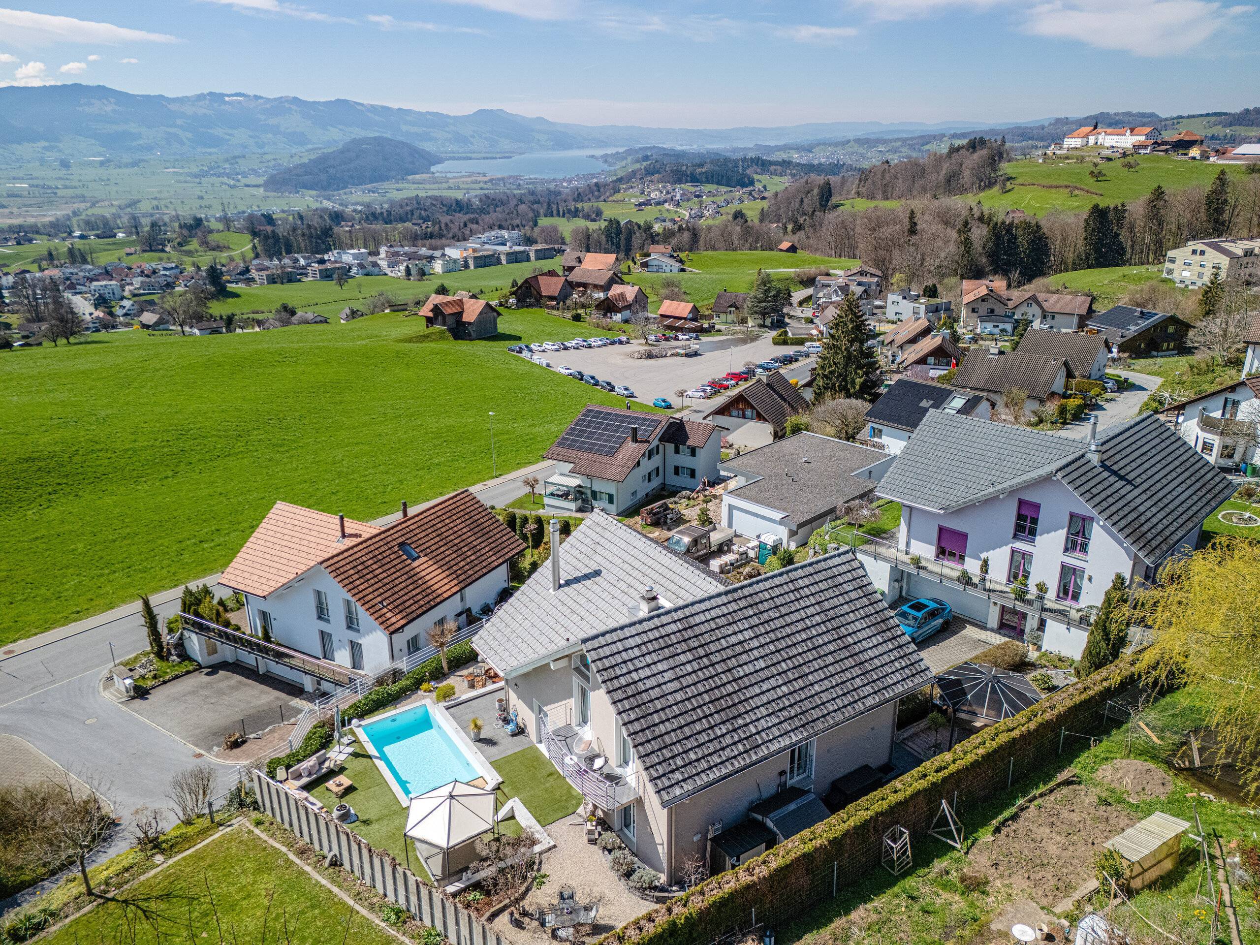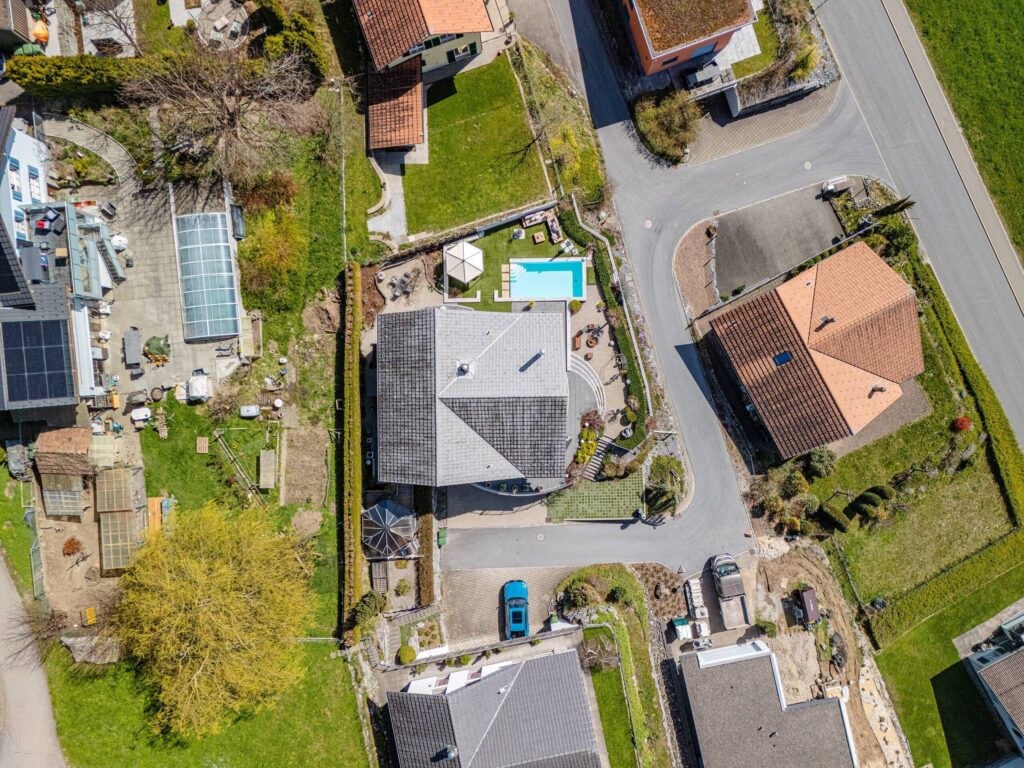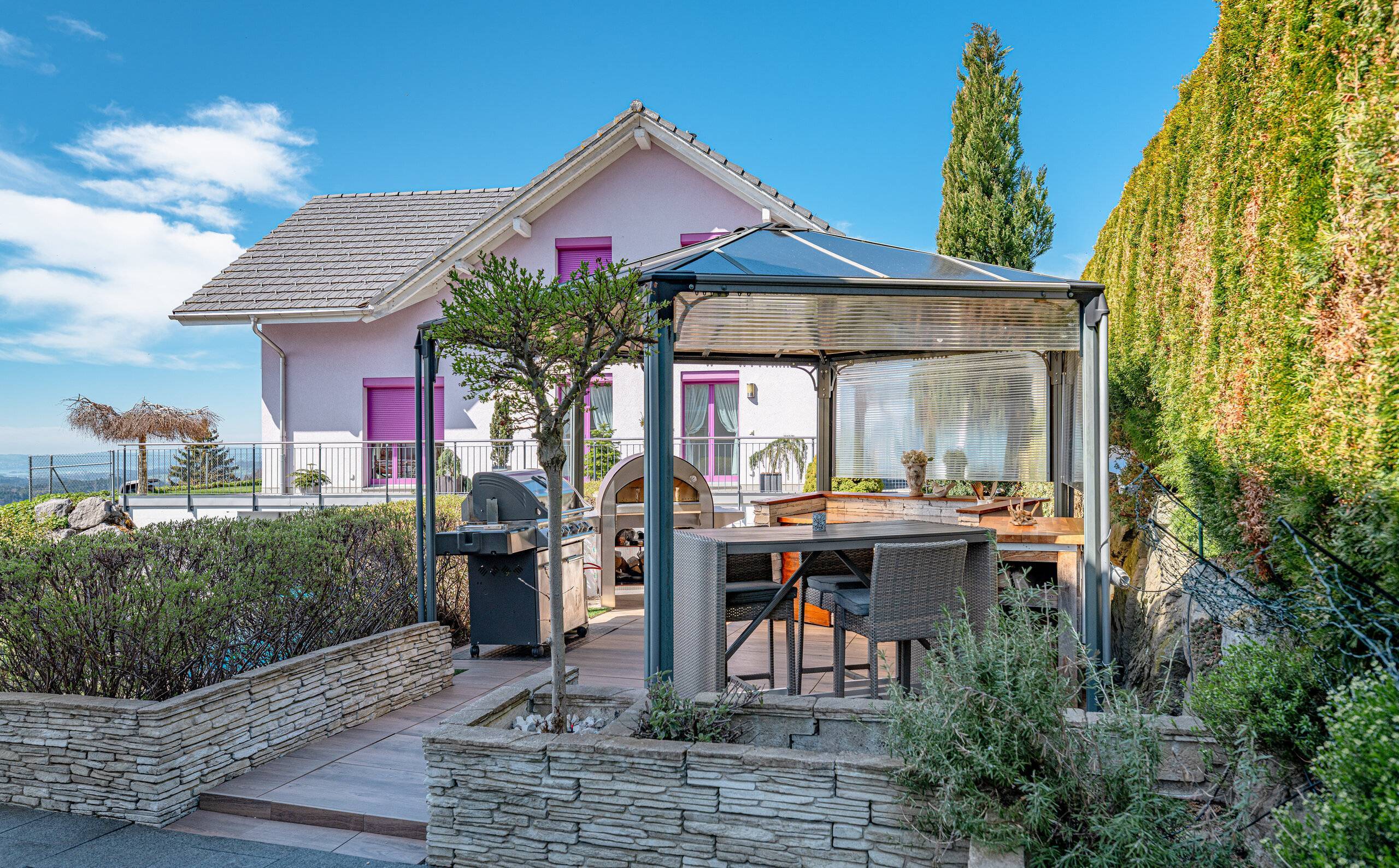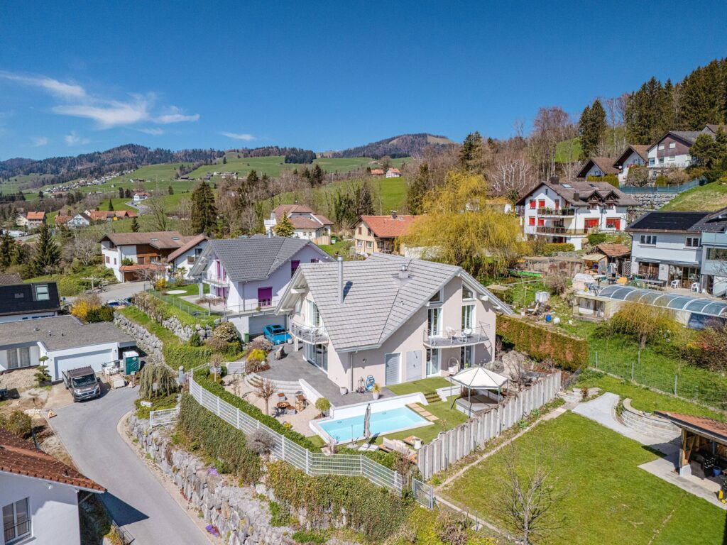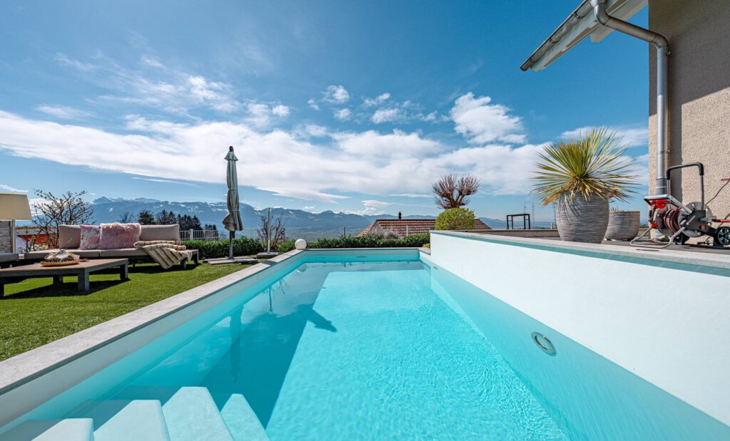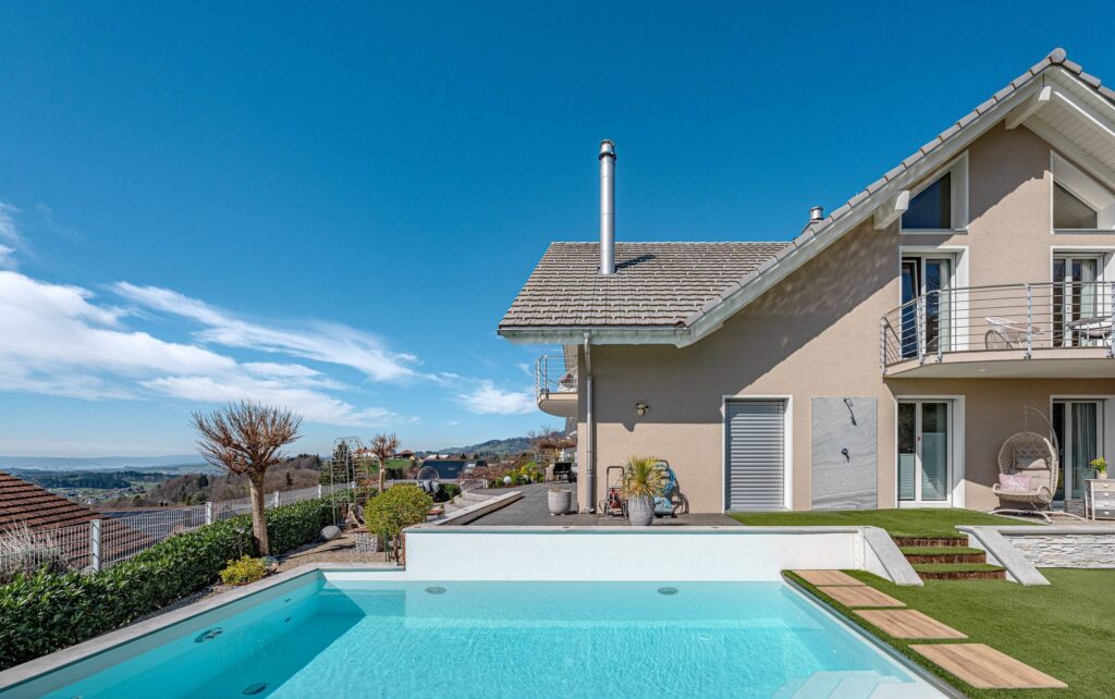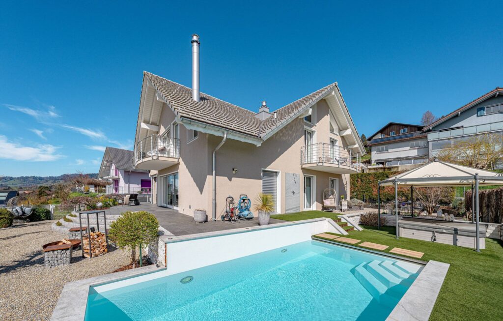 Der Aussenbereich ist ein besonderes Highlight: Eine gepflegte Grünfläche, ein Schwimmbad, ein Whirlpool sowie eine elegante Outdoor-Küche schaffen ideale Voraussetzungen für entspannte Stunden und gesellige Abende.