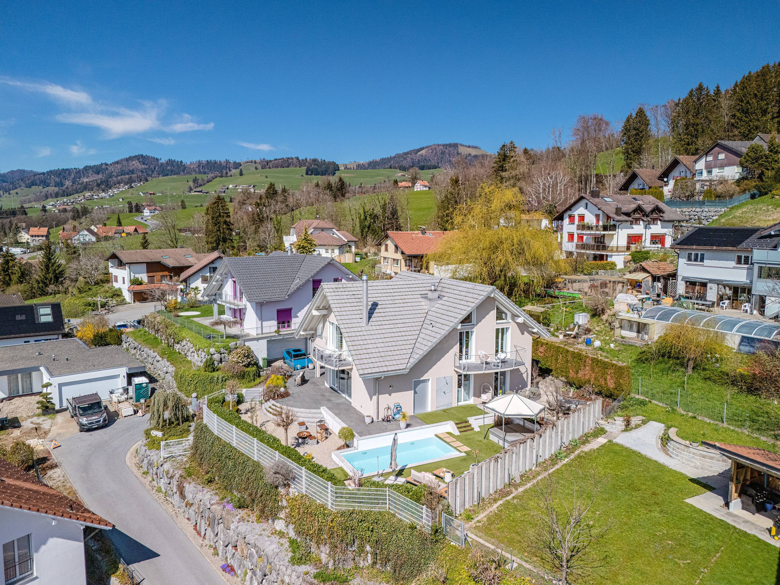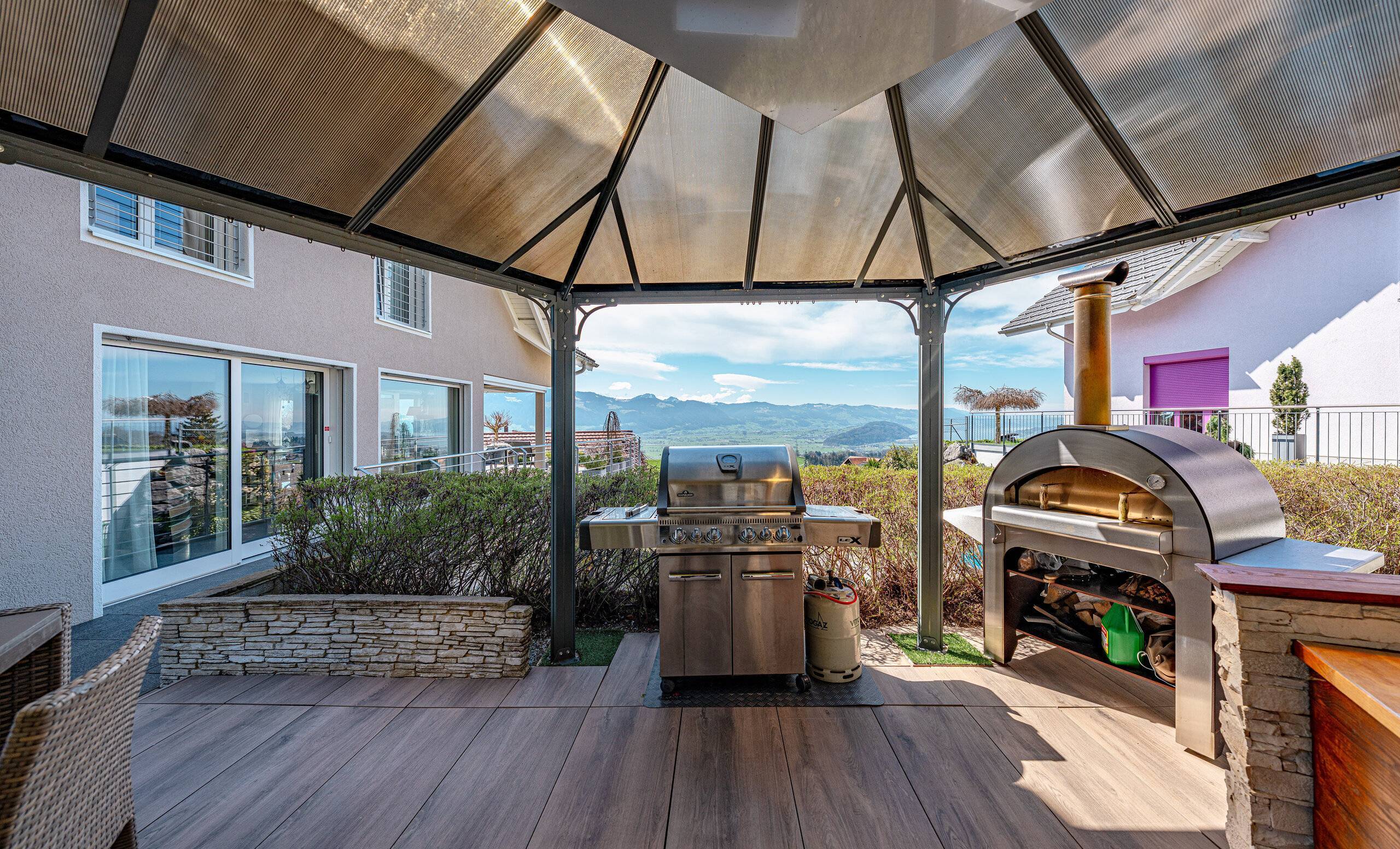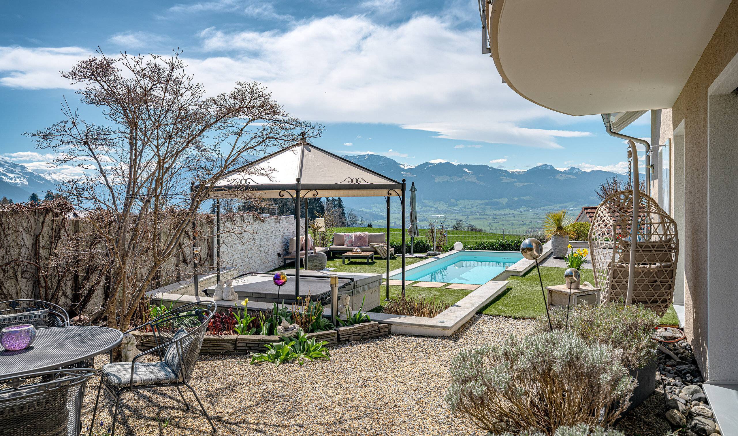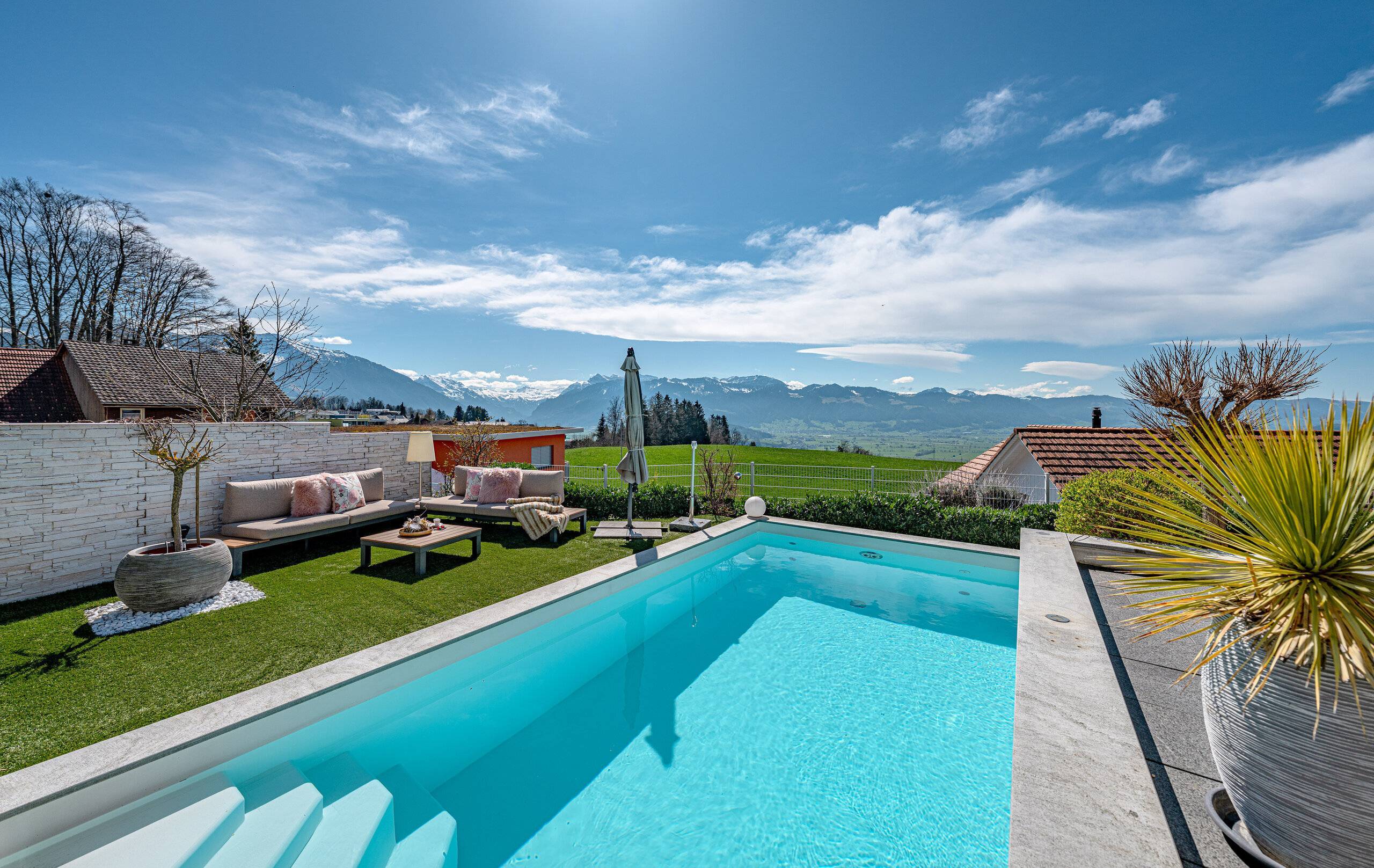- Grosser Umschwung: Garten mit schöner Grünfläche, Schwimmbad, einem Whirlpool und einer Outdoor-Küche