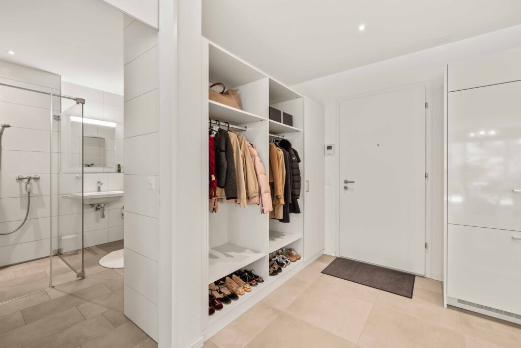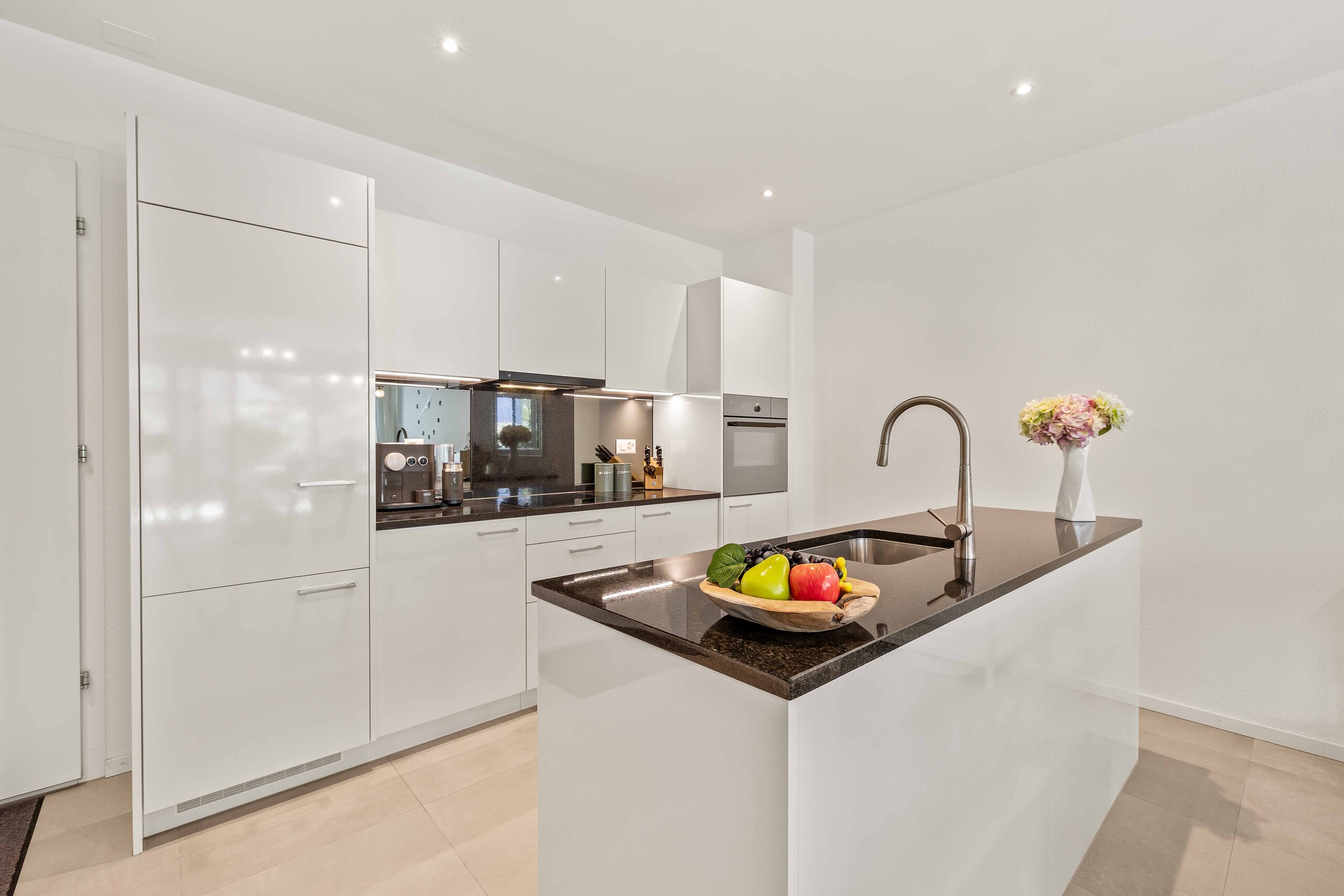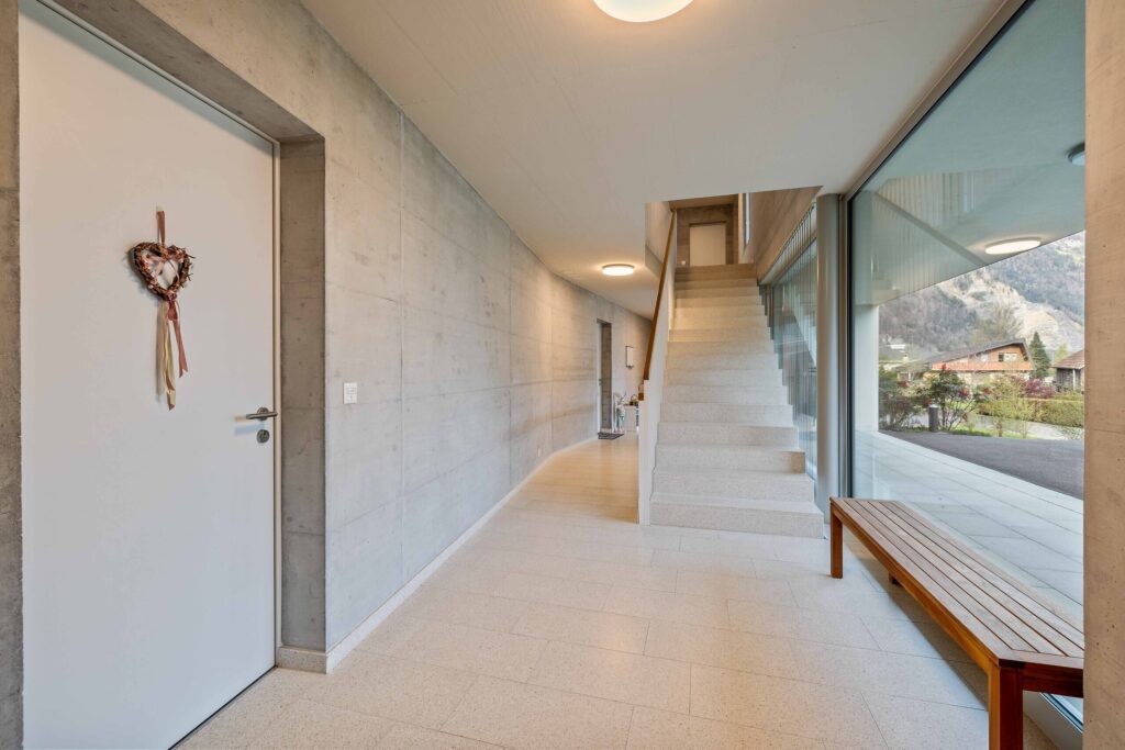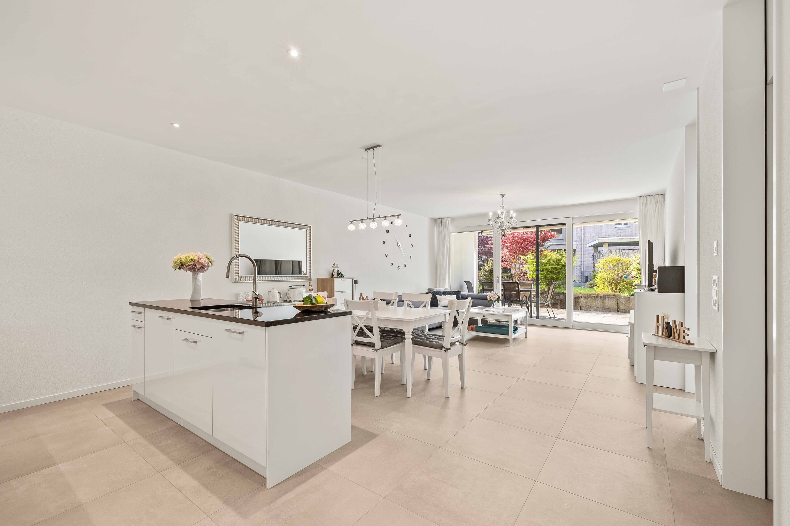 Hochwertige Keramikplatten in der ganzen Wohnung unterstreichen den modernen Charakter. Für Komfort und Energieeffizienz sorgen eine Erdsonden-Wärmepumpe, Bodenheizung mit Raumregulierung, elektrisch steuerbare Storen sowie die Minergie-Bauweise.