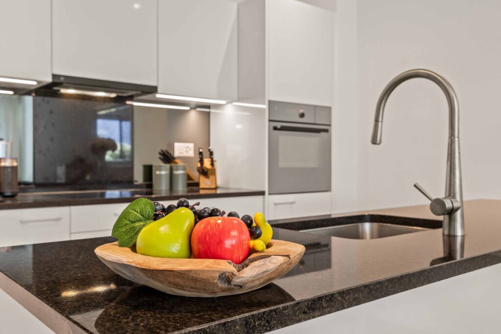 - Küche: Moderne Küche mit hochwertiger Arbeitsfläche, integrierten Beleuchtungen und viel Stauraum