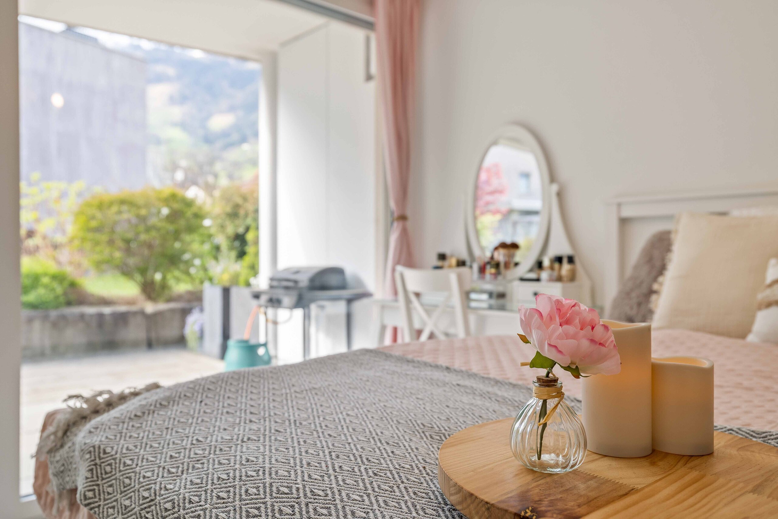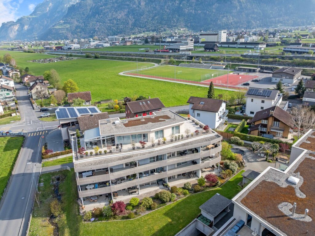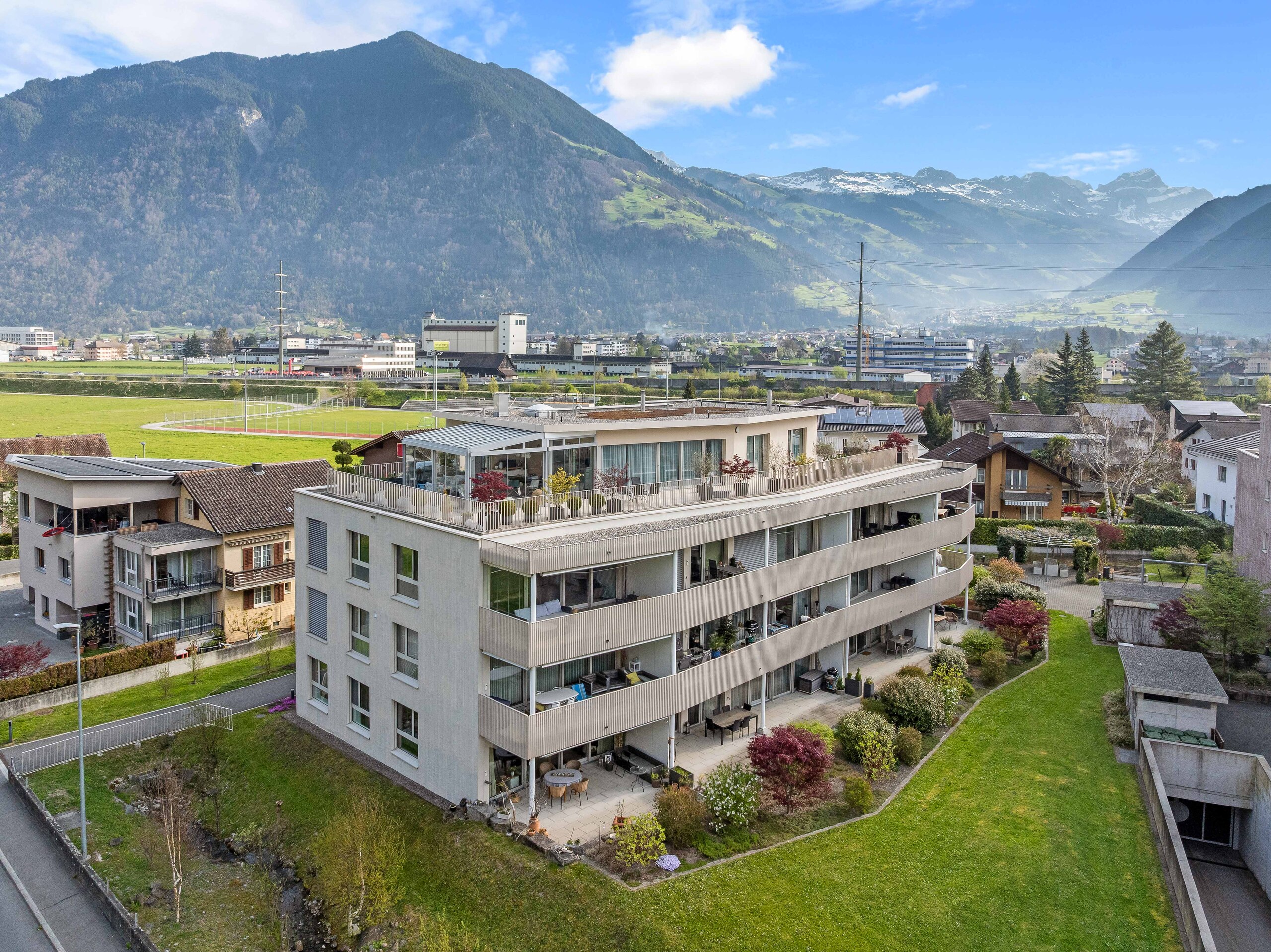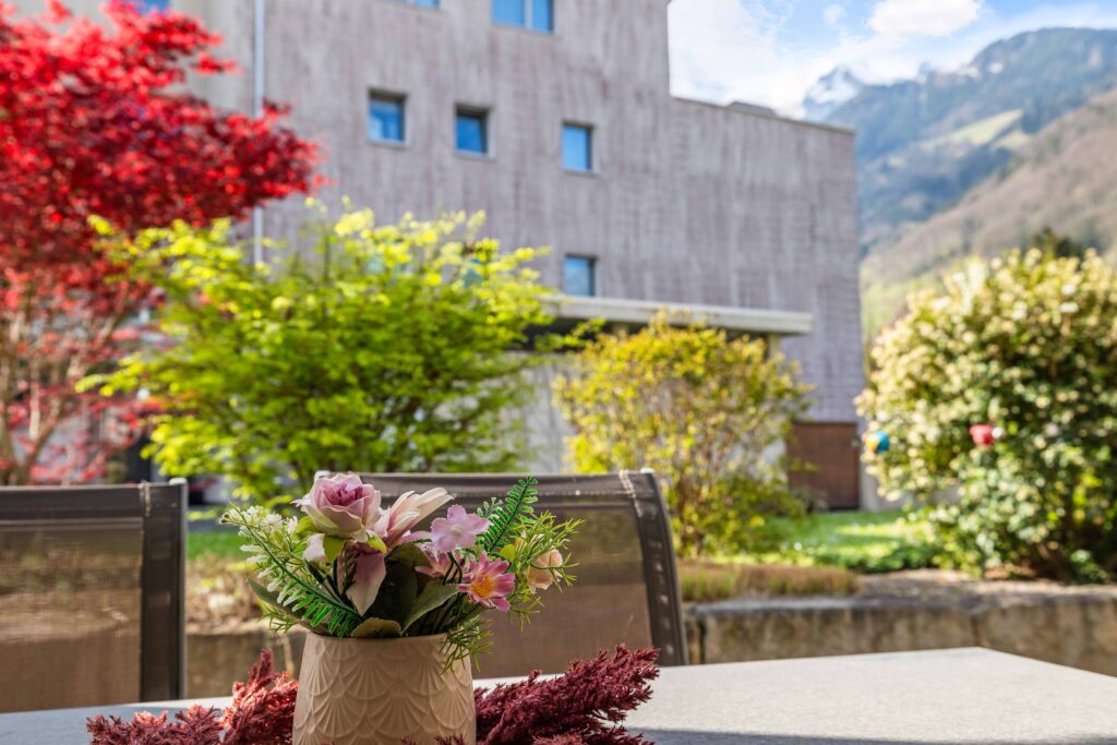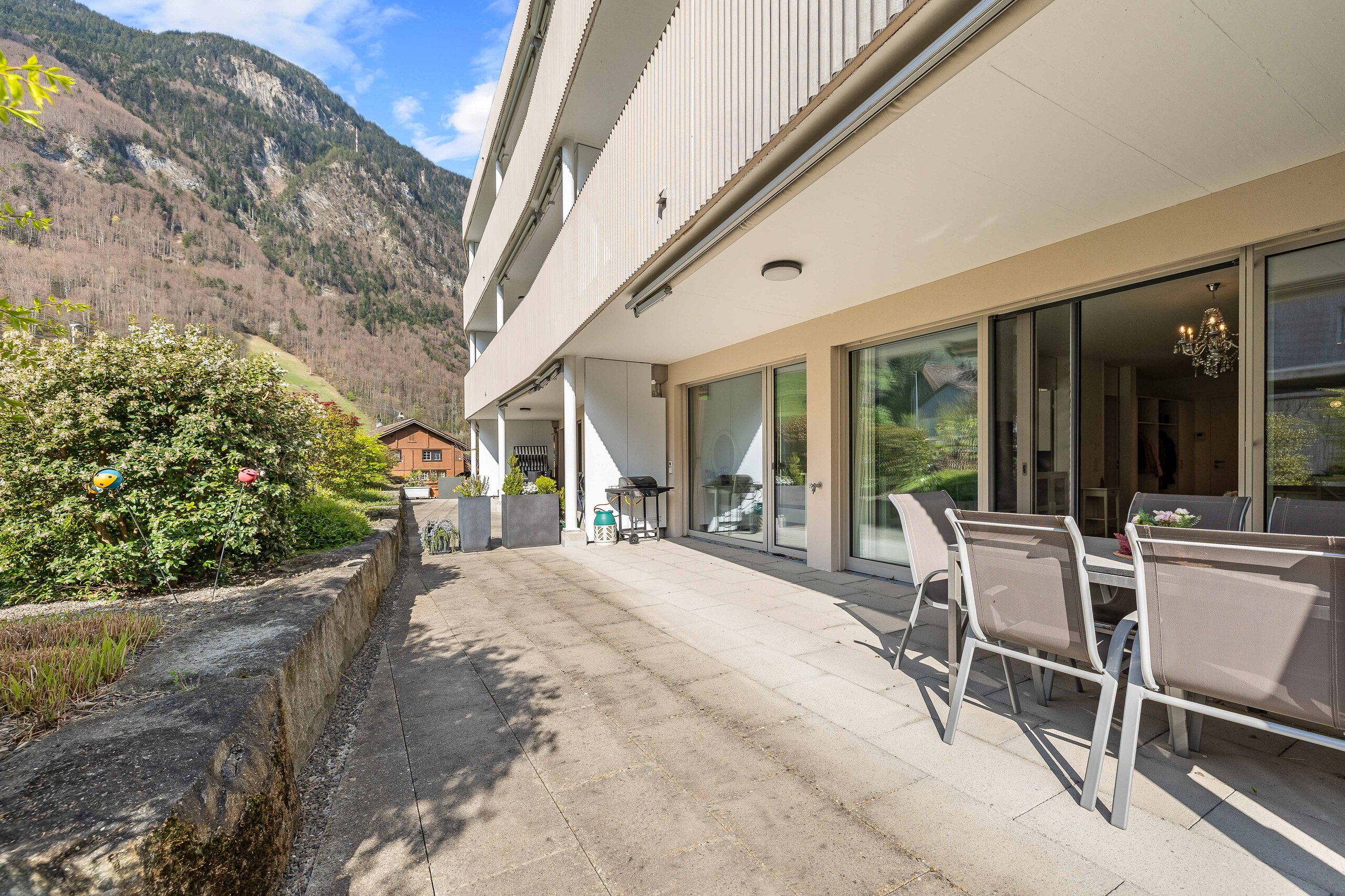 Besonders attraktiv ist die grosszügige, sonnige Terrasse mit teilweiser Überdachung und schöner Aussicht auf die umliegende Bergwelt. Von hier gelangen Sie direkt in den gepflegten Gartenbereich.