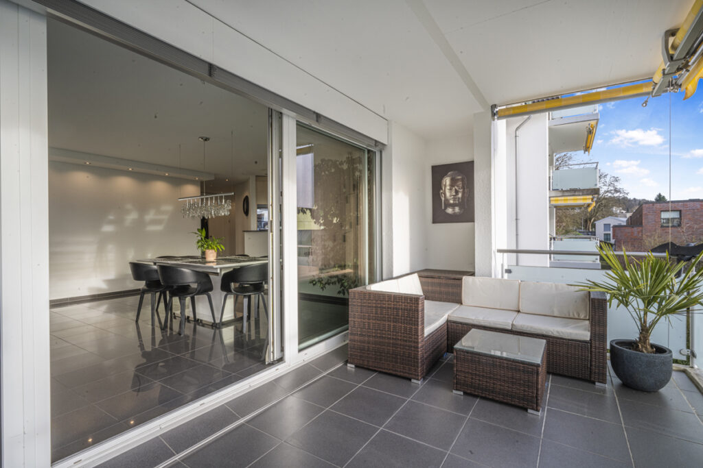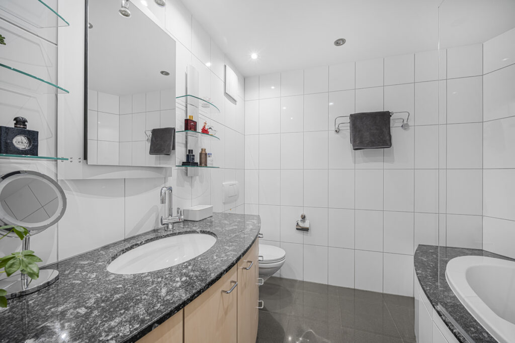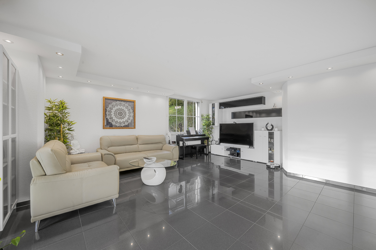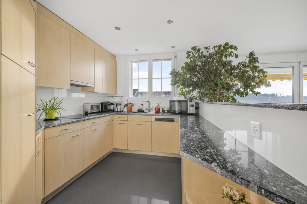 Auf 115 m² Wohnfläche überzeugt die Wohnung mit einem repräsentativen Wohn- und Essbereich, der dank stilvoller Einbauleuchten und direktem Zugang zur Terrasse eine angenehme Atmosphäre schafft. Die offene Küche mit pflegeleichter Granitabdeckung und grosszügigem Stauraum ist perfekt für gemeinsames Kochen und Geniessen.