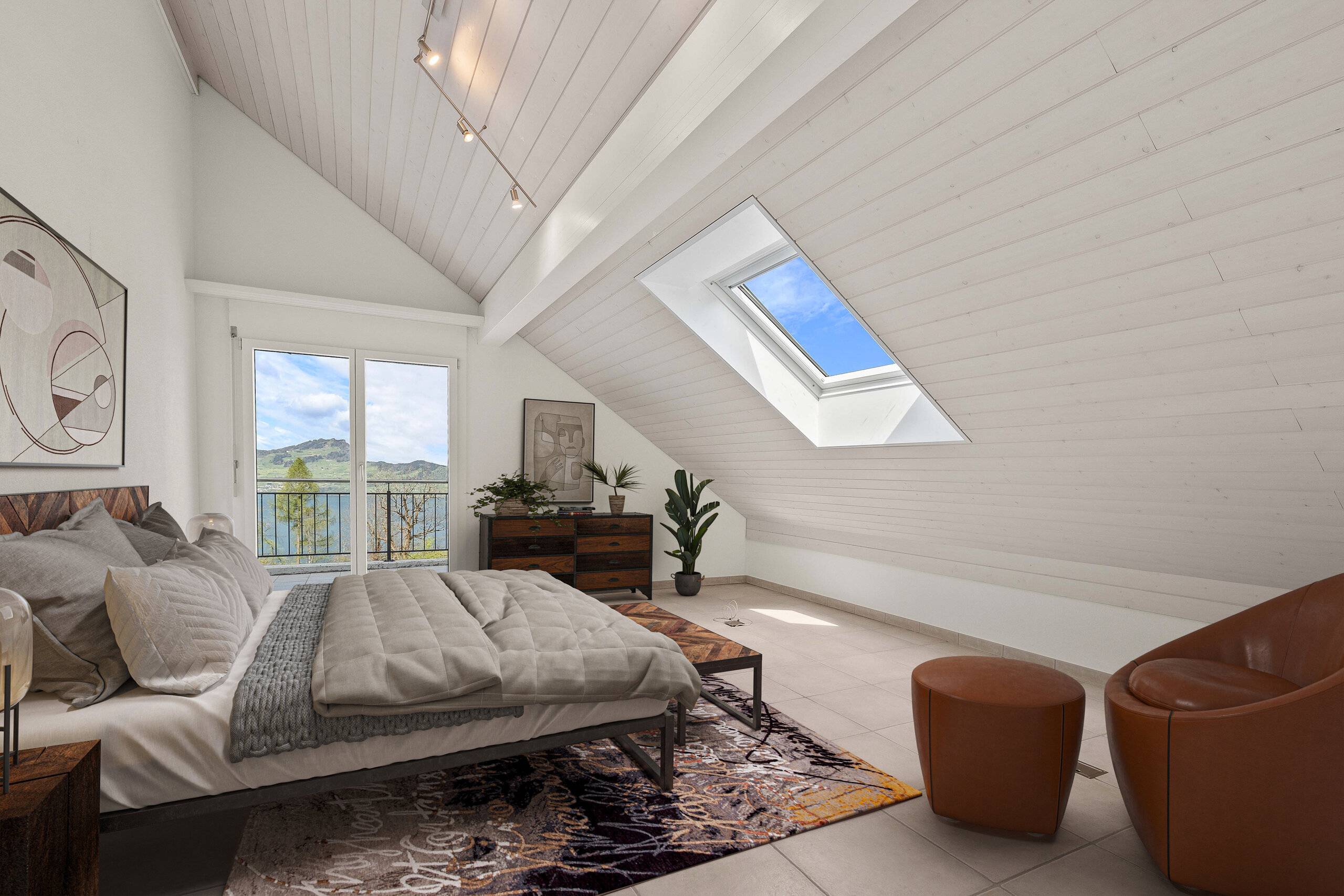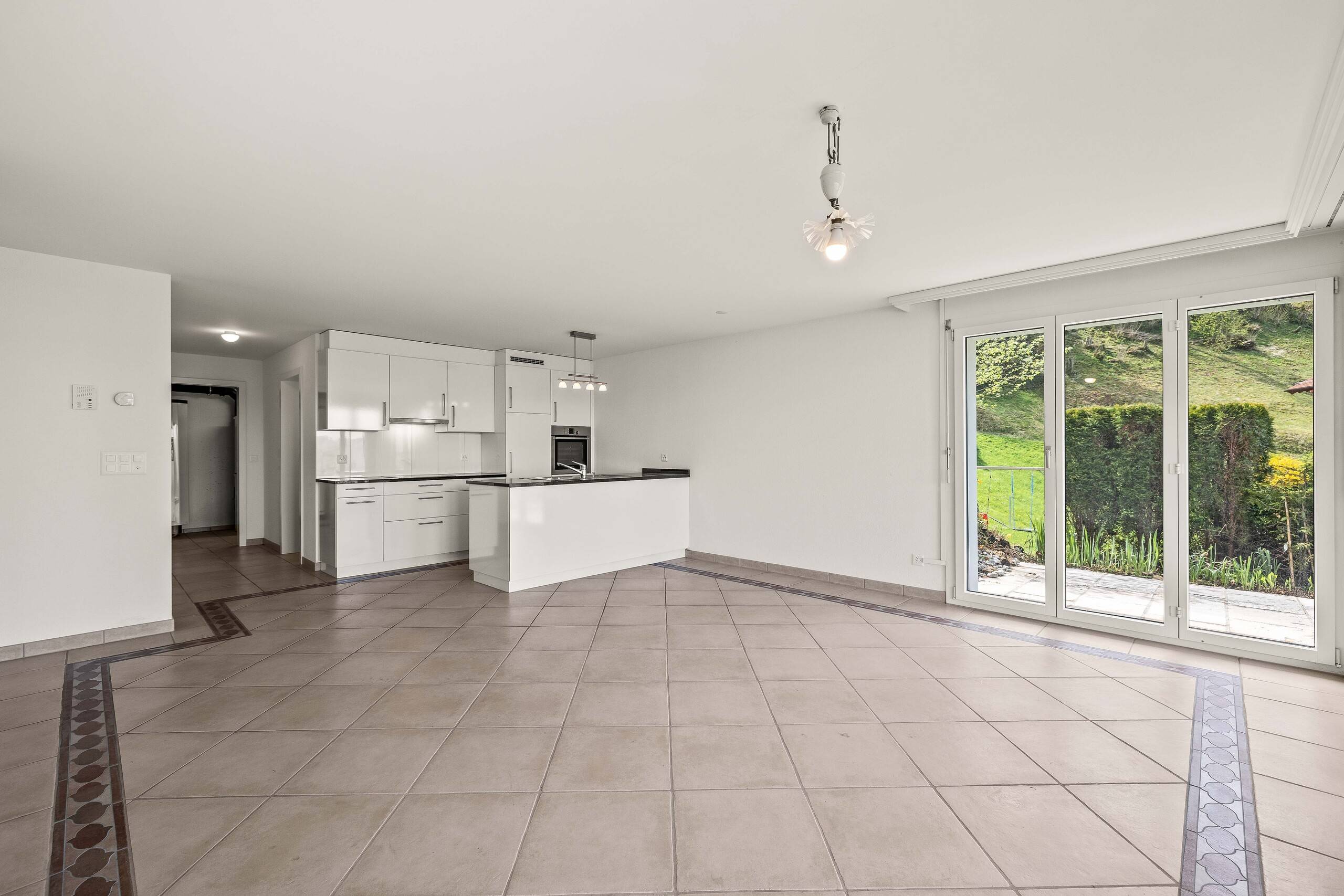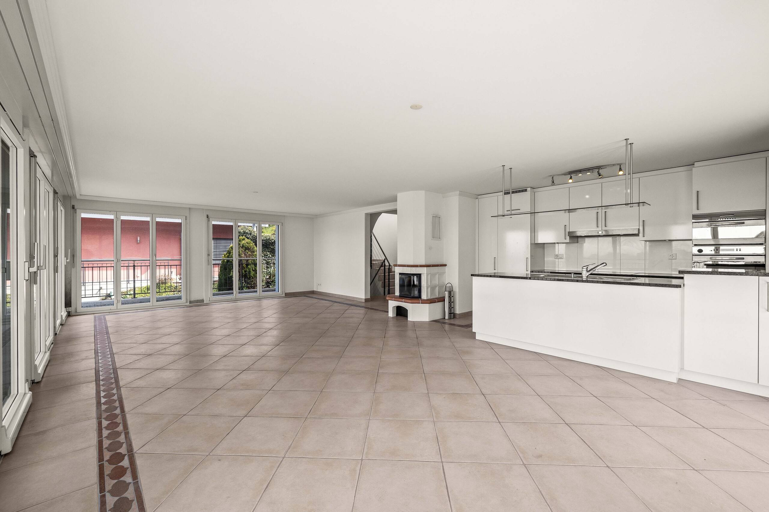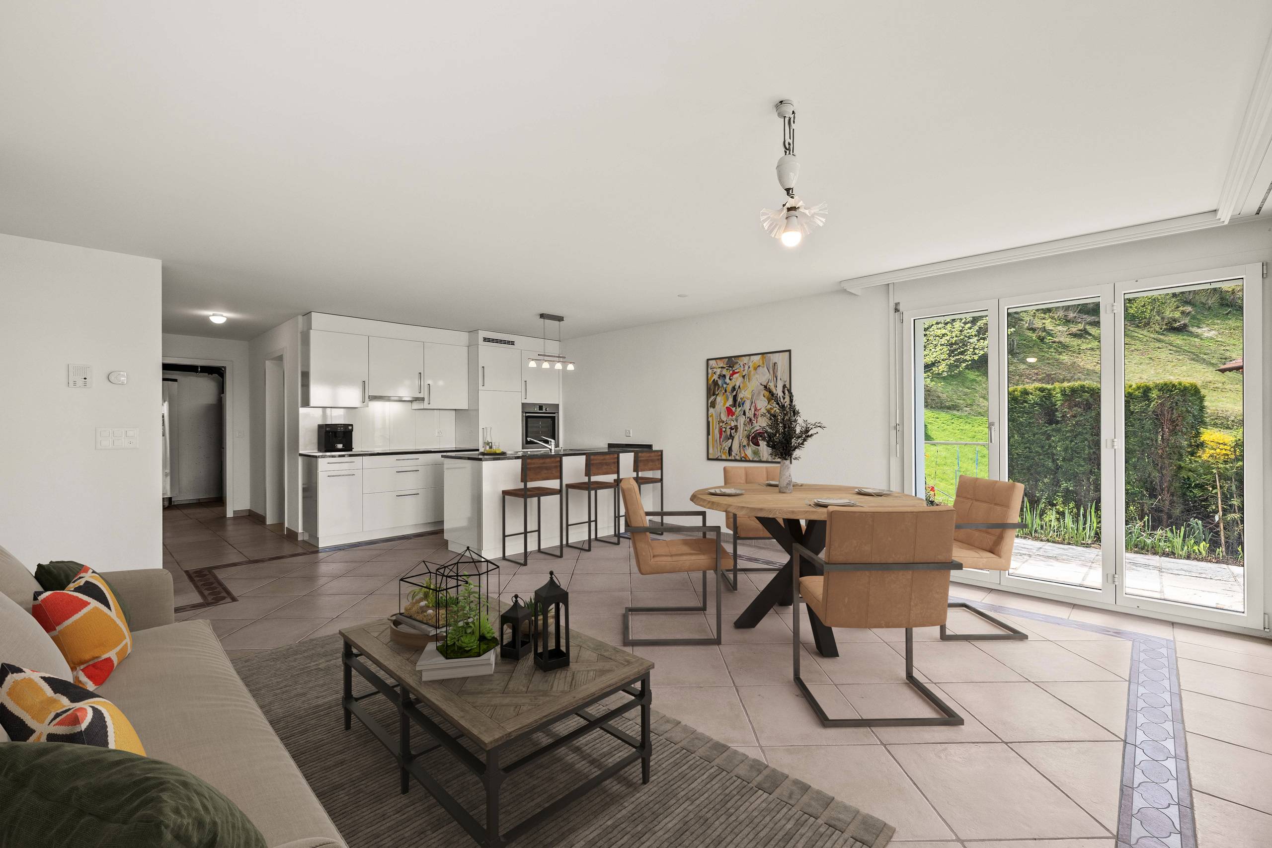 - Offener und heller Wohn- und Essbereich mit gemütlichem Cheminée im Obergeschoss und direktem Zugang zur Terrasse