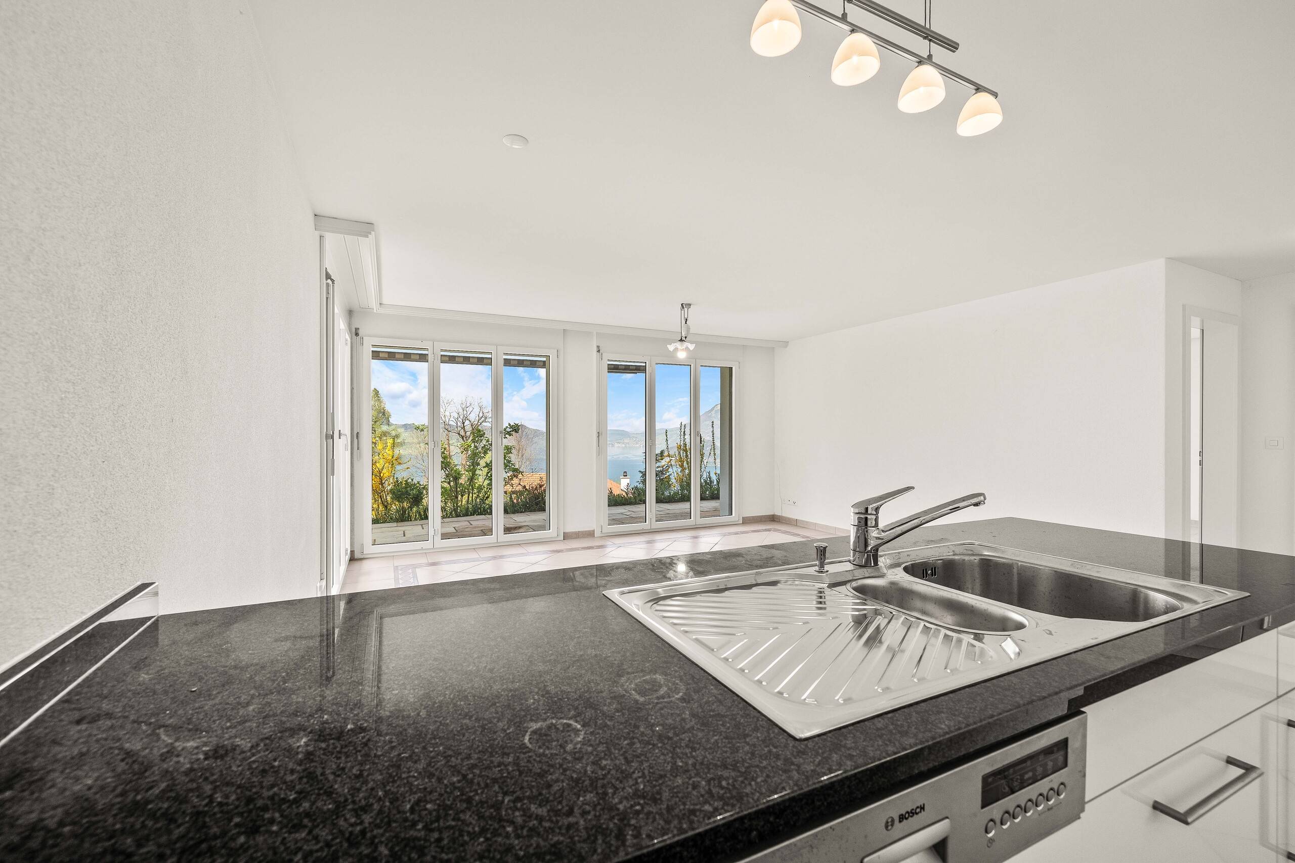 Der offene Wohn- und Essbereich im Obergeschoss bildet den gemeinsamen Mittelpunkt. Grosszügig, lichtdurchflutet und mit einem gemütlichen Cheminée ausgestattet, entsteht hier ein Ort für Begegnung, Gespräche und gemeinsames Leben. Die offene Küche mit Granitabdeckung, Kochinsel und viel Stauraum unterstützt dieses Wohngefühl und lädt dazu ein, den Alltag gemeinsam zu gestalten. Von hier aus führt der direkte Zugang auf die sonnige Terrasse – ideal für gemeinsame Mahlzeiten im Freien.