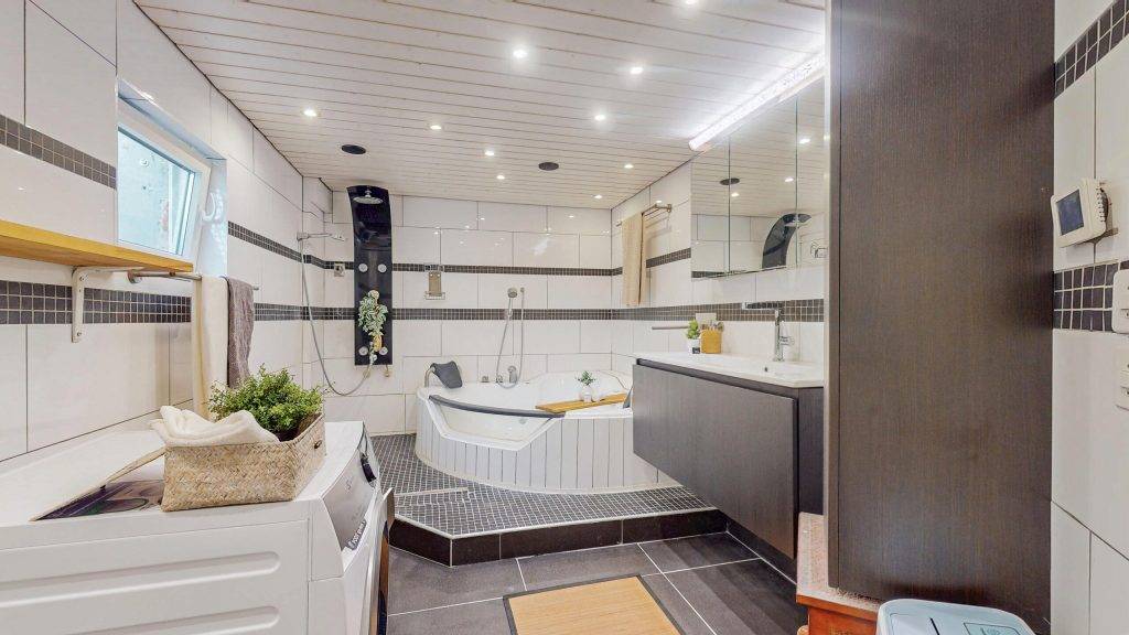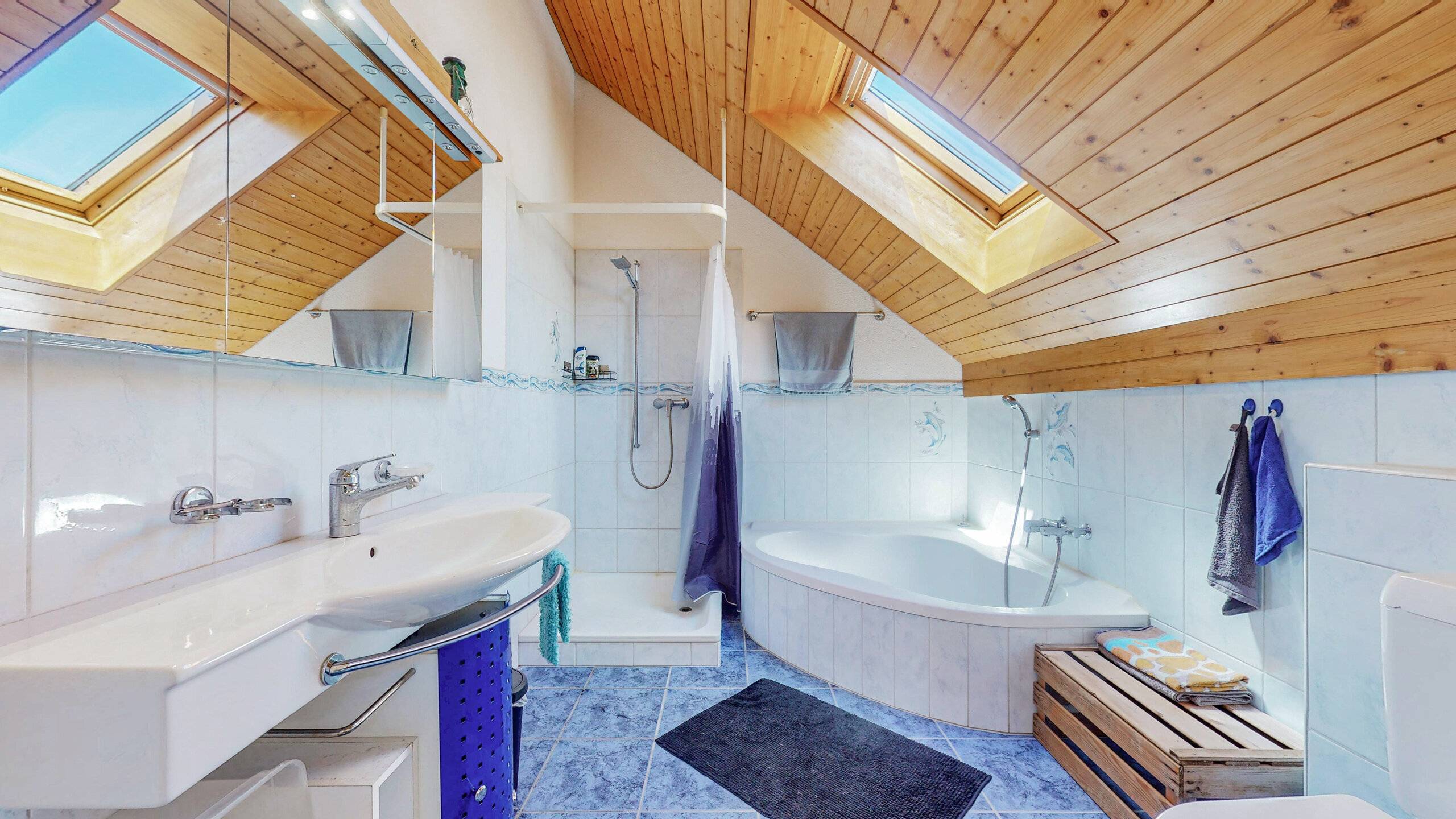 • Nassbereich: Wellnesskomfort dank eingebauter Badewanne mit Jacuzzi im Untergeschoss