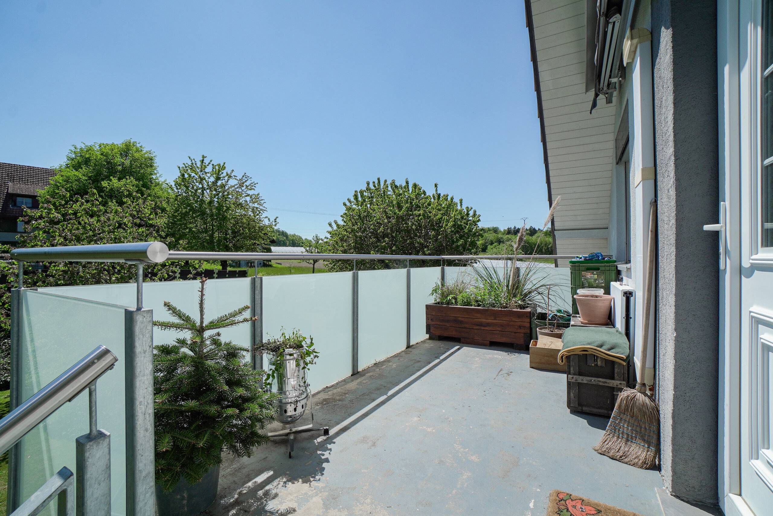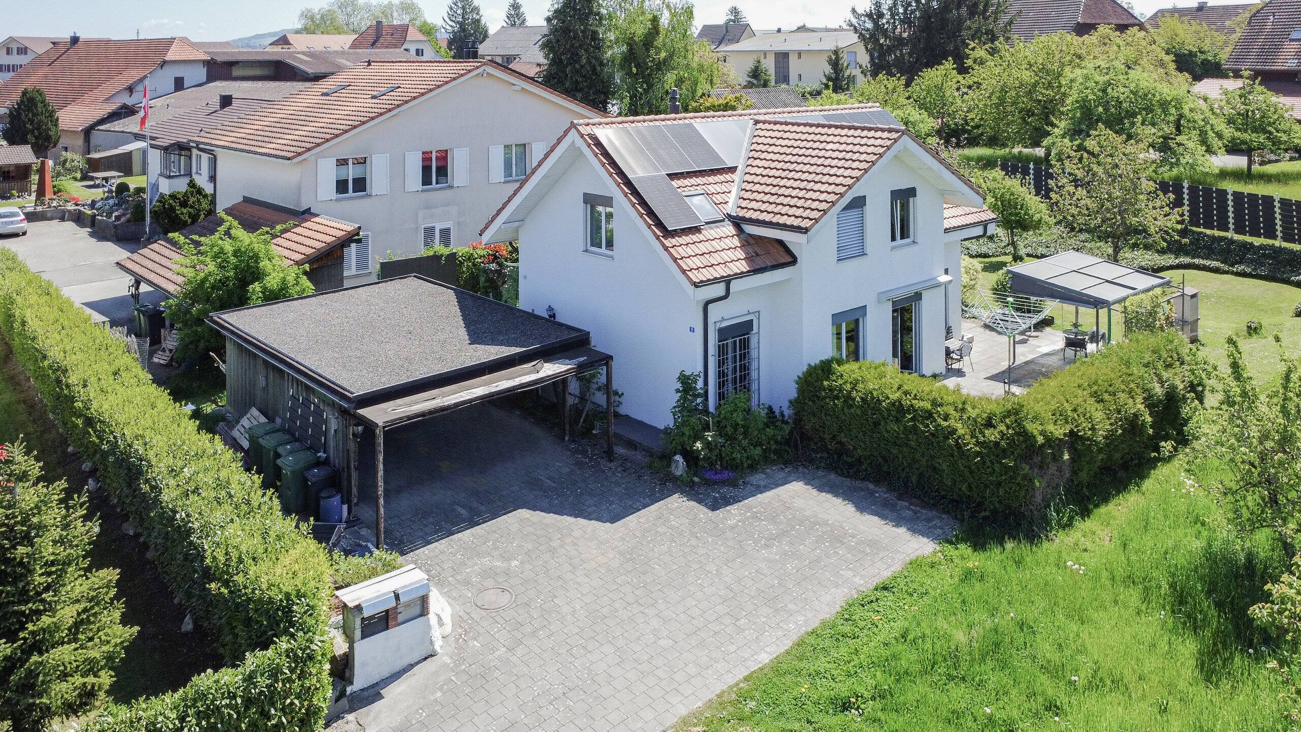 Der Aussenbereich ist ebenso attraktiv. Der Garten ist weitläufig angelegt und bietet mit der Pergola einen geschützten Platz im Grünen. Die Zufahrt zur Gemeindestrasse verläuft über ein eigenes Grundstück, was zusätzliche Privatsphäre schafft. Für Fahrzeuge stehen zwei Aussenplätze sowie ein Carport zur Verfügung.