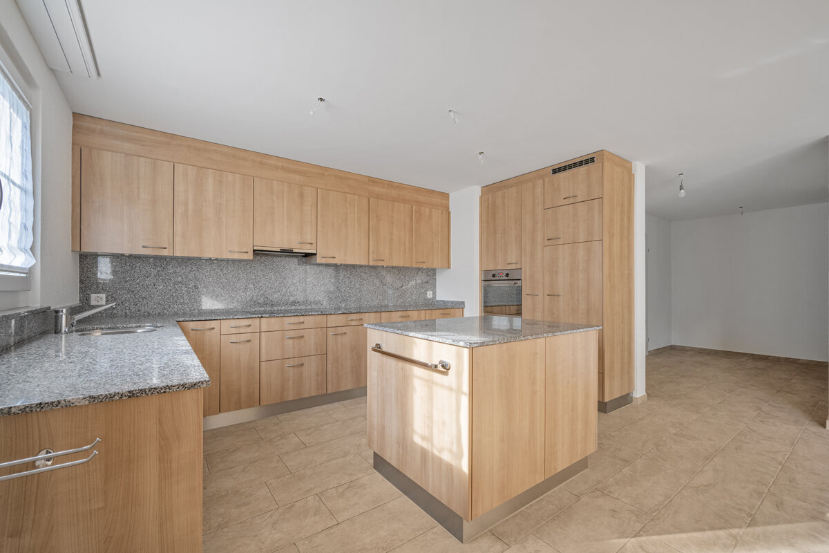 Der offene Wohn- und Essbereich mit gemütlichem Schwedenofen sorgt für eine warme Atmosphäre und öffnet sich direkt zum grossen, gedeckten Balkon mit Sonnenstore – perfekt für entspannte Stunden im Freien. Die offene Küche mit Kochinsel, Granitabdeckung und viel Stauraum verbindet modernes Design mit Funktionalität.