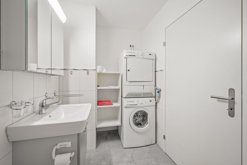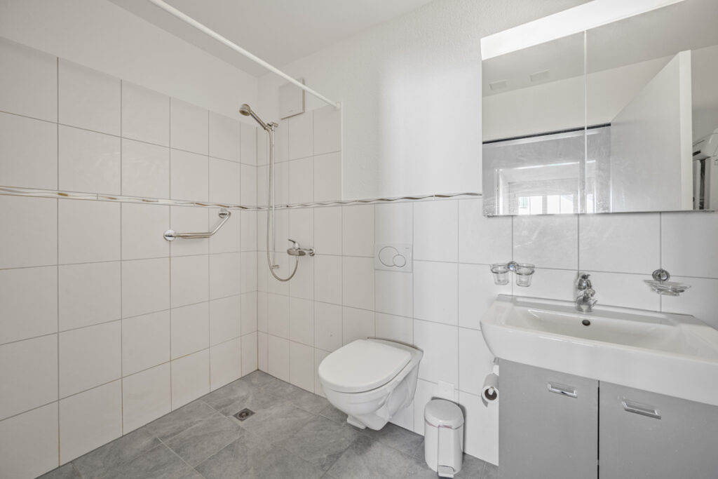 Zwei moderne Nassbereiche – ein Bad/WC sowie ein Duschraum mit integriertem Waschturm – bieten zusätzlichen Komfort. Dank Lift ist die Wohnung barrierefrei und rollstuhlgängig. Der gepflegte Zustand unterstreicht die hohe Wohnqualität.