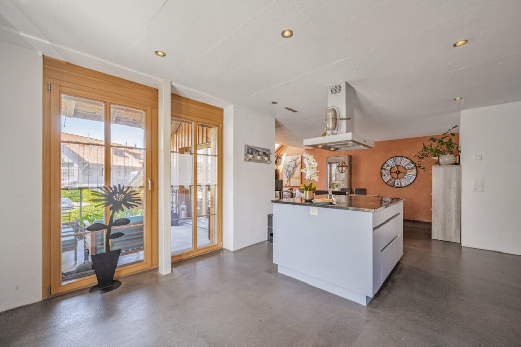 Der moderne Wohn- und Essbereich bildet das Herzstück der Wohnung. Grosszügig geschnitten, lichtdurchflutet und mit einem gemütlichen Schwedenofen ausgestattet, entsteht hier ein Ort zum Ankommen und Verweilen. Der direkte Zugang zum gedeckten Balkon erweitert den Wohnraum nach draussen und lädt zu entspannten Momenten ein. Die offene Küche mit Kochinsel, viel Stauraum und klarer Linienführung fügt sich harmonisch in den Wohnbereich ein und bietet beste Voraussetzungen für gemeinsames Kochen und Geniessen.