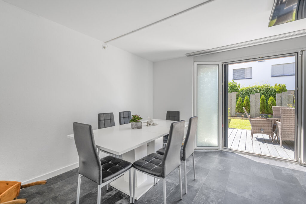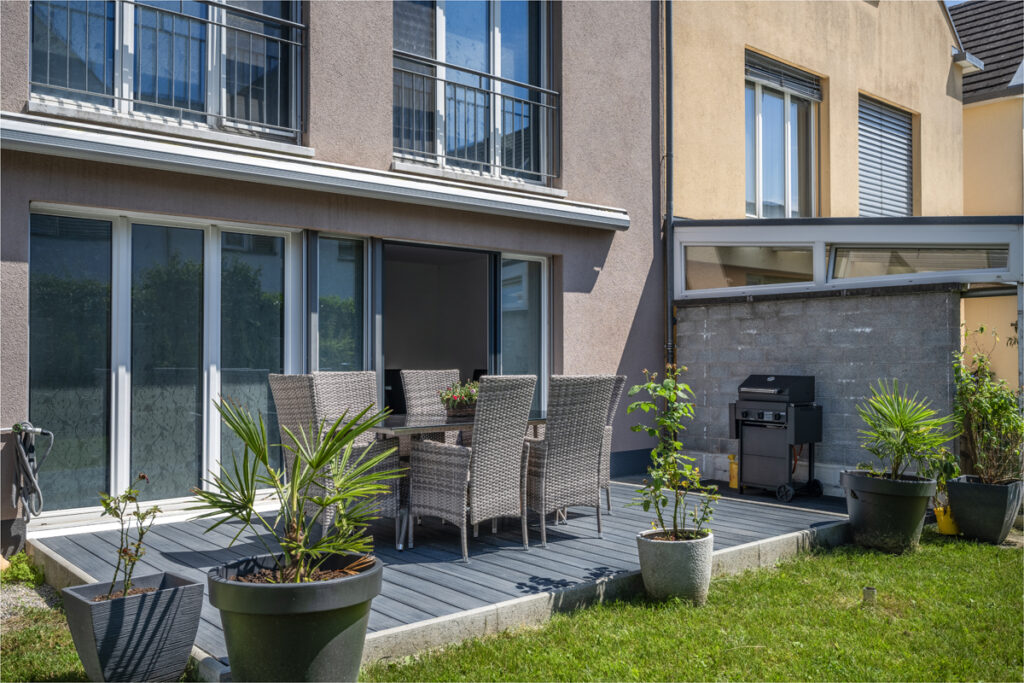 Zwei Einstellhallenplätze mit direktem Zugang zum Haus sind im Kaufpreis inbegriffen. Der gepflegte Garten mit Terrassendeck bietet eine ideale Umgebung für entspannte Stunden im Freien.