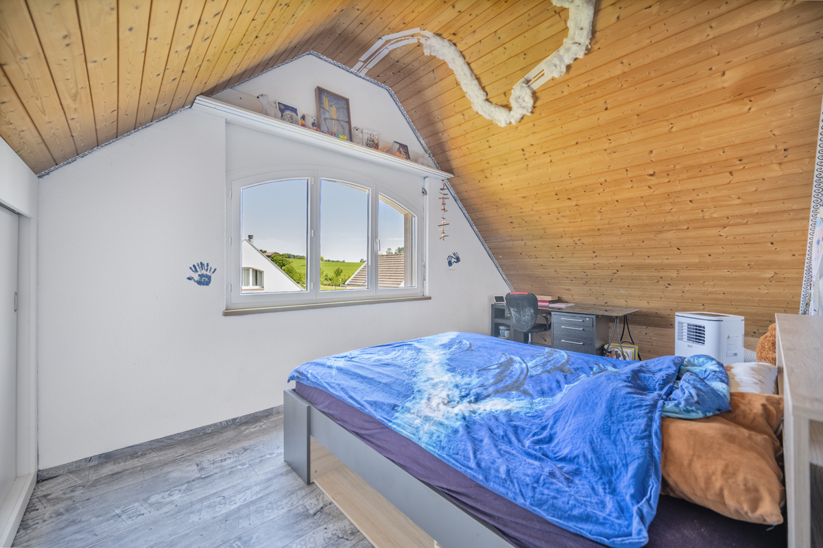 Das Herzstück bildet der helle Wohn- und Essbereich mit Schwedenofen, der direkten Zugang zur sonnigen Terrasse und zum Garten bietet. Die grosszügige Küche ist mit modernen Geräten ausgestattet, bietet viel Stauraum und lädt zum gemeinsamen Kochen ein. Im ausgebauten Dachgeschoss steht ein vielseitig nutzbarer Raum zur Verfügung, der sich perfekt als Büro, Atelier oder Rückzugsort eignet.