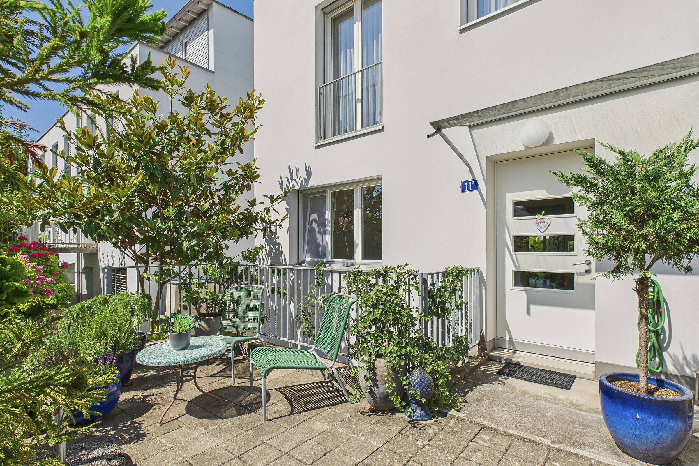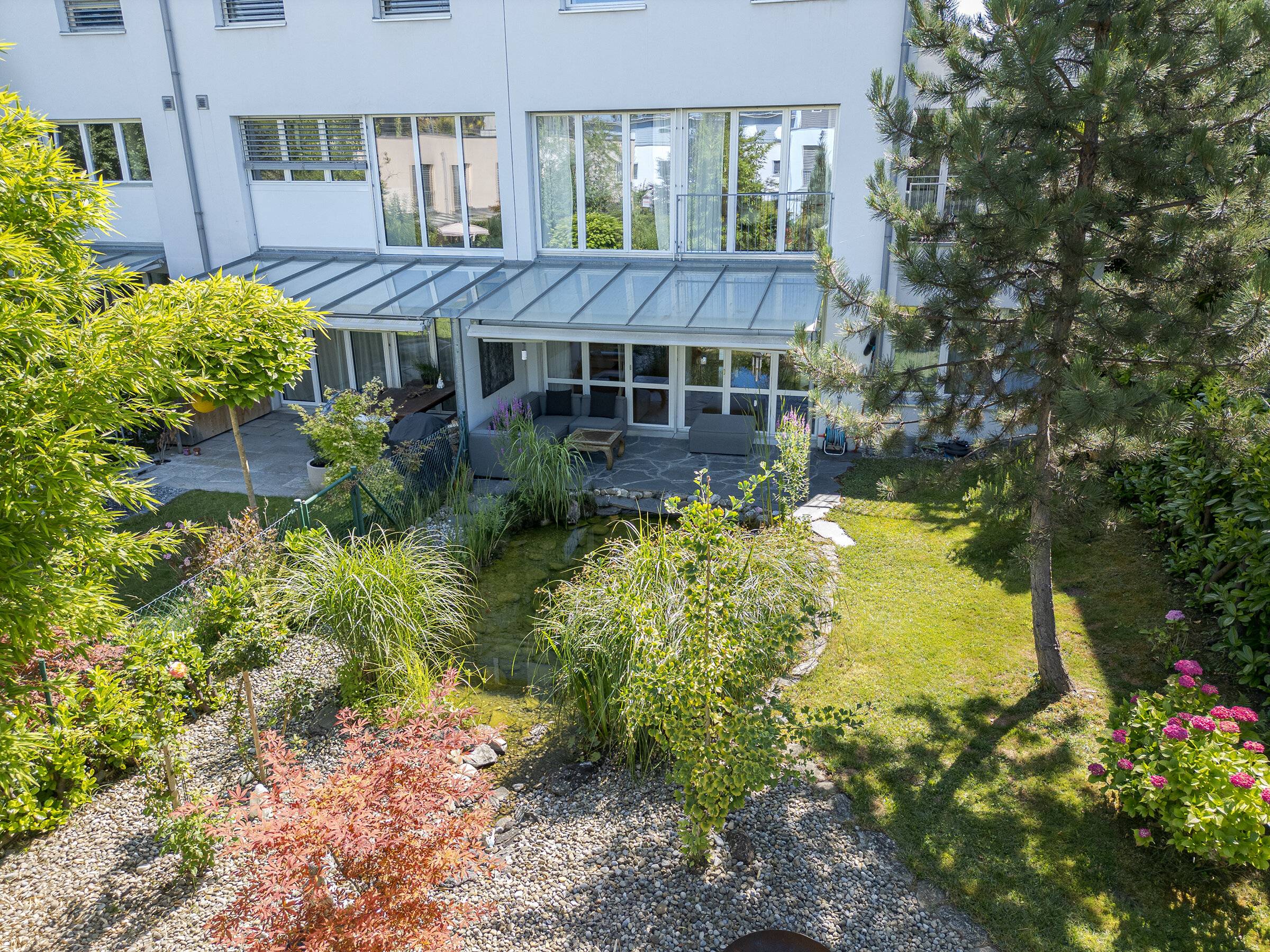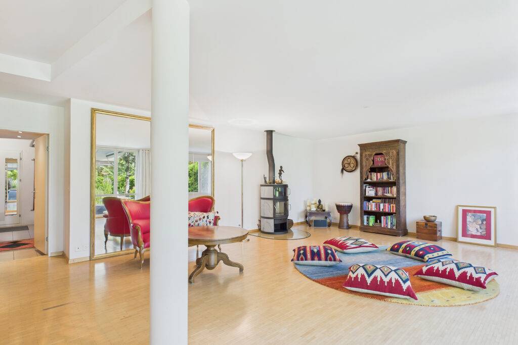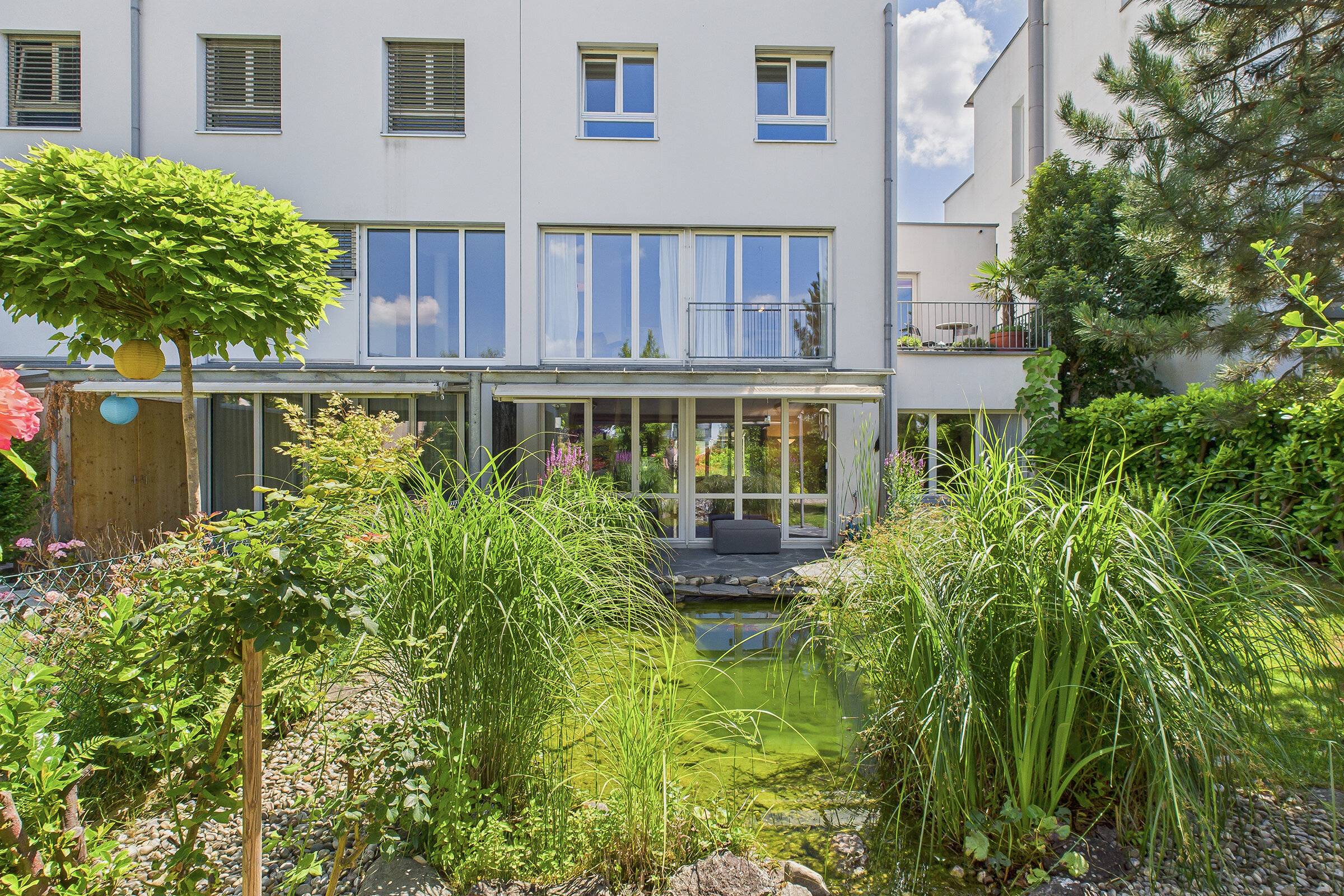 Im Eingangsgeschoss erwartet Sie ein heller, offener Wohn- und Essbereich mit moderner Küche, der den Mittelpunkt des Hauses bildet. Im Gartengeschoss eröffnet sich ein weiteres Platzspektakel: 43 m² zusätzliche Wohnfläche mit direktem Zugang zum liebevoll gestalteten Garten. Hier sorgt eine kleine Wellnessoase für Entspannung, während der grosszügige Aussenbereich mit sonniger Terrasse, Naturteich, Vorgarten und zwei Balkonen viel Raum für Genuss und Erholung im Freien bietet.