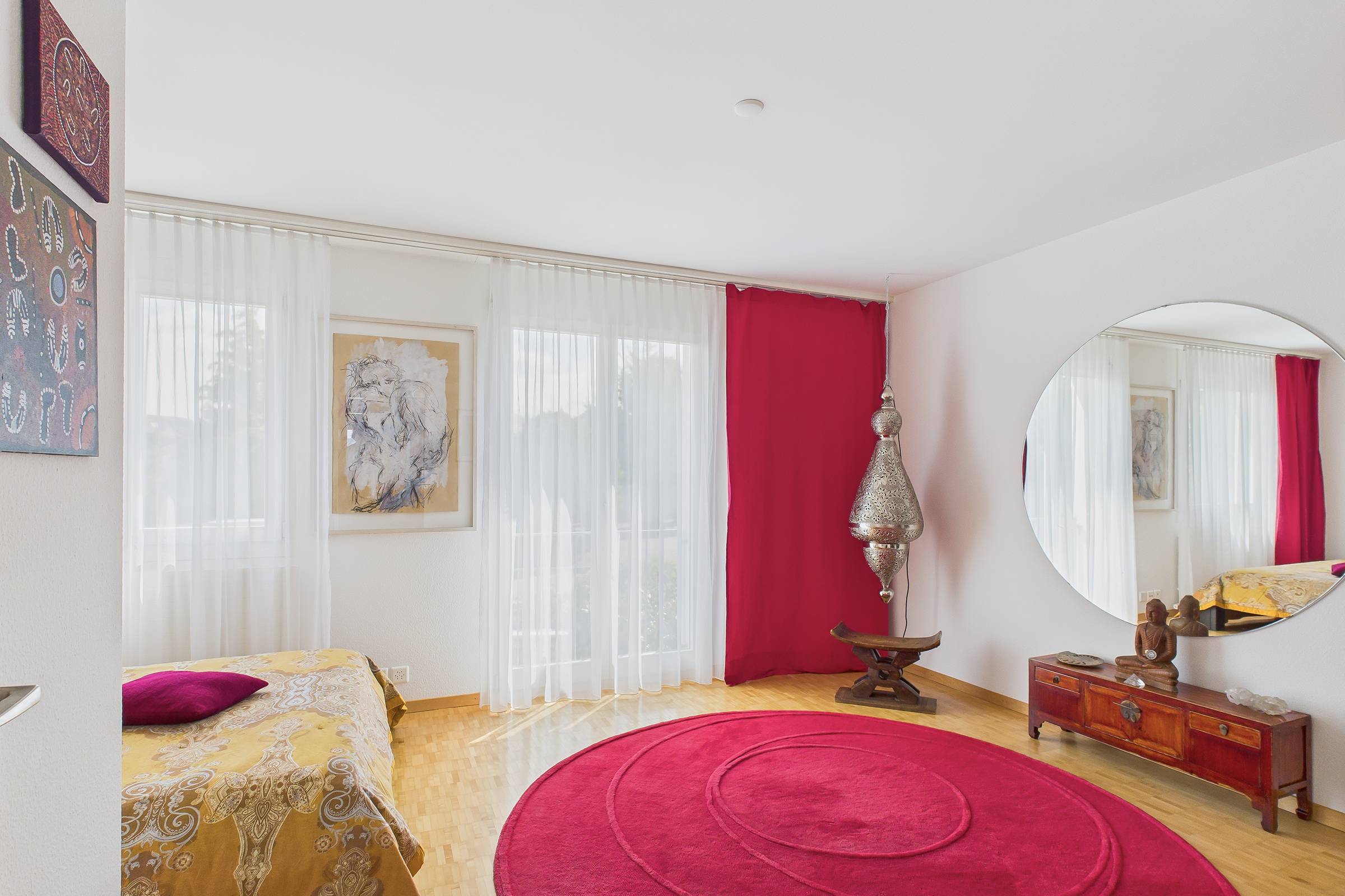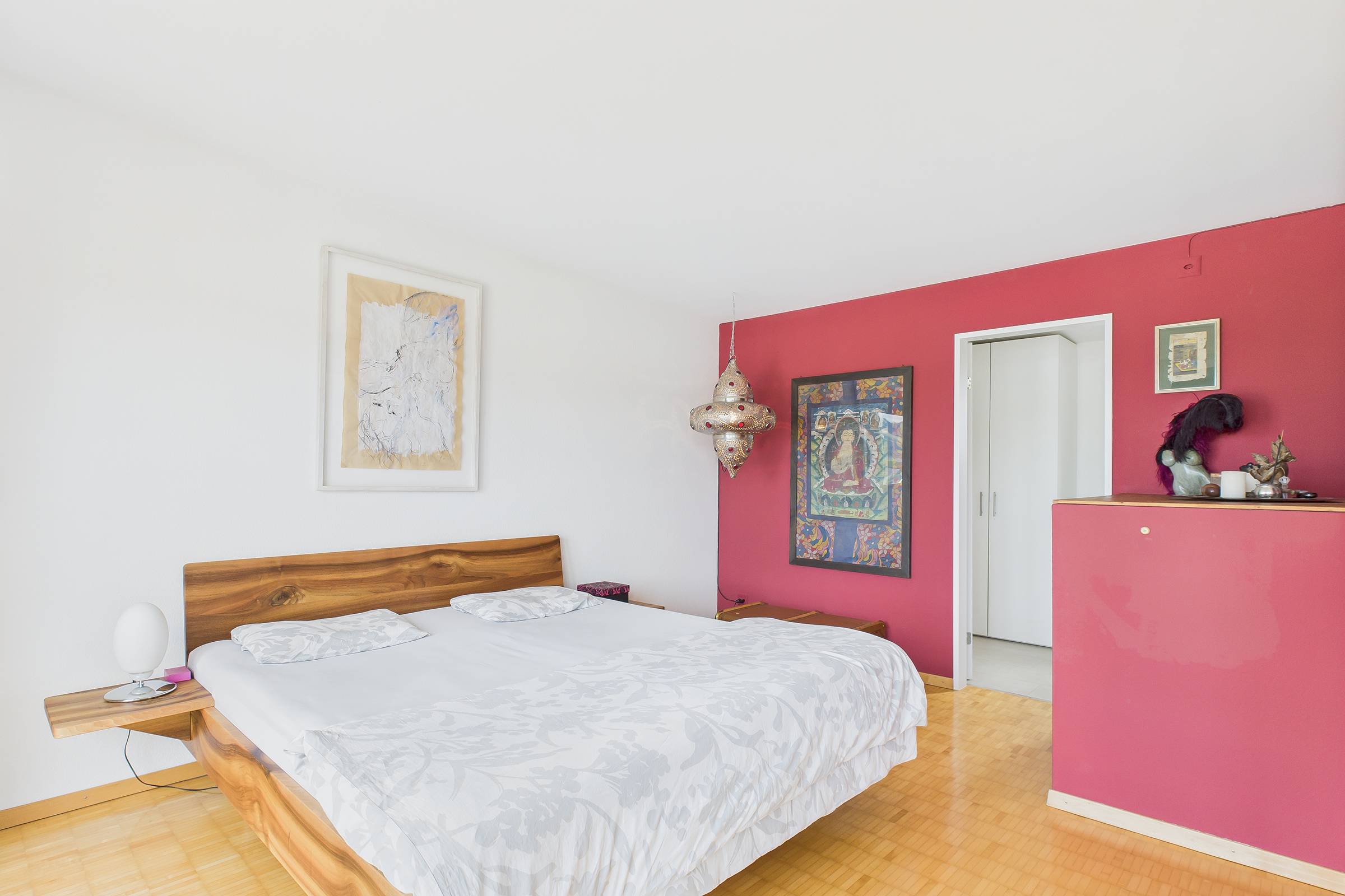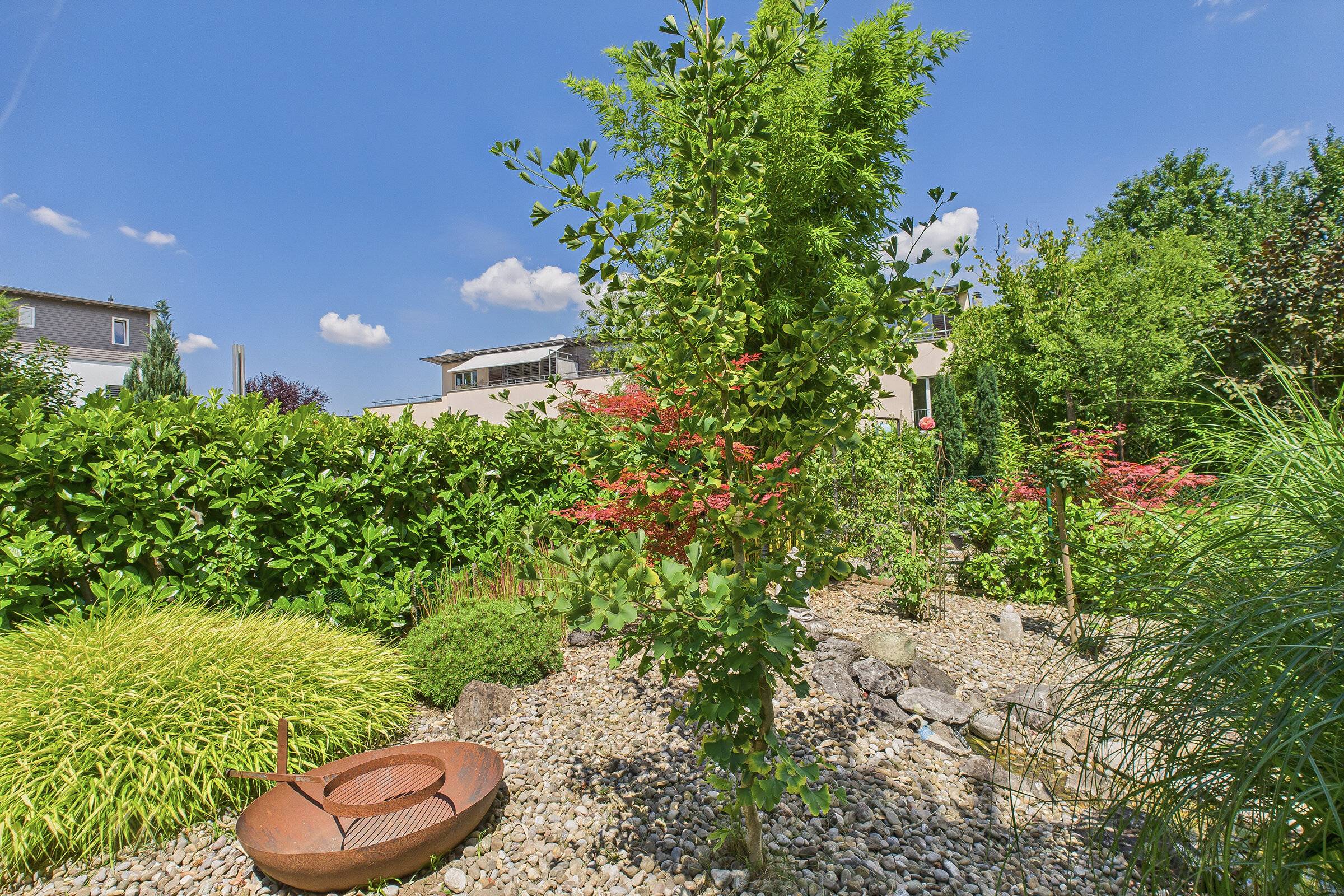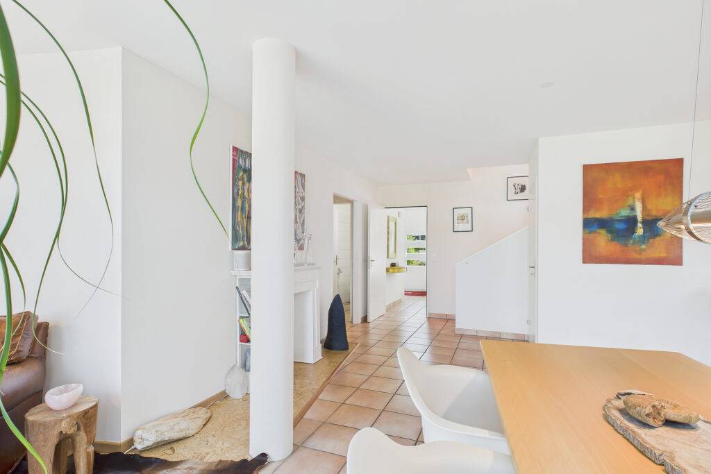 Im Eingangsgeschoss erwartet Sie ein heller, offener Wohn- und Essbereich mit moderner Küche, der den Mittelpunkt des Hauses bildet. Im Gartengeschoss eröffnet sich ein weiteres Platzspektakel: 43 m² zusätzliche Wohnfläche mit direktem Zugang zum liebevoll gestalteten Garten. Hier sorgt eine kleine Wellnessoase für Entspannung, während der grosszügige Aussenbereich mit sonniger Terrasse, Naturteich, Vorgarten und zwei Balkonen viel Raum für Genuss und Erholung im Freien bietet.