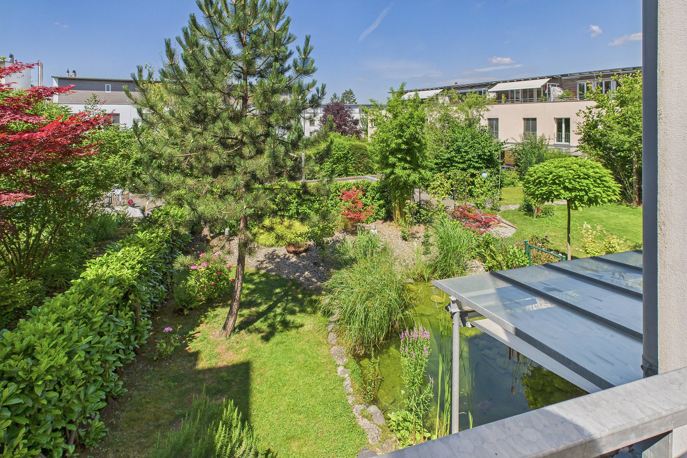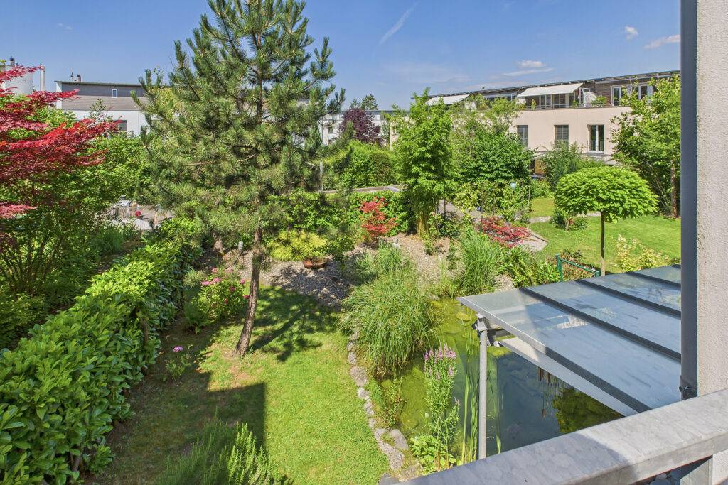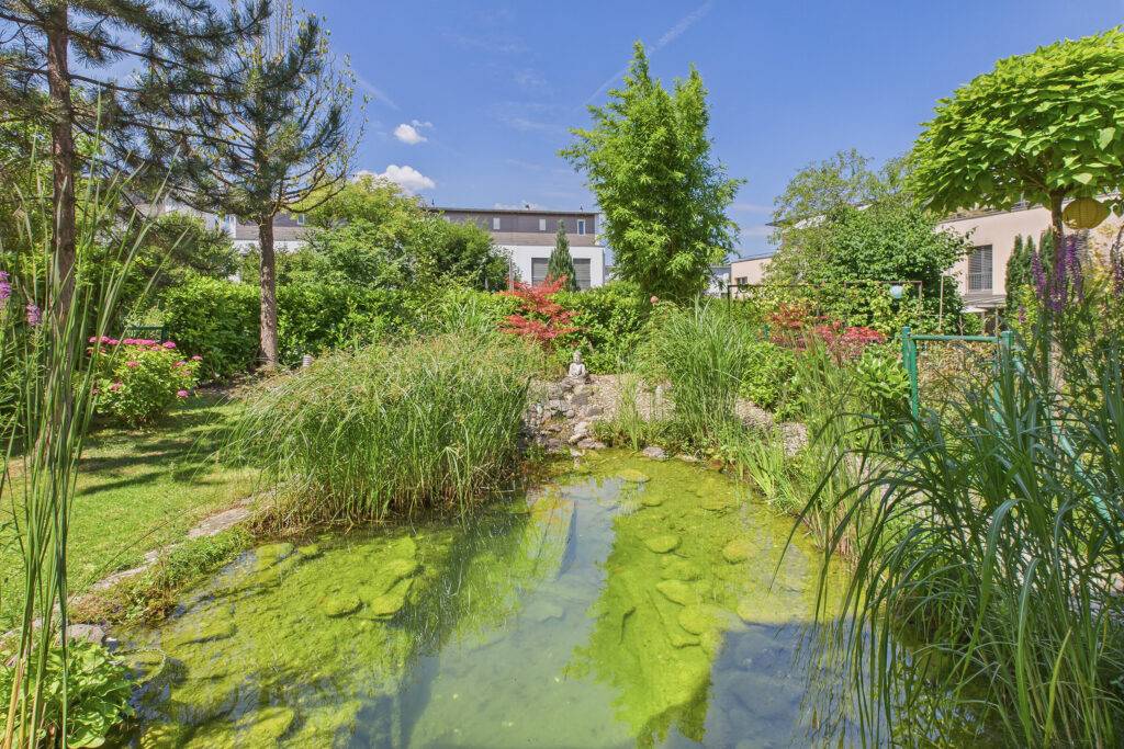 • Gepflegter grosser Garten: mit idyllischem Naturteich, sonniger Vorgarten, zwei Balkonen mit Weitsicht und sonniger Terrasse