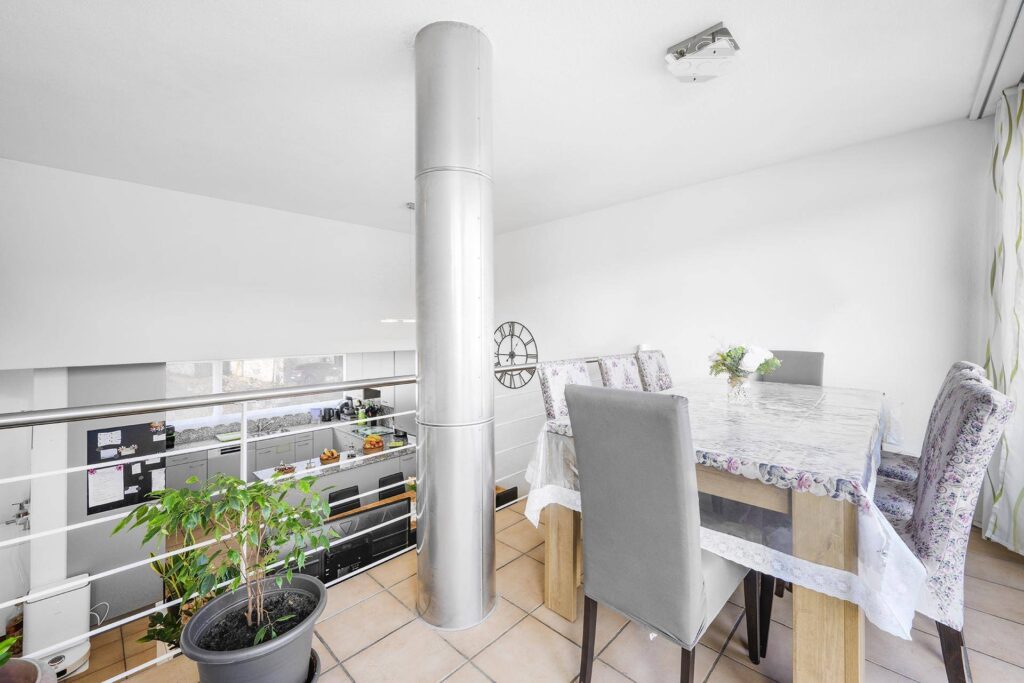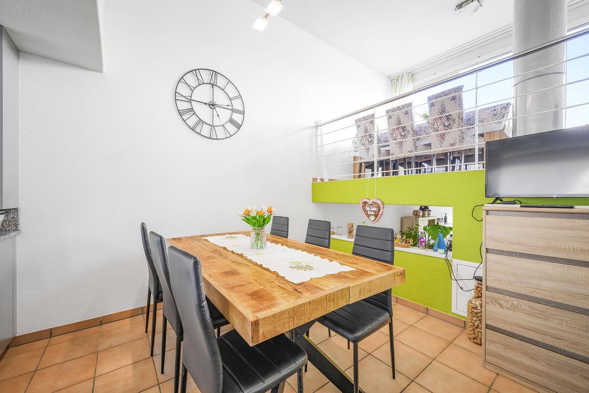 Der helle Wohnbereich mit gemütlichem Schwedenofen bildet das Herzstück des Hauses. Versetzt auf Halbgeschossen befinden sich gleich zwei Essbereiche mit Blick ins Grüne – eine charmante Lösung, die für Grosszügigkeit und Licht sorgt. Die moderne, zeitgemäss ausgestattete Küche bietet viel Arbeitsfläche und ist bestens geeignet für gemeinsame Kochmomente.