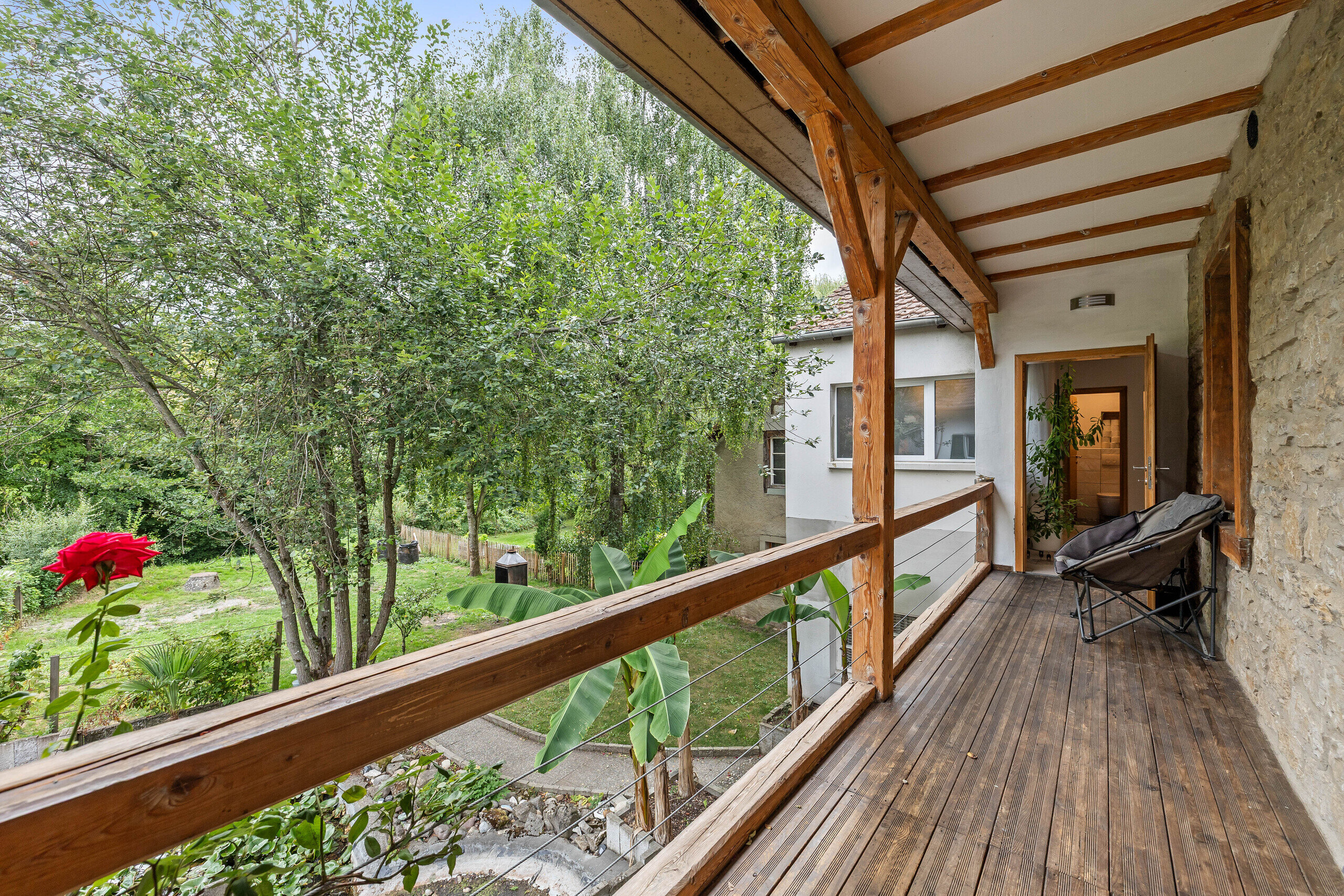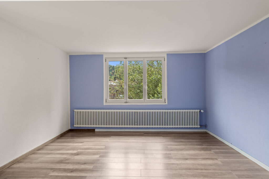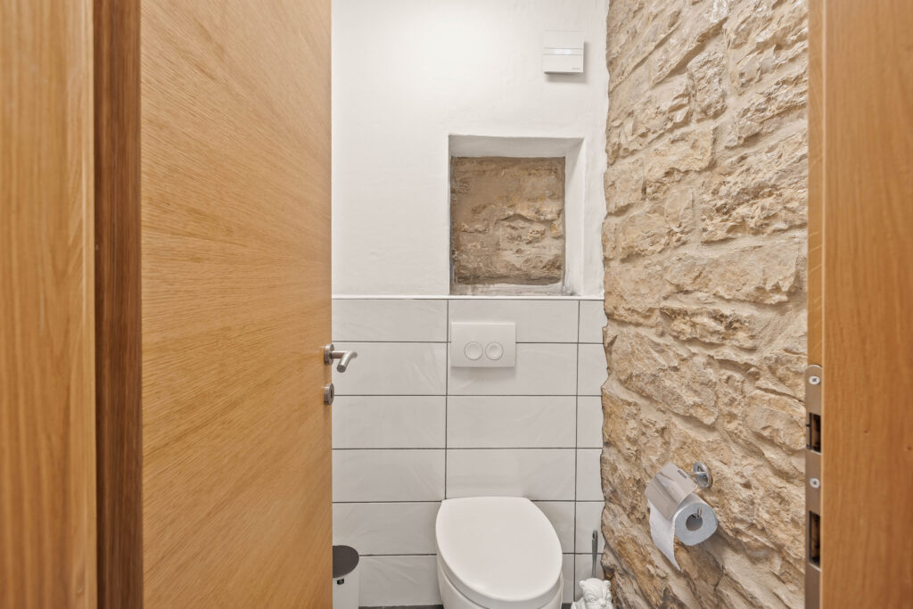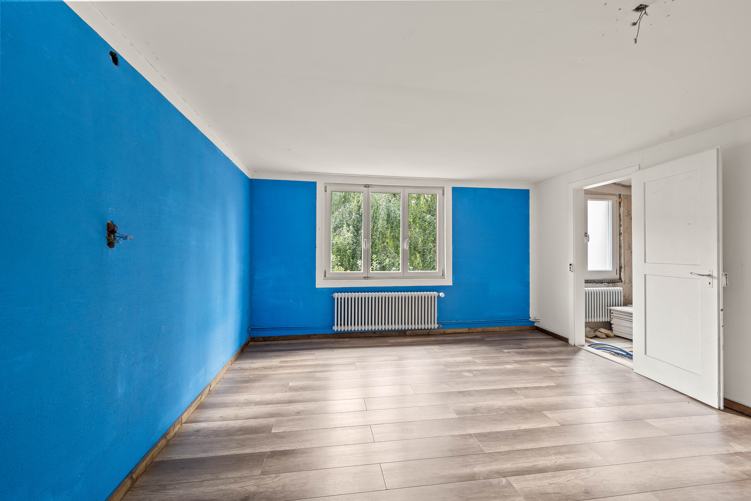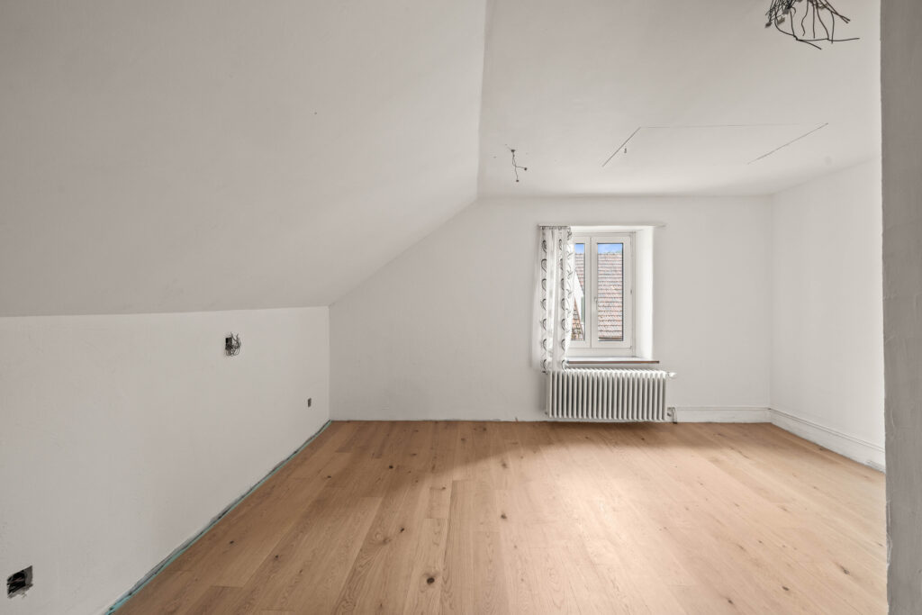 Im Obergeschoss wurde die Sanierung bereits abgeschlossen, während Erd- und Dachgeschoss zu grossen Teilen noch im Rohbau sind. Damit eröffnet sich viel Raum, um individuelle Ideen und persönliche Wohnträume zu verwirklichen. Das Familienbad überzeugt mit Badewanne inklusive Whirlpool-Funktion, einer Walk-in Dusche und zwei Lavabos. Ein grosszügiger Balkon erweitert den Wohnraum nach draussen.