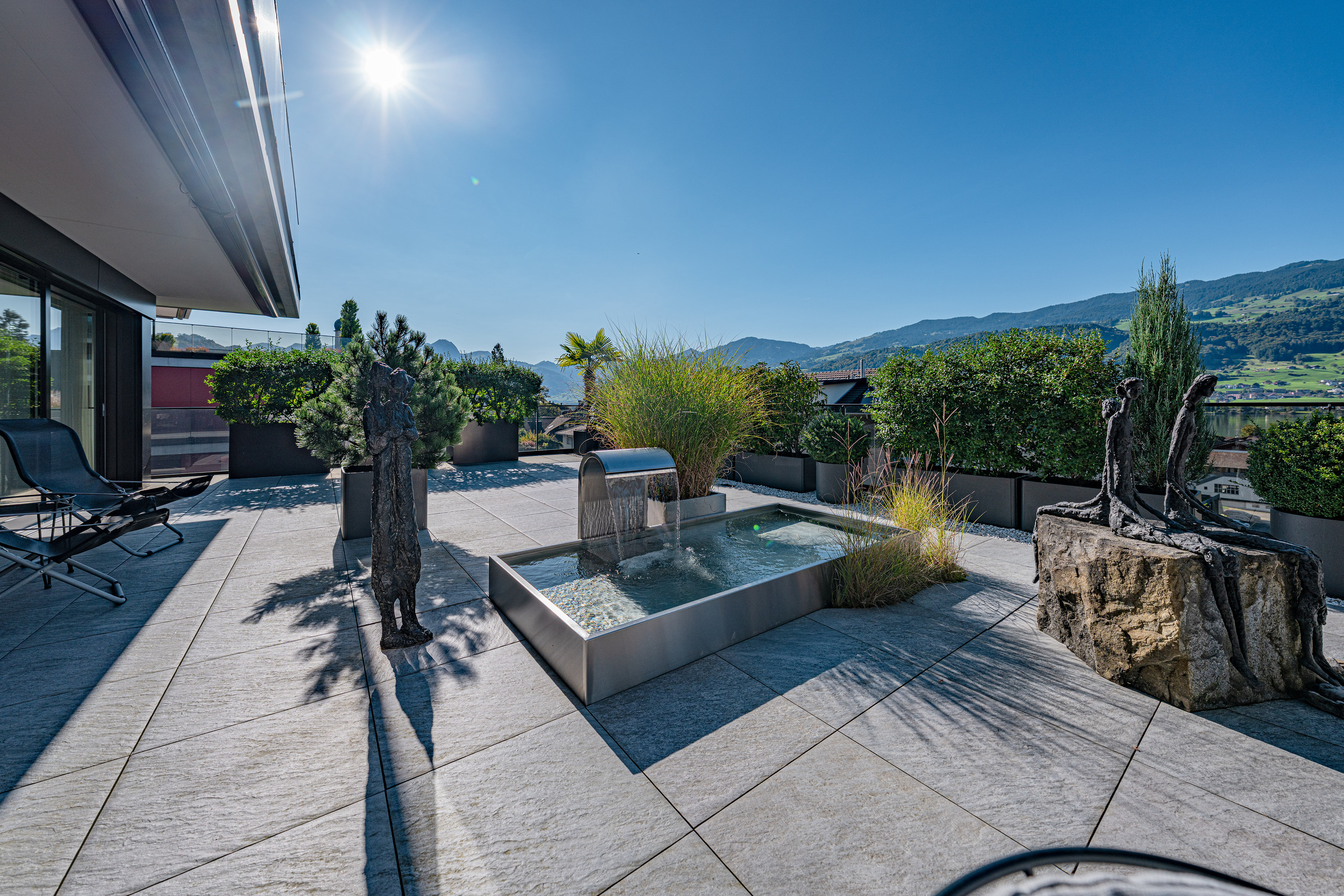 - Unvergleichliche Terrasse von ausserordentlicher Grösse: 210 m² mit verschiedenen Sitzbereichen, schöner Bepflanzung und einem idyllischen Terrassenbrunnen