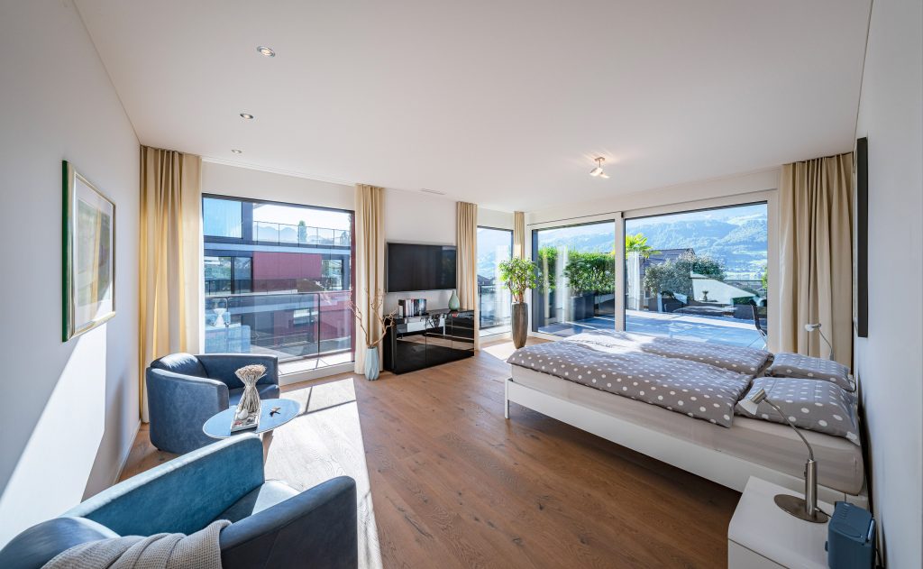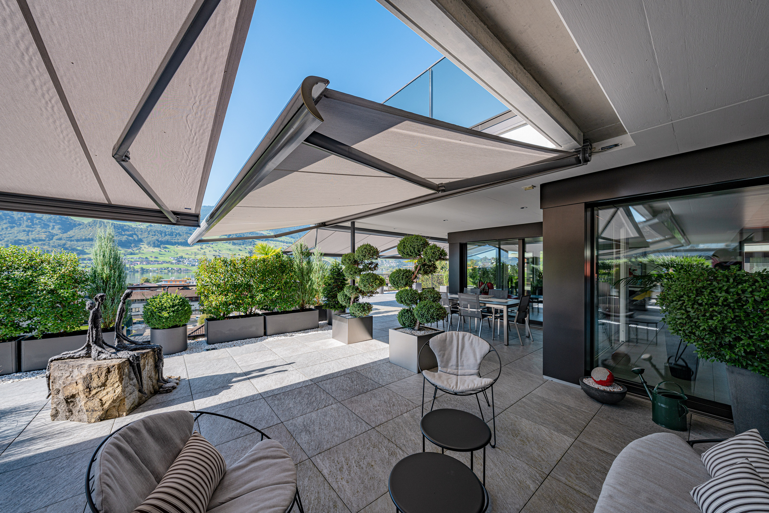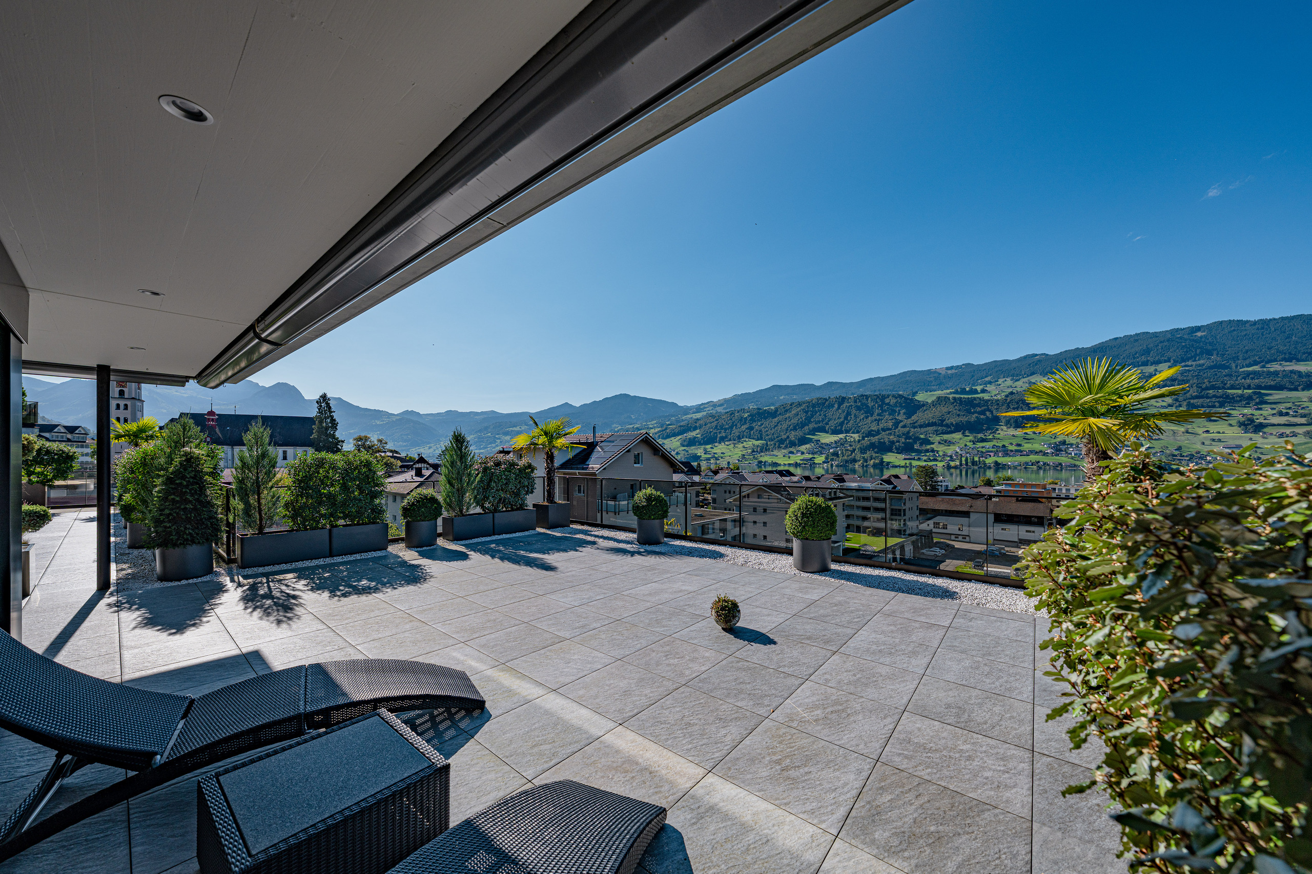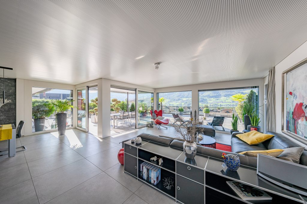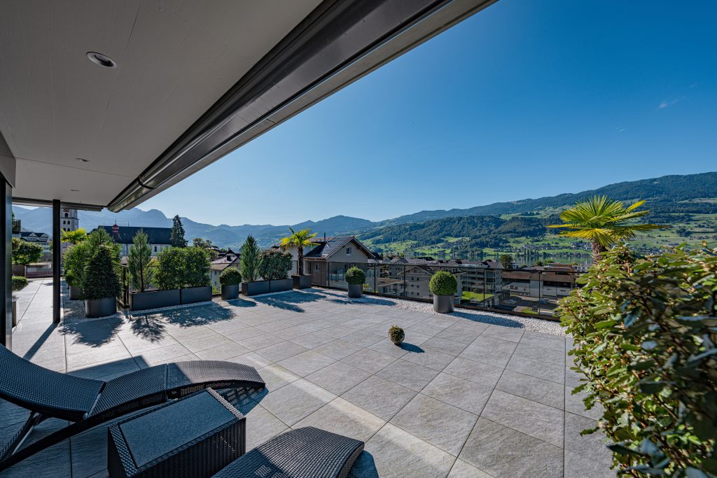 Der helle, weitläufige Wohn- und Essbereich mit grossen Glasfronten schafft ein offenes Raumgefühl und bietet direkten Zugang zur spektakulären 210 m² grossen Terrasse. Diese einzigartige Aussenfläche besticht durch mehrere Sitzbereiche, eine aufwändige Bepflanzung und einen charmanten Terrassenbrunnen – ein Rückzugsort, der jeden Tag zu einem kleinen Urlaub macht.