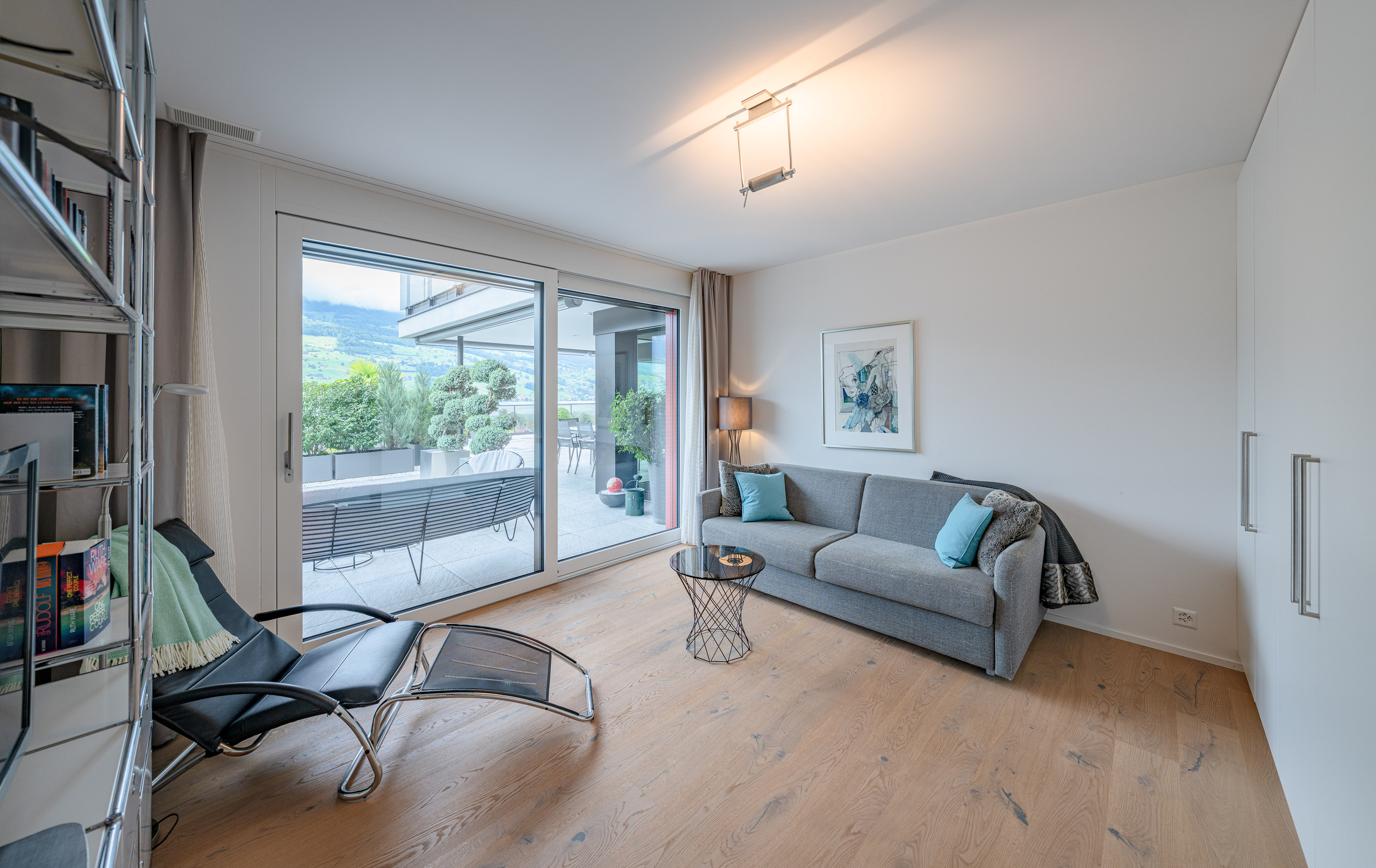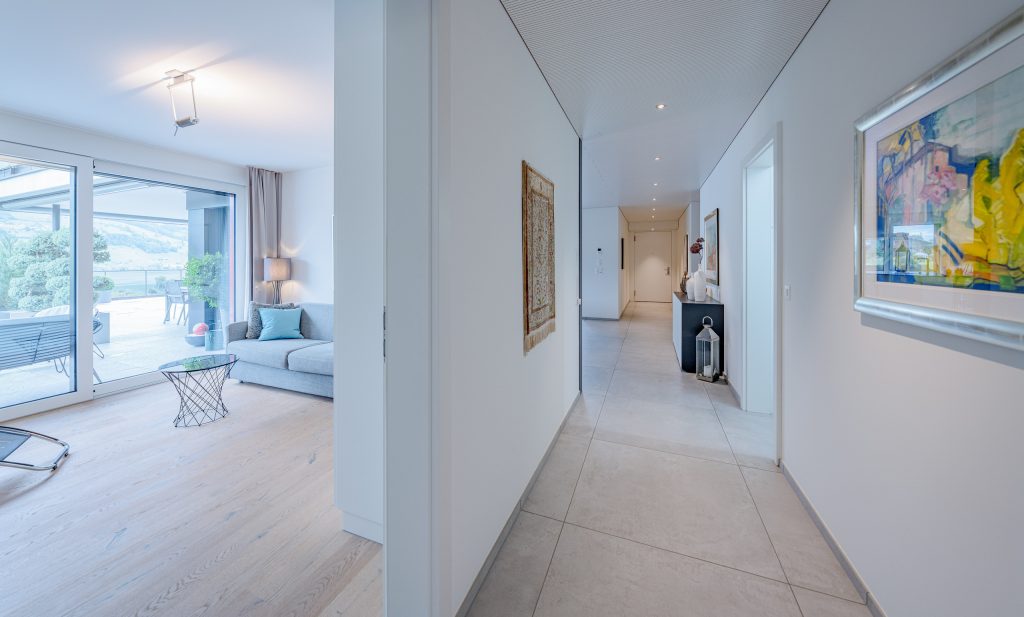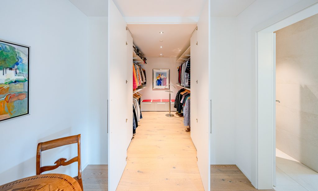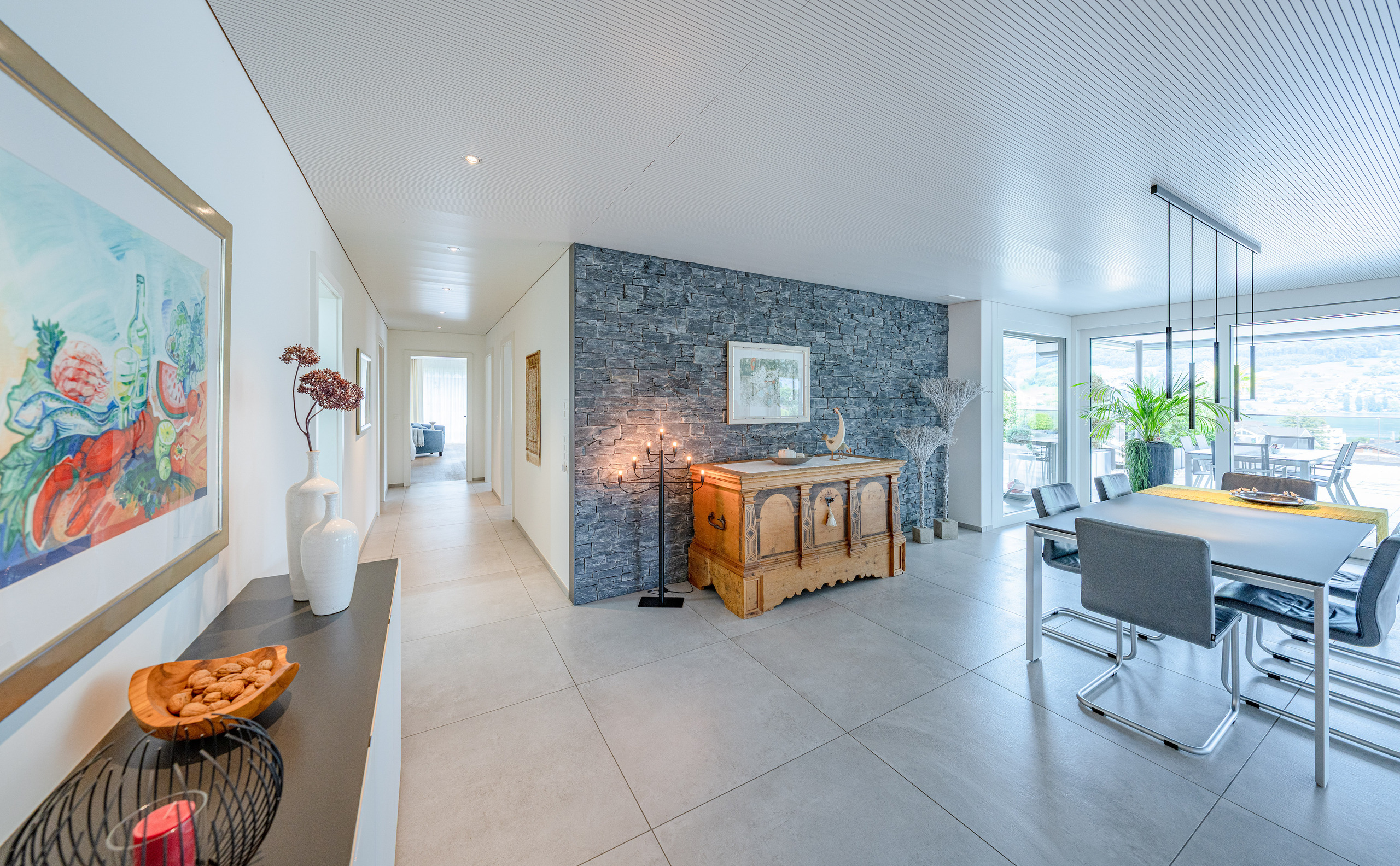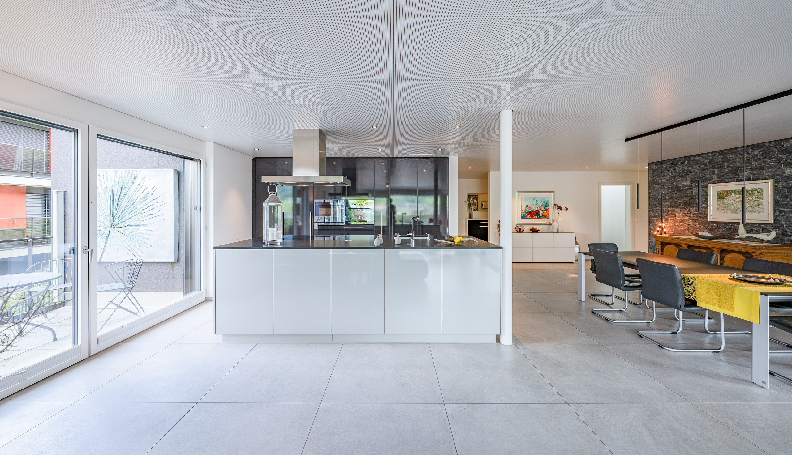 Der helle, weitläufige Wohn- und Essbereich mit grossen Glasfronten schafft ein offenes Raumgefühl und bietet direkten Zugang zur spektakulären 210 m² grossen Terrasse. Diese einzigartige Aussenfläche besticht durch mehrere Sitzbereiche, eine aufwändige Bepflanzung und einen charmanten Terrassenbrunnen – ein Rückzugsort, der jeden Tag zu einem kleinen Urlaub macht.