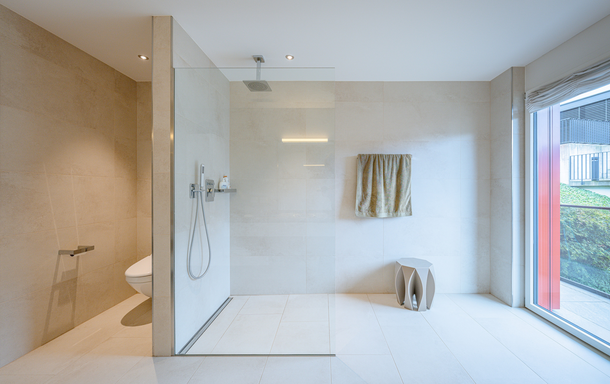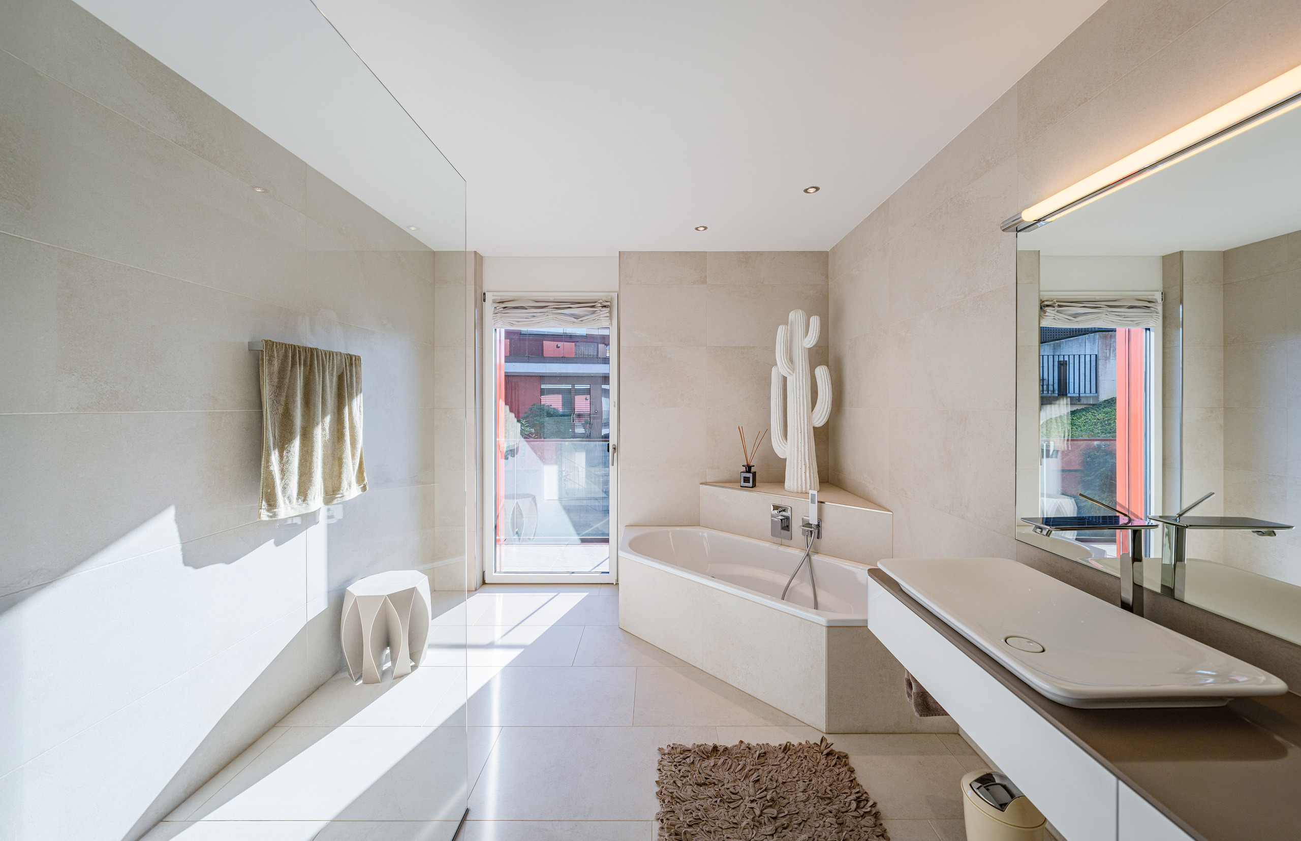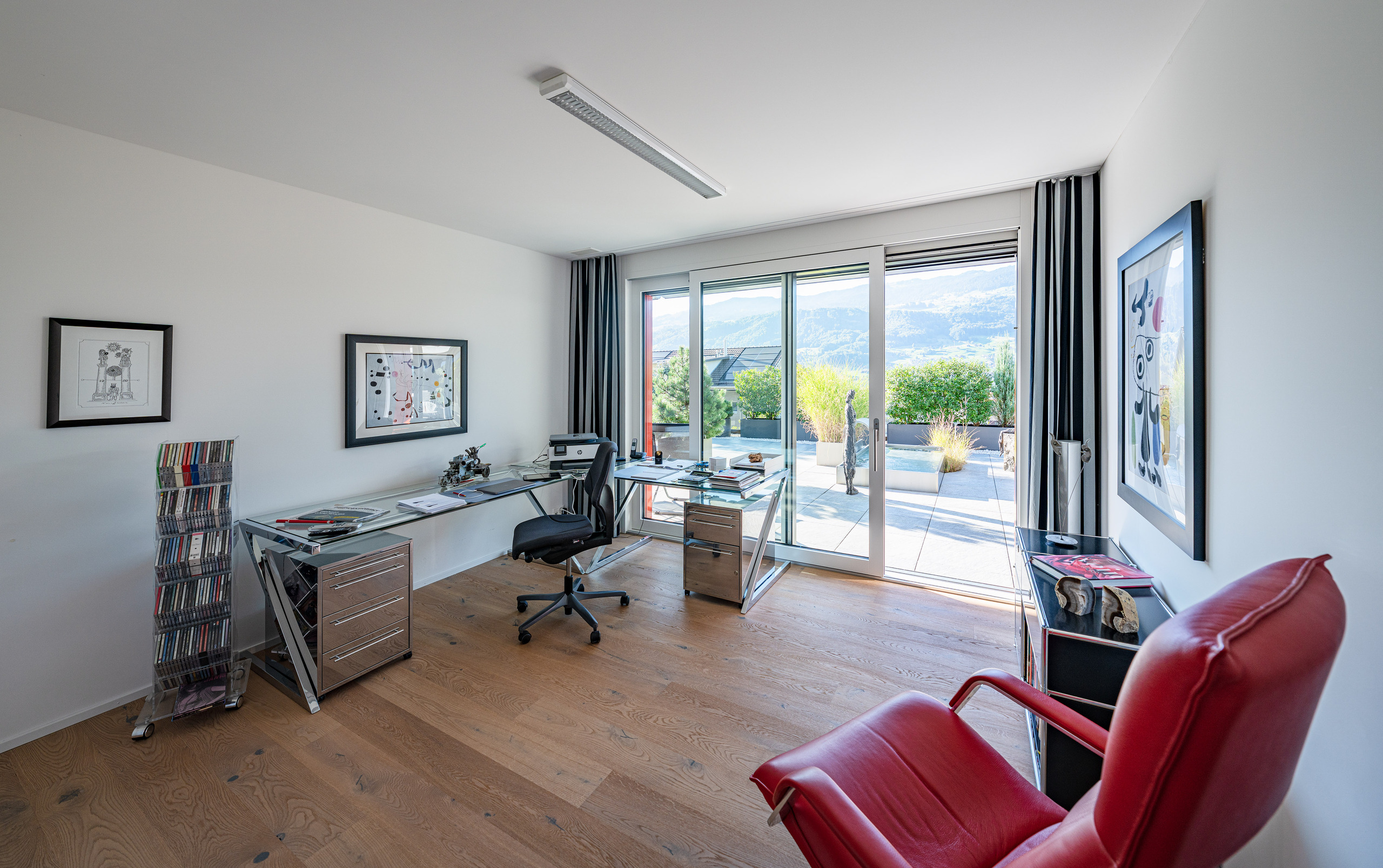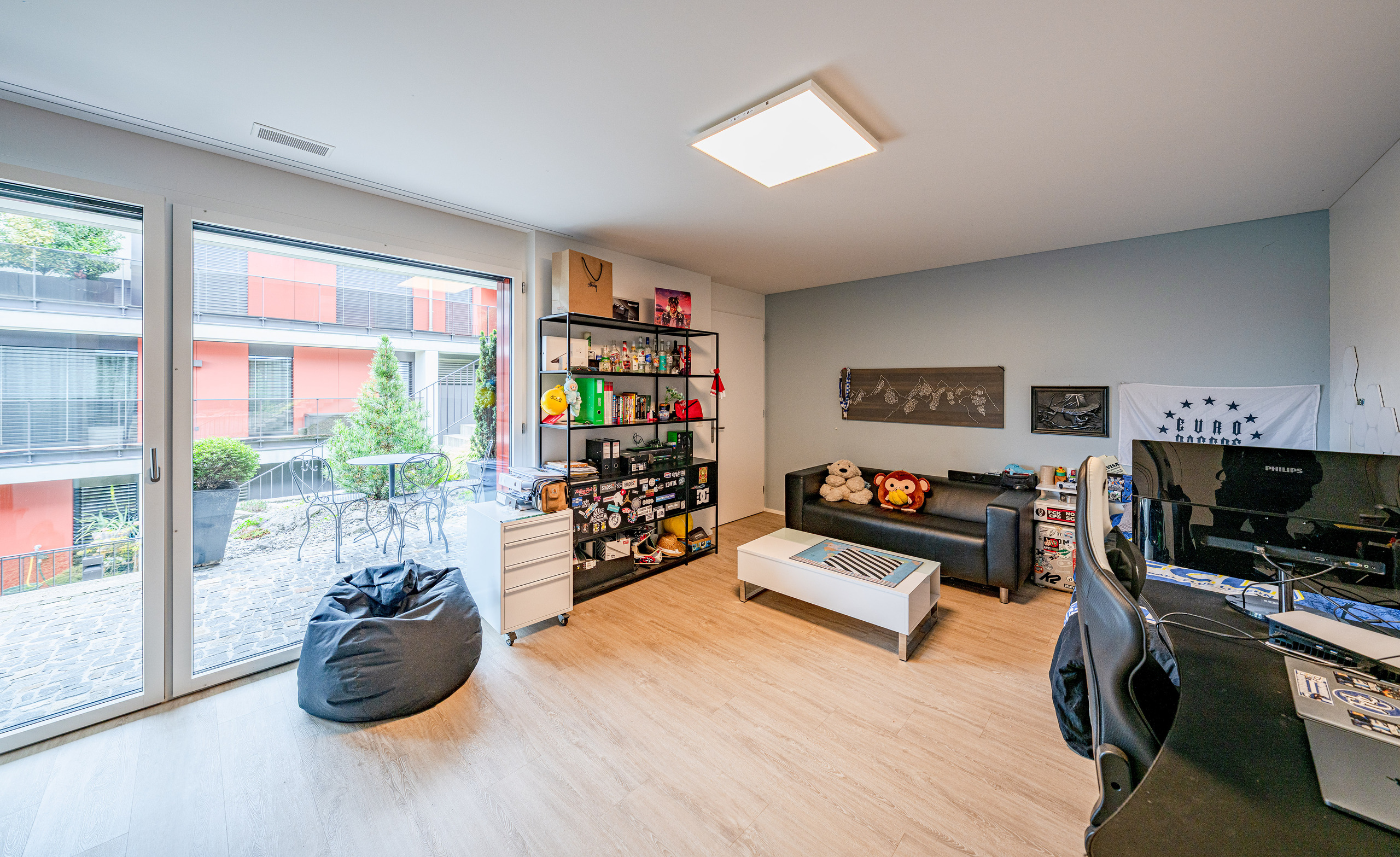 Der helle, weitläufige Wohn- und Essbereich mit grossen Glasfronten schafft ein offenes Raumgefühl und bietet direkten Zugang zur spektakulären 210 m² grossen Terrasse. Diese einzigartige Aussenfläche besticht durch mehrere Sitzbereiche, eine aufwändige Bepflanzung und einen charmanten Terrassenbrunnen – ein Rückzugsort, der jeden Tag zu einem kleinen Urlaub macht.
