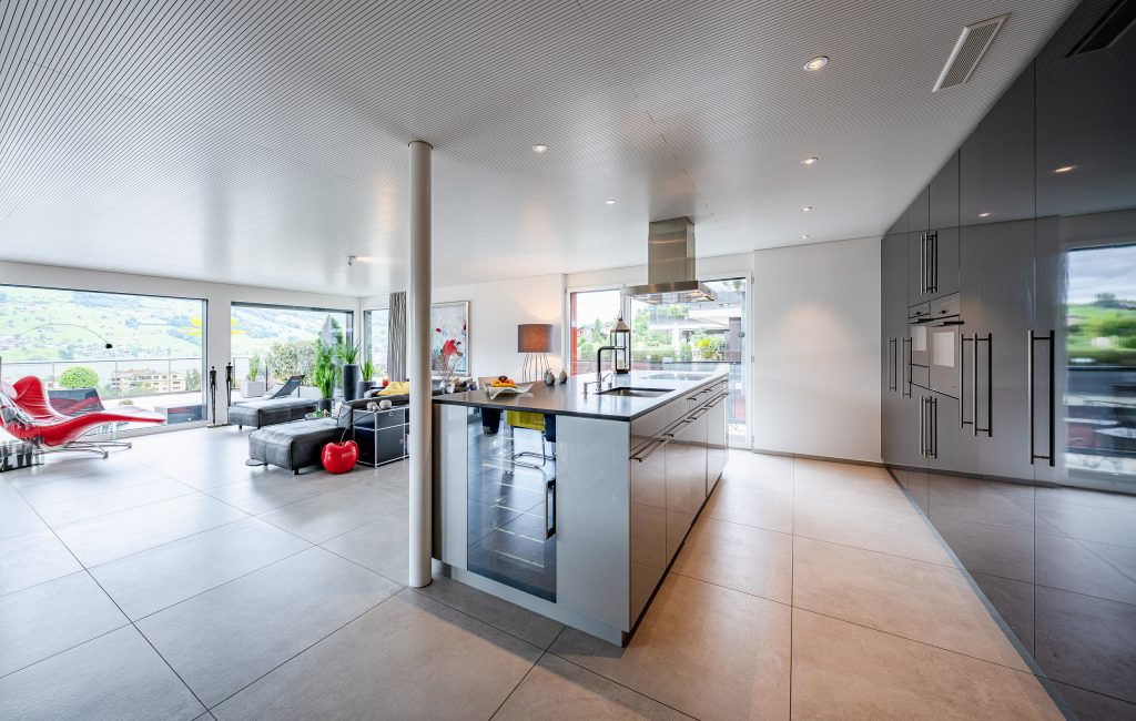 Die offene Designerküche mit Kücheninsel und modernsten Geräten – darunter ein Weinkühlschrank – verbindet Funktionalität mit Stil. Modernste und nachhaltige Haustechnik in Minergie-Bauweise, ergänzt durch eine Photovoltaikanlage mit Batteriespeicher, sorgt für energieeffizientes Wohnen und tiefe Betriebskosten.