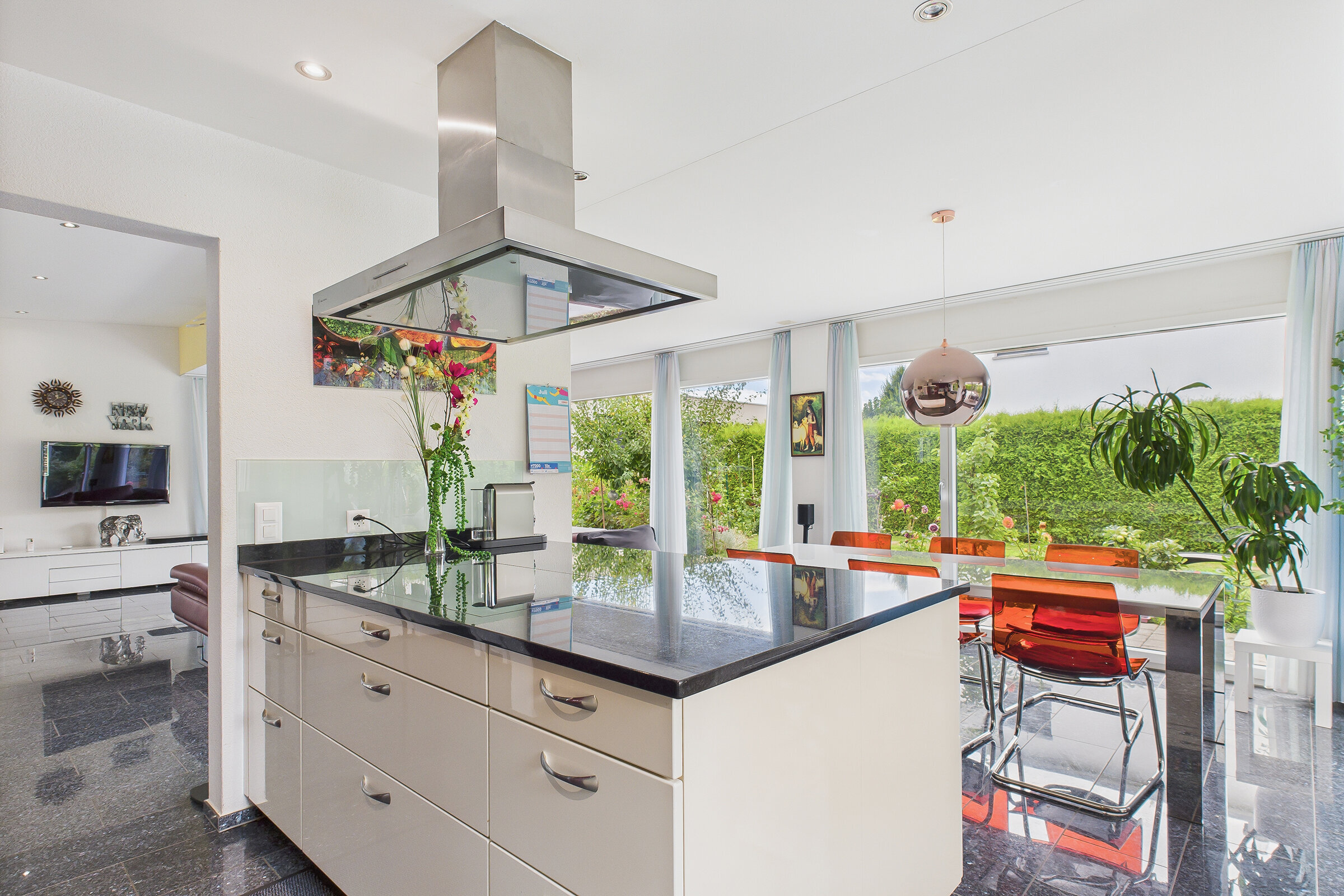 Das Wohnzimmer begeistert mit Weitsicht und einem schönen Blick auf den Sempachersee. Grosszügige Fensterflächen lassen viel Tageslicht herein und unterstreichen die ruhige, elegante Atmosphäre. Der hochwertige Innenausbau mit Steinboden im gesamten Haus verleiht der Villa eine zeitlose und zugleich moderne Ausstrahlung. Die Liegenschaft befindet sich dank stetiger Renovationen in sehr gutem Zustand.
