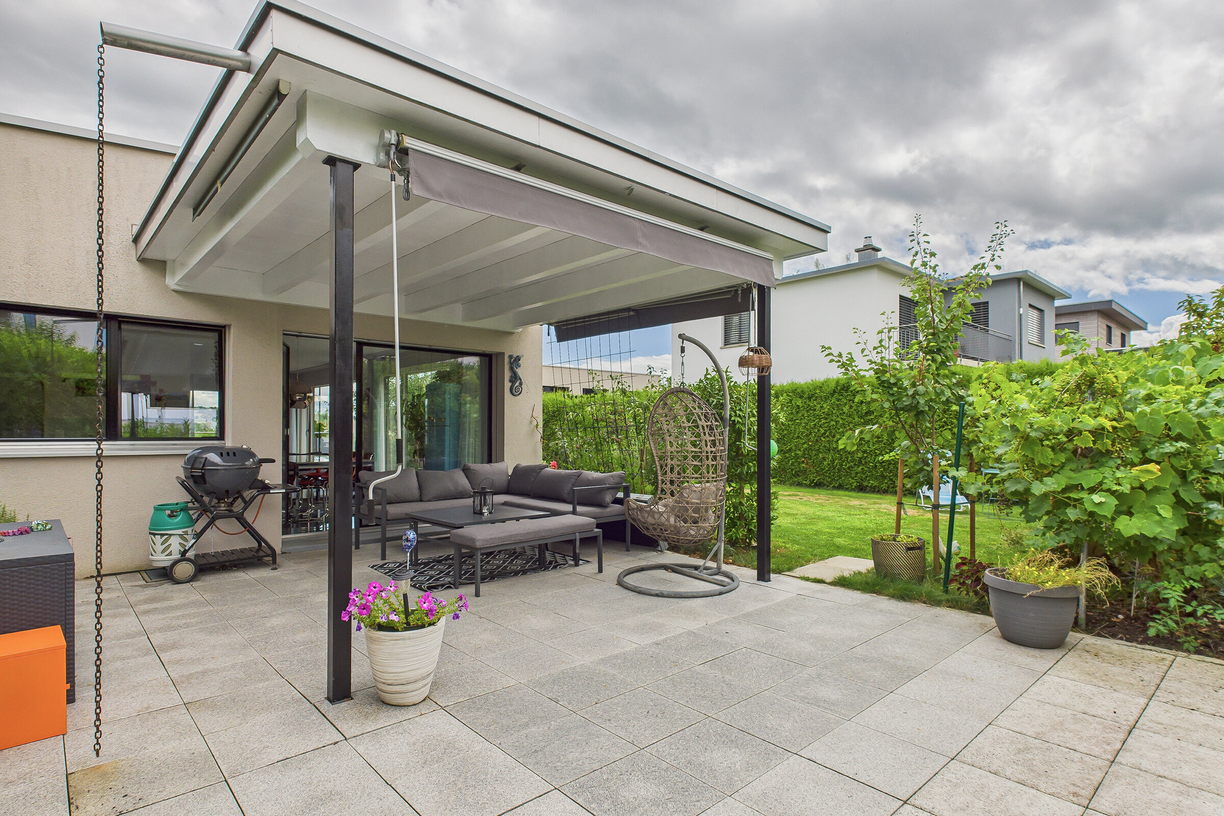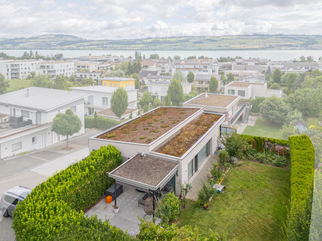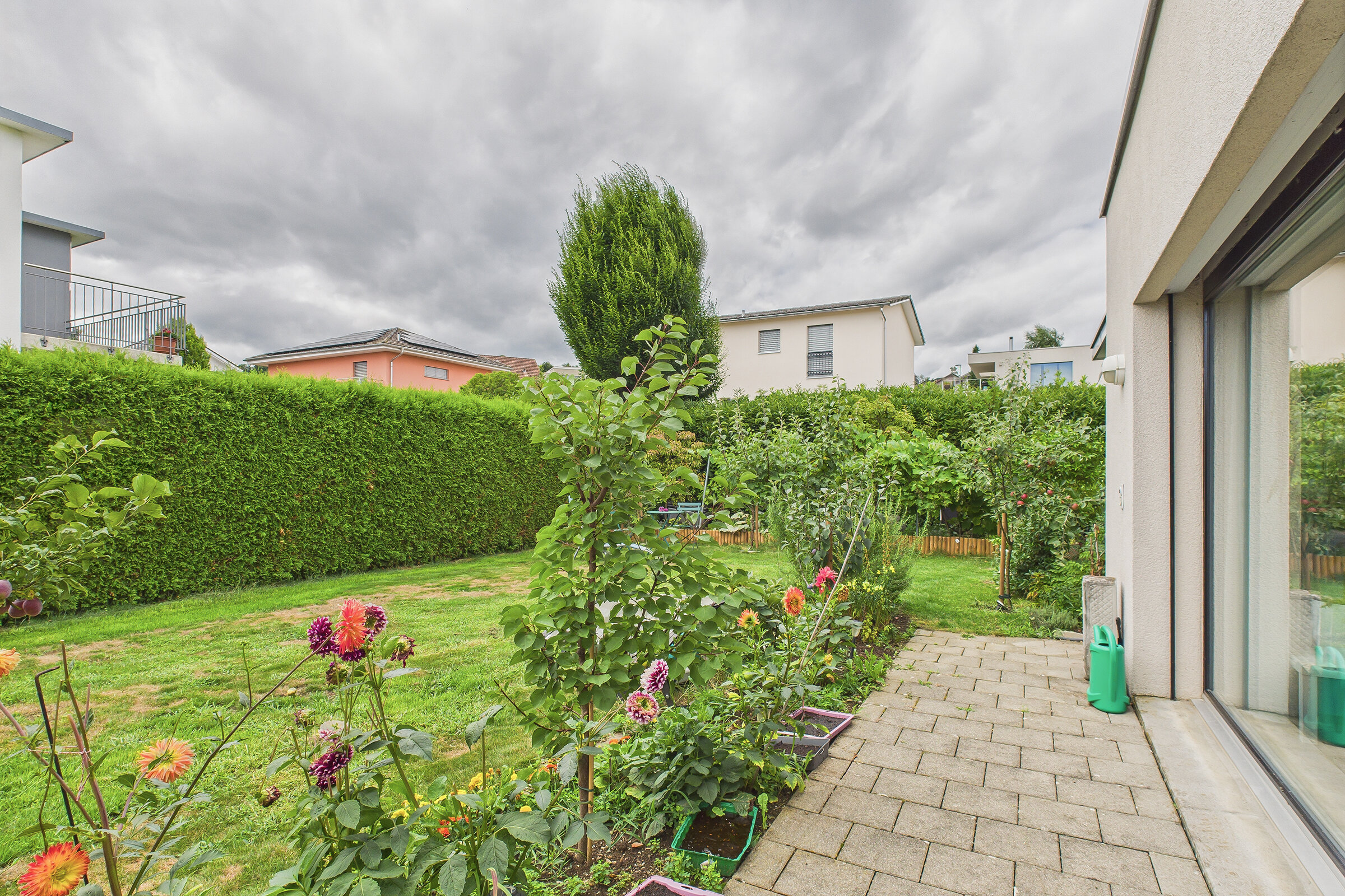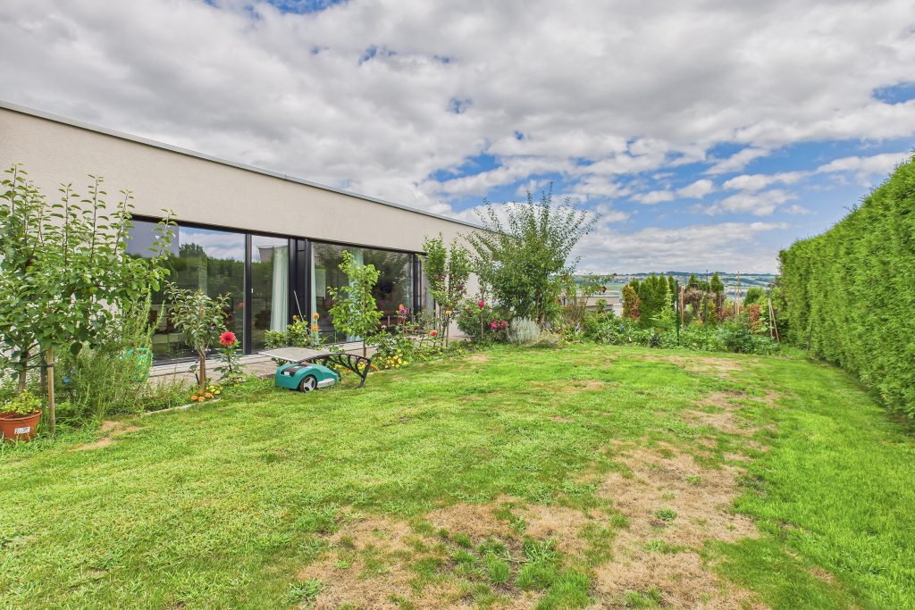 Auch der Aussenbereich überzeugt durch Qualität und Vielfalt. Eine gedeckte Terrasse im Obergeschoss lädt zum Verweilen mit Aussicht ein, während im Erdgeschoss ein grosser gedeckter Sitzplatz den Wohnraum nach draussen erweitert. Der pflegeleichte Rasen und ein liebevoll angelegter Gemüsegarten bieten Raum für Erholung, Spiel oder eigenes Gärtnern.