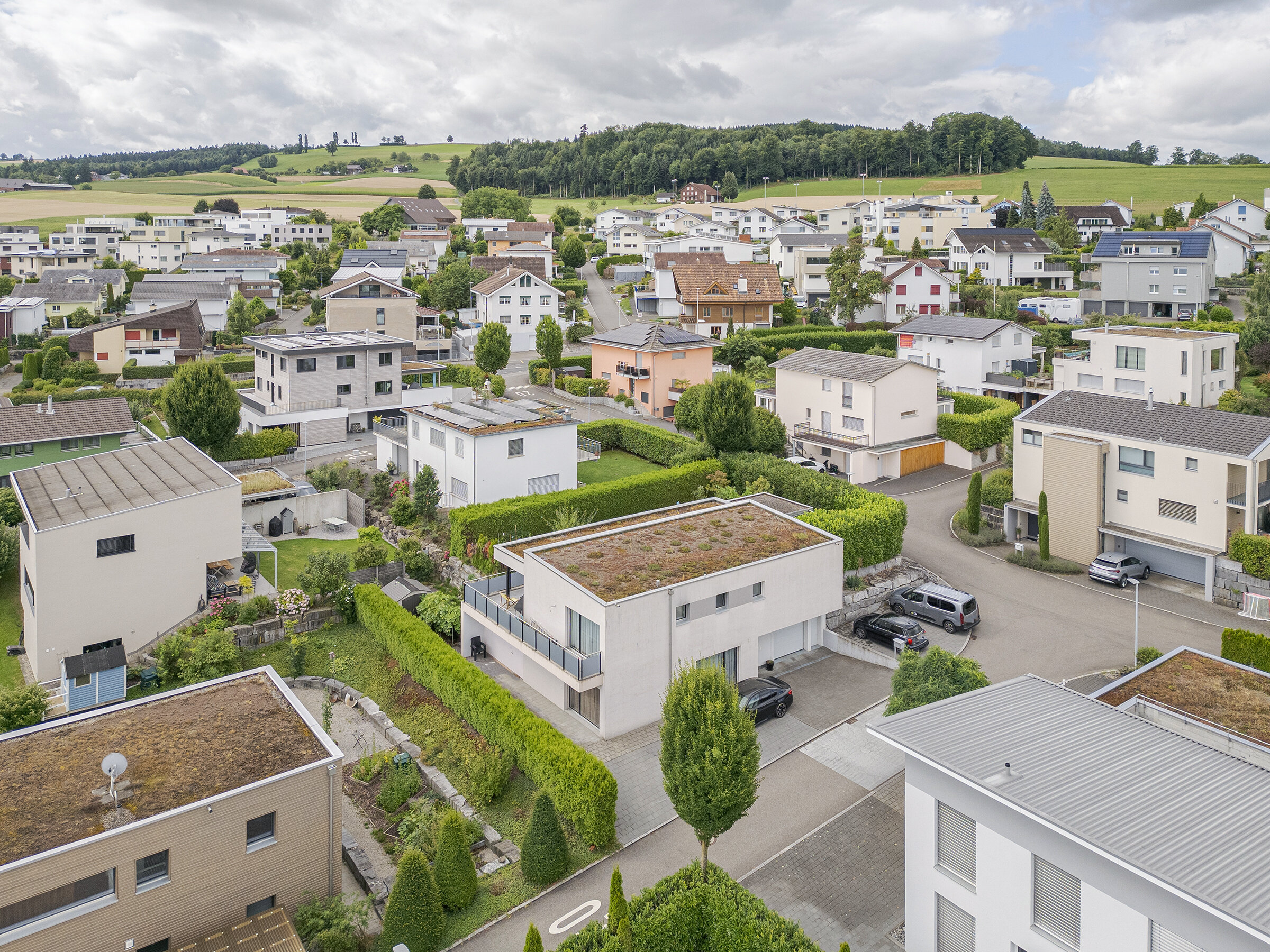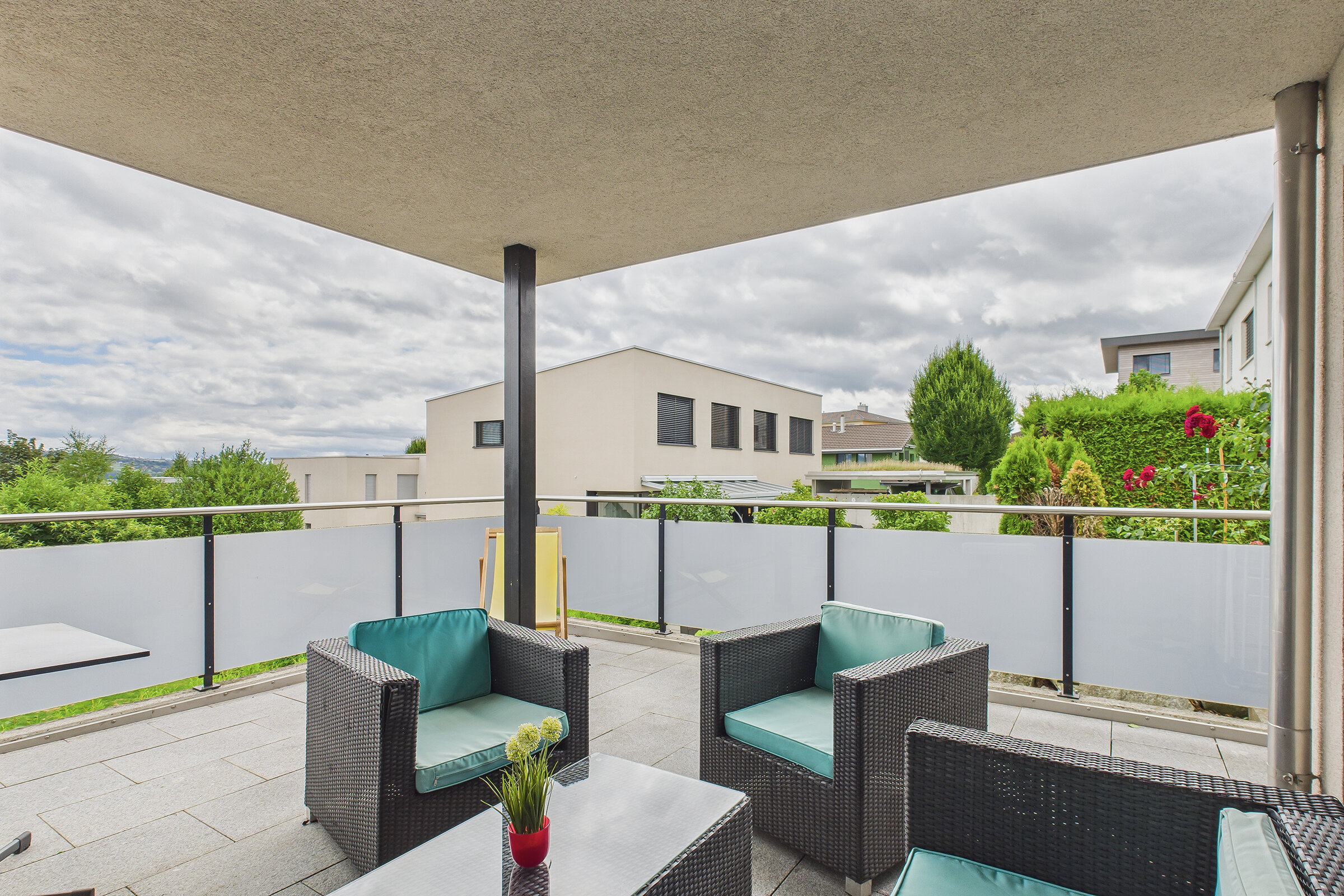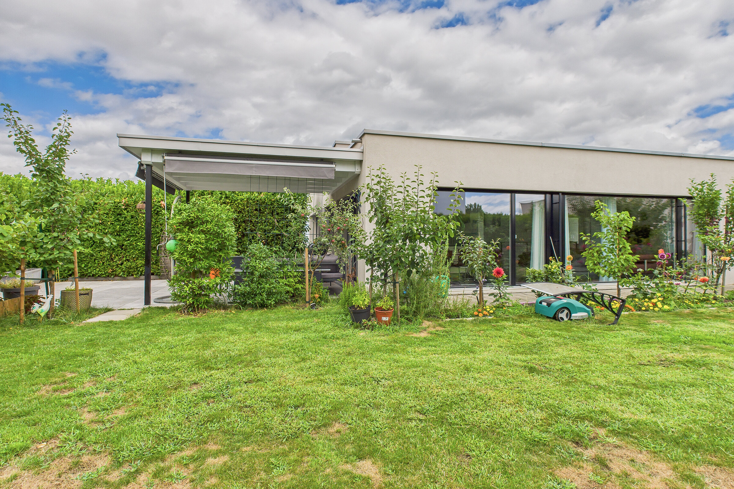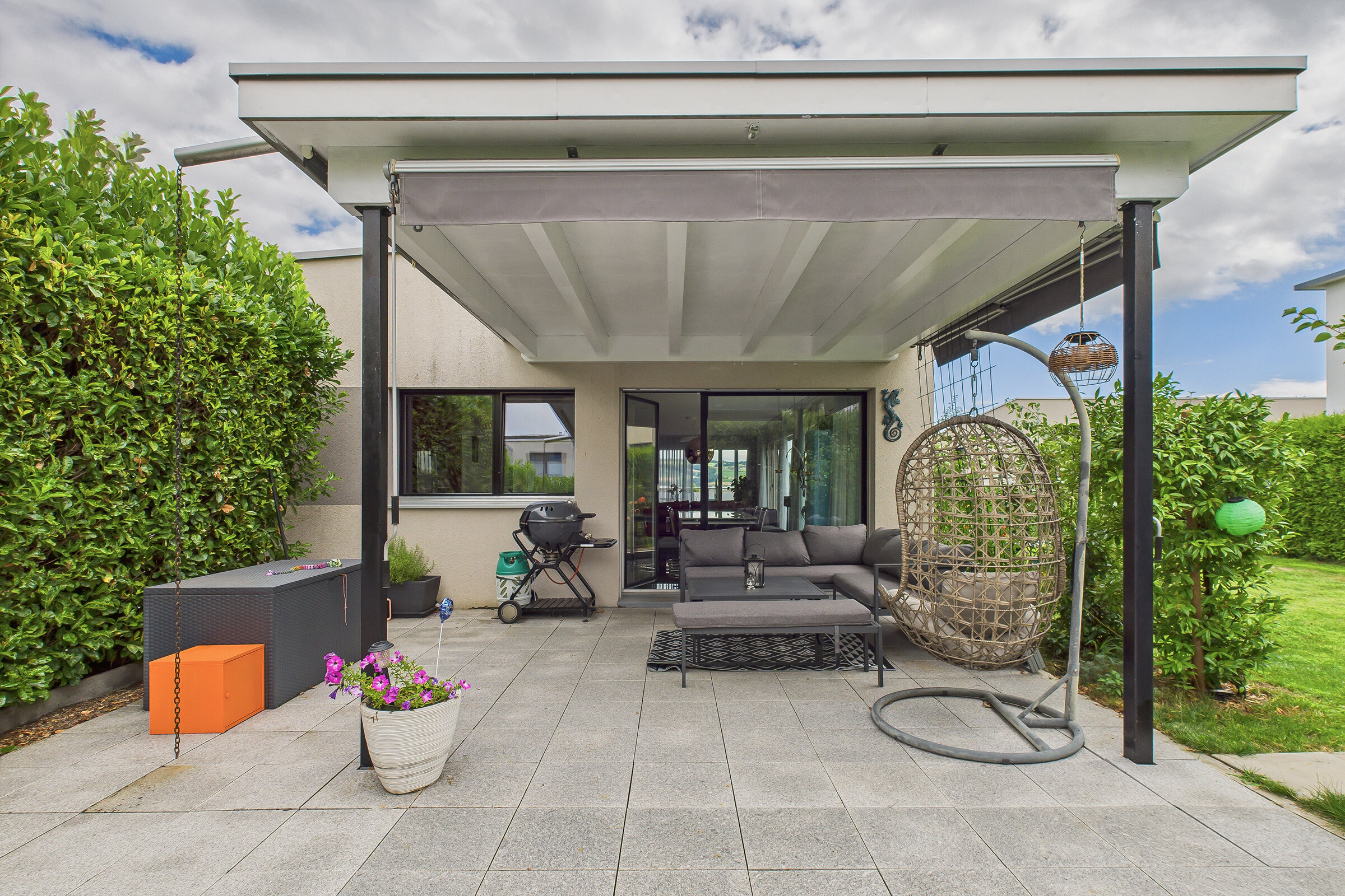 Auch der Aussenbereich überzeugt durch Qualität und Vielfalt. Eine gedeckte Terrasse im Obergeschoss lädt zum Verweilen mit Aussicht ein, während im Erdgeschoss ein grosser gedeckter Sitzplatz den Wohnraum nach draussen erweitert. Der pflegeleichte Rasen und ein liebevoll angelegter Gemüsegarten bieten Raum für Erholung, Spiel oder eigenes Gärtnern.
