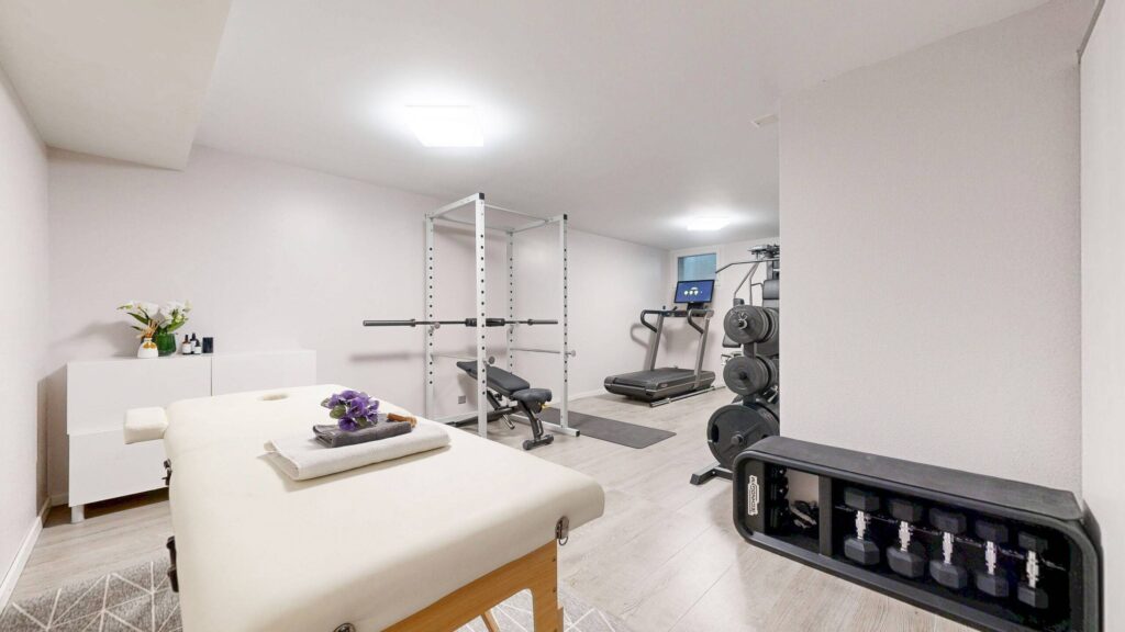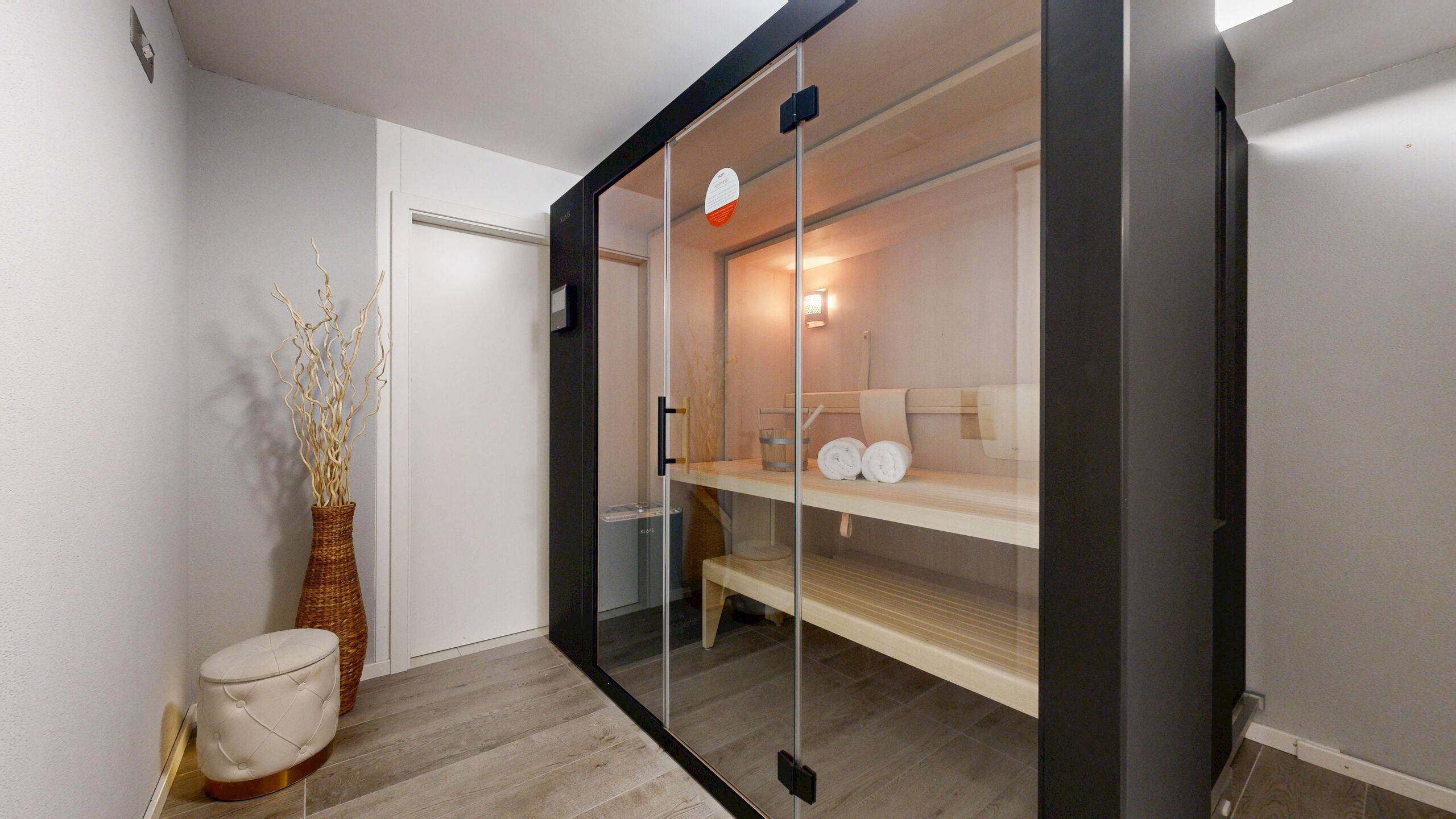 Wellness- und Fitnessliebhaber kommen ebenfalls auf ihre Kosten: Im Untergeschoss befinden sich eine Sauna sowie ein bestens ausgestatteter Fitnessraum.