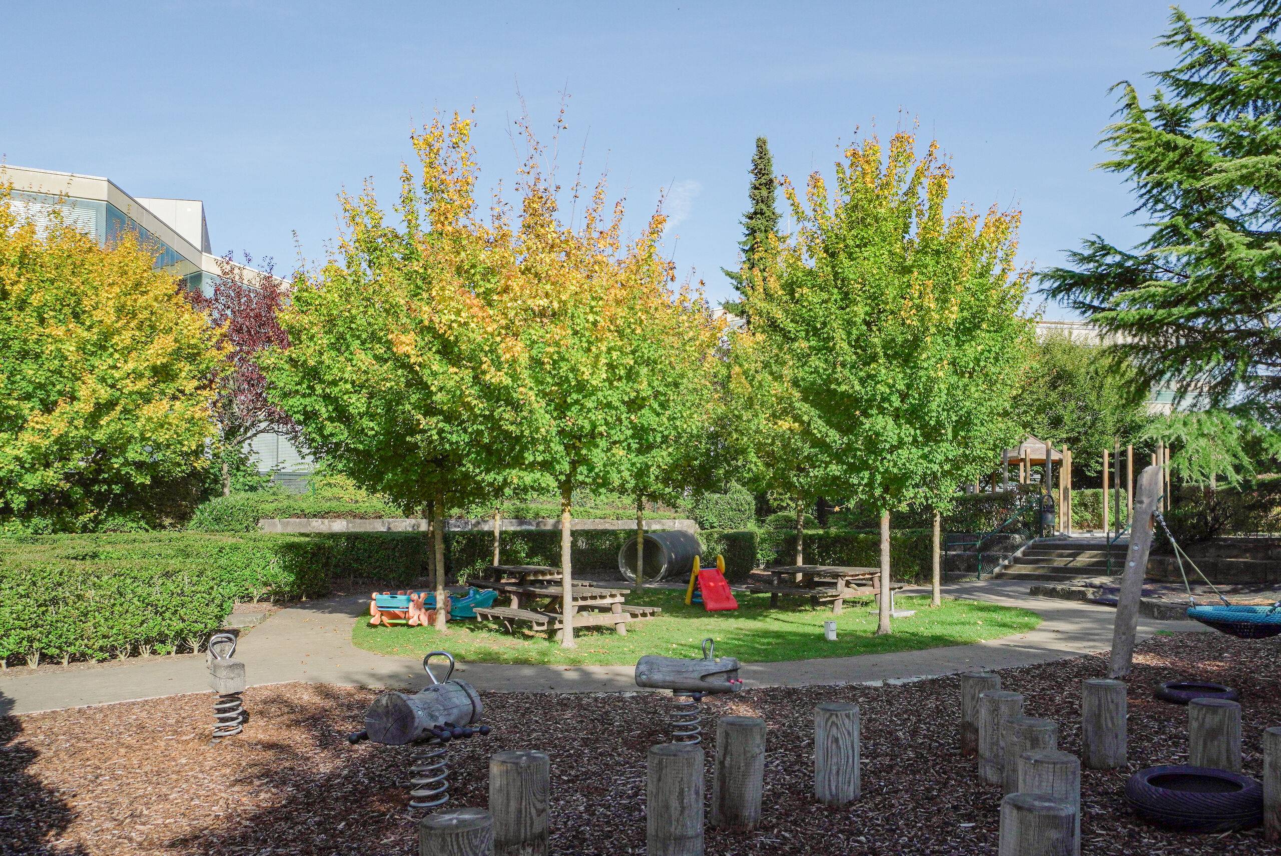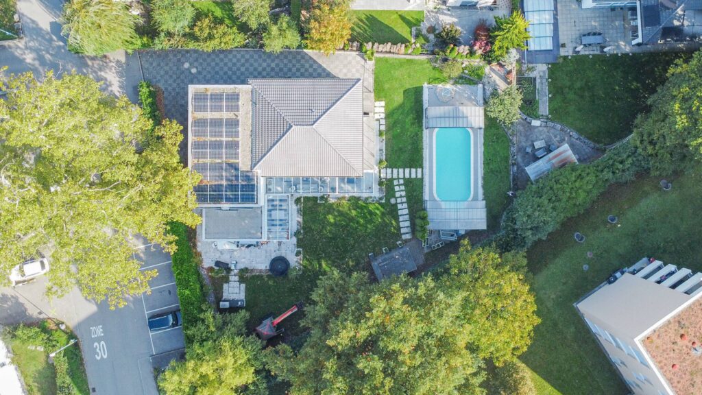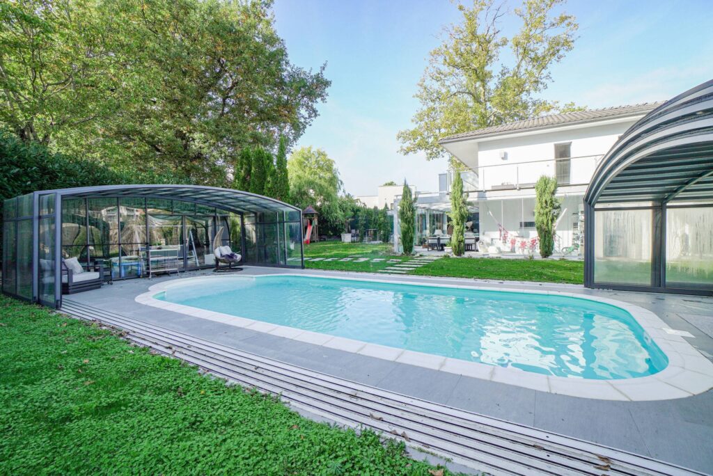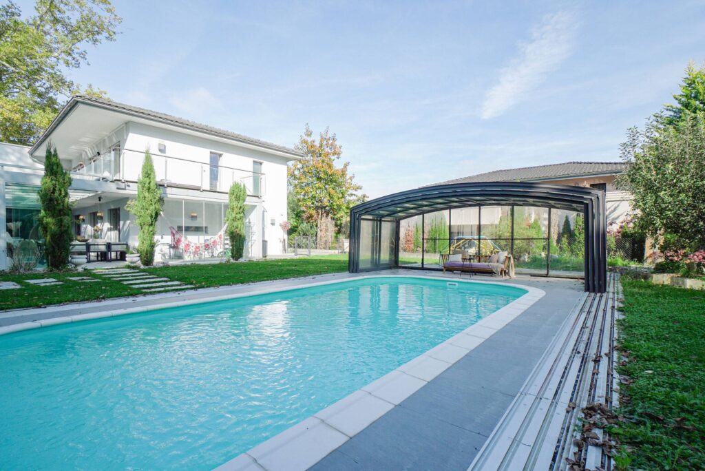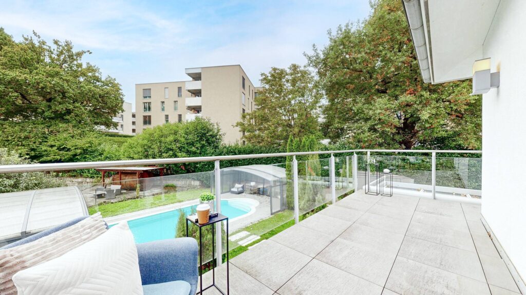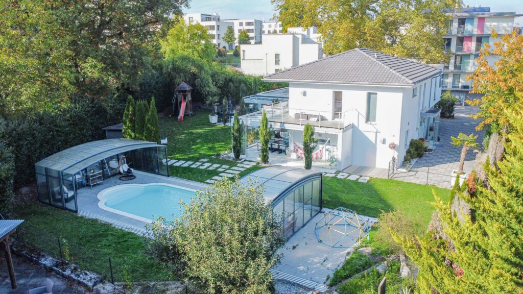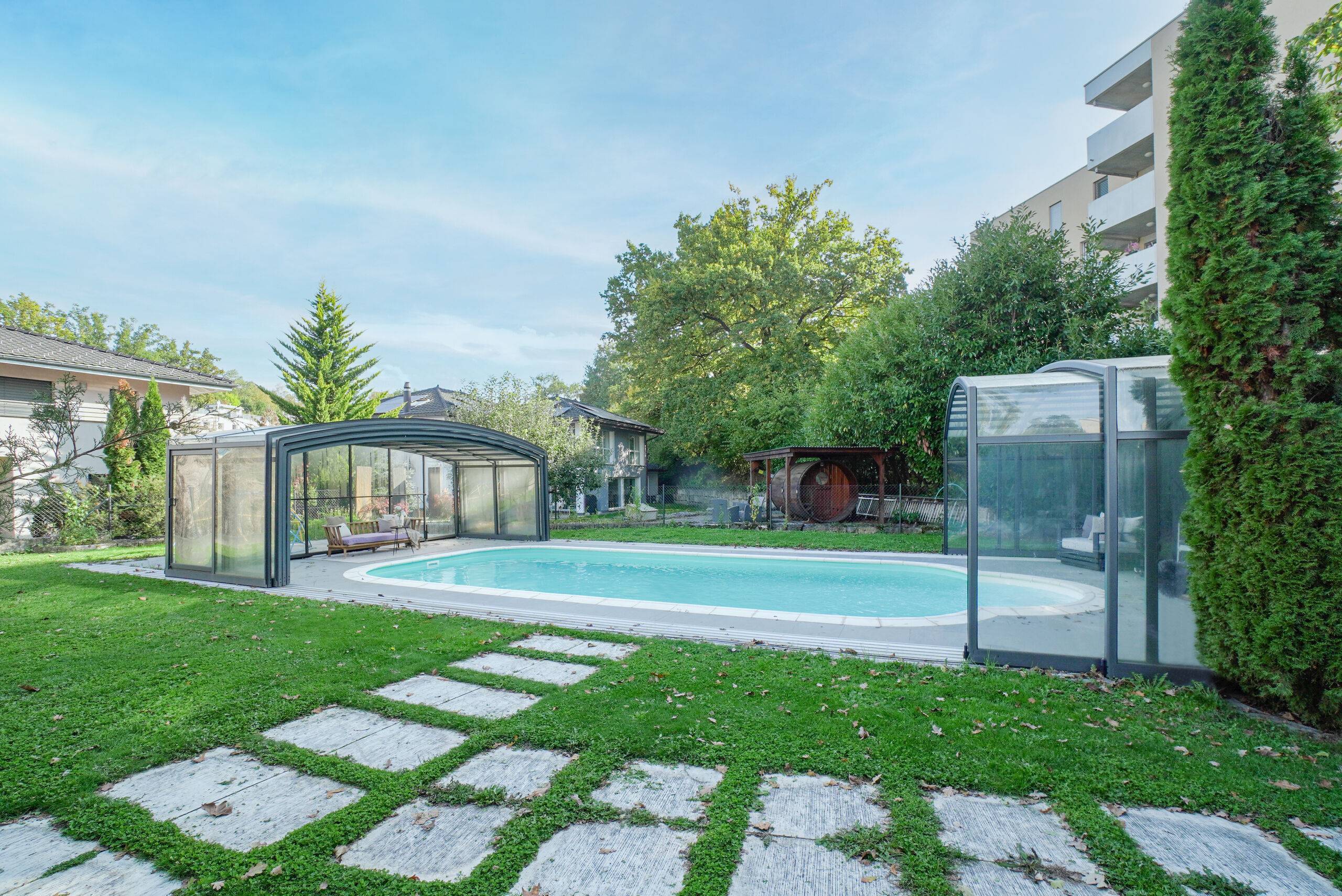 Der gepflegte Garten ist eine wahre Oase: Mehrere gemütliche Sitzplätze, ein grosser Swimmingpool und ein Spielplatz bieten Entspannung und Freizeitspass für Gross und Klein.