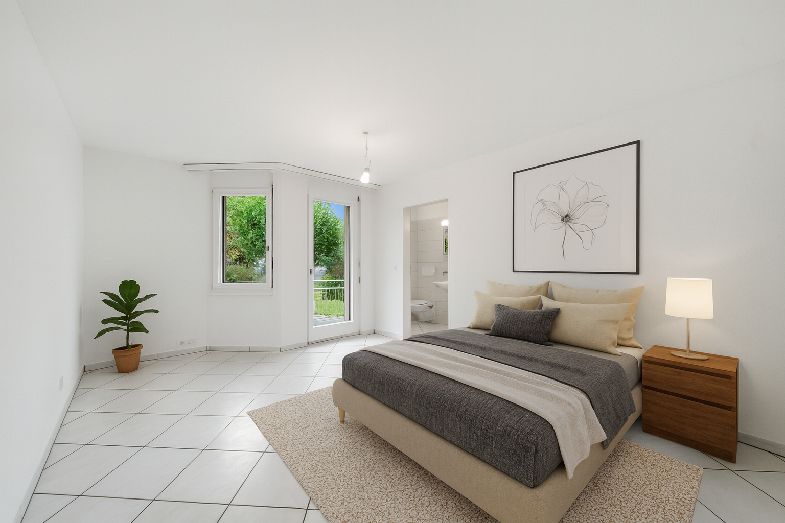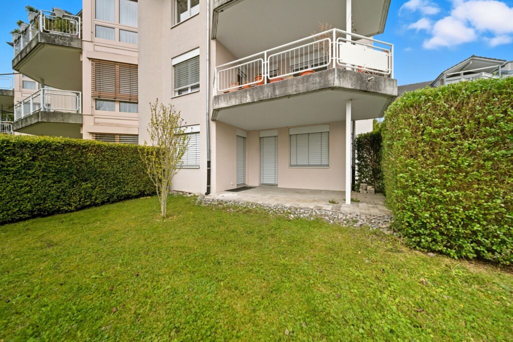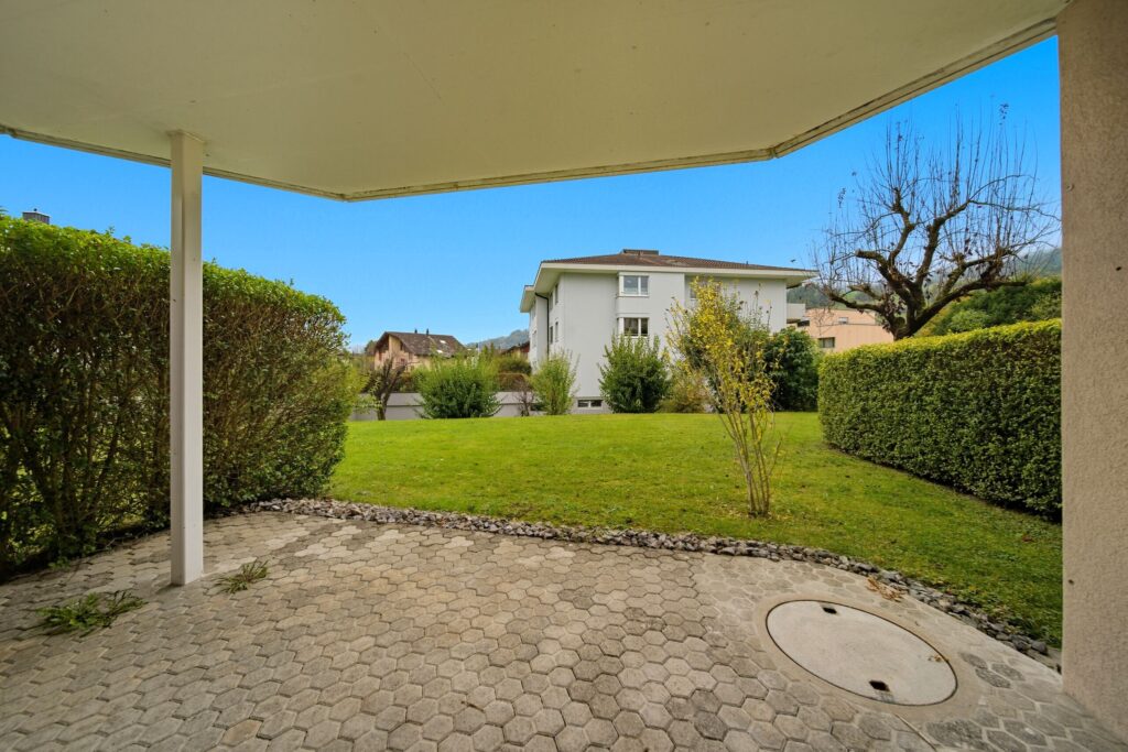 Das Highlight dieser Wohnung ist der rund 62 m² grosse Gartensitzplatz im Sonderrecht. Hier geniessen Sie sonnige Stunden mit Blick auf die malerische Berglandschaft – ein Ort, an dem man sich sofort zuhause fühlt.
