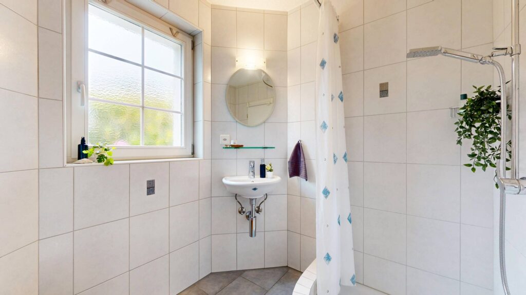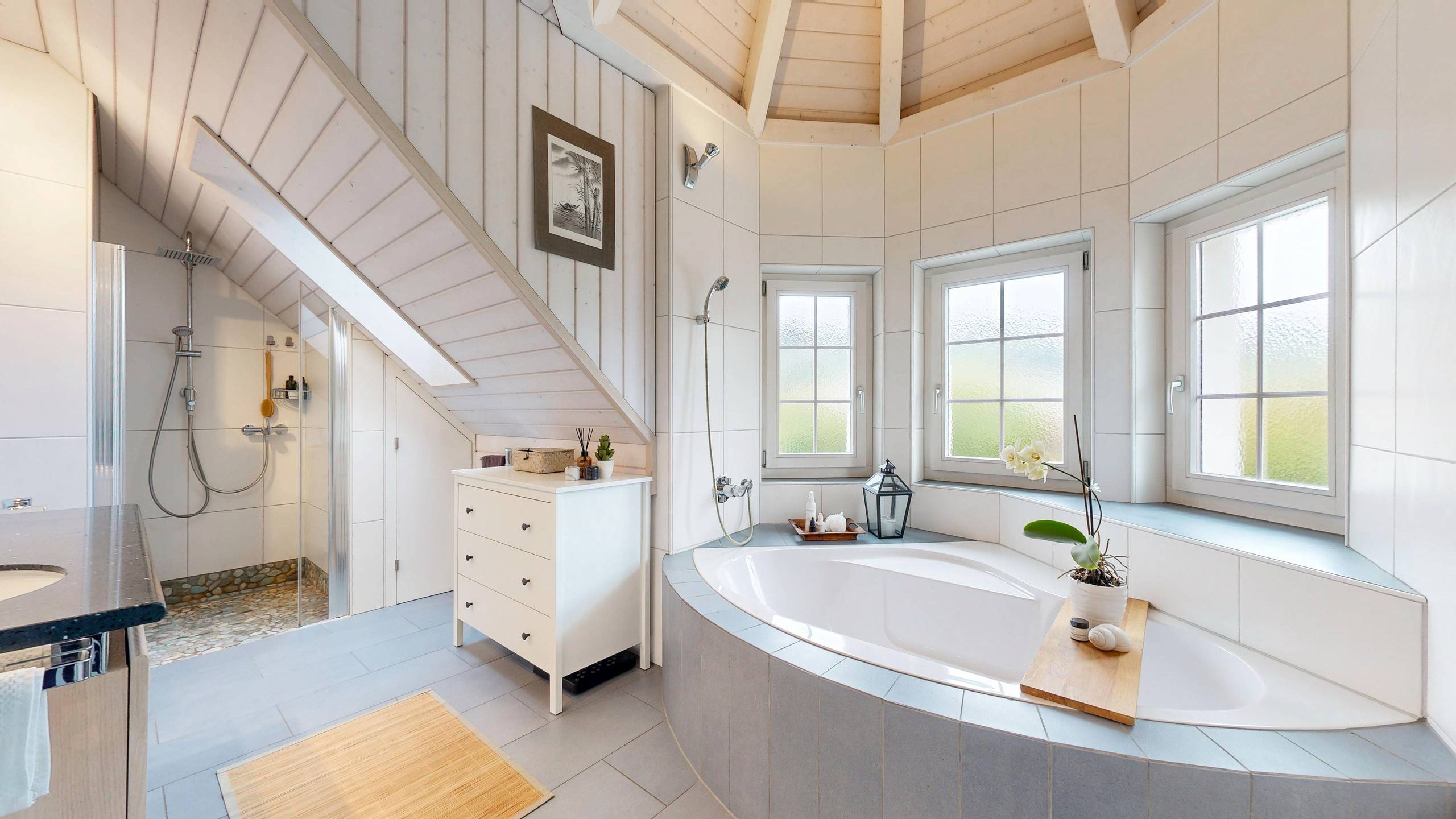 Zwei geschickt in den Erker integrierte Nassbereiche unterstreichen die architektonische Qualität. Im Erdgeschoss steht eine Dusche/WC zur Verfügung, im Obergeschoss ein Familienbad mit Bad, Dusche und WC. Die aussergewöhnliche Raumhöhe im Obergeschoss verleiht diesem Bereich ein besonders luftiges Wohngefühl.