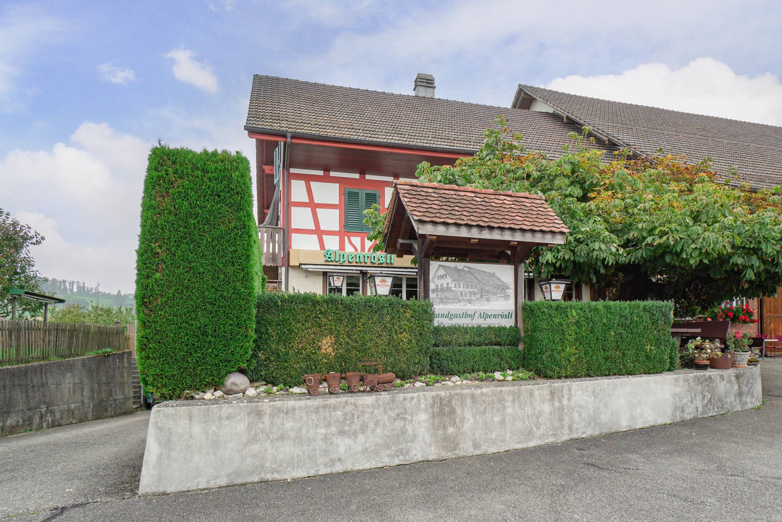 - Aussenbereich: Idyllischer Gartensitzplatz mit Rasen sowie einen Balkon
