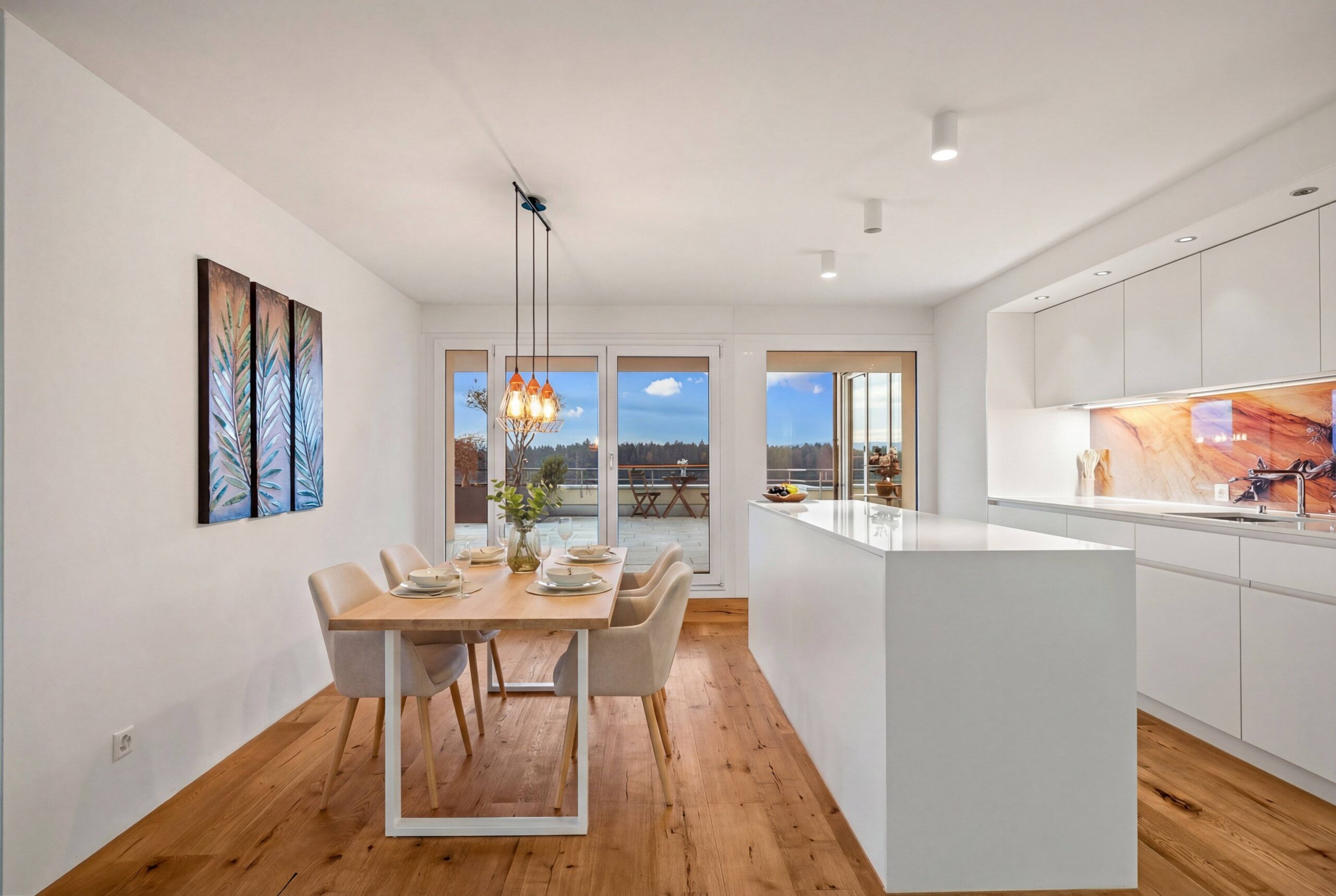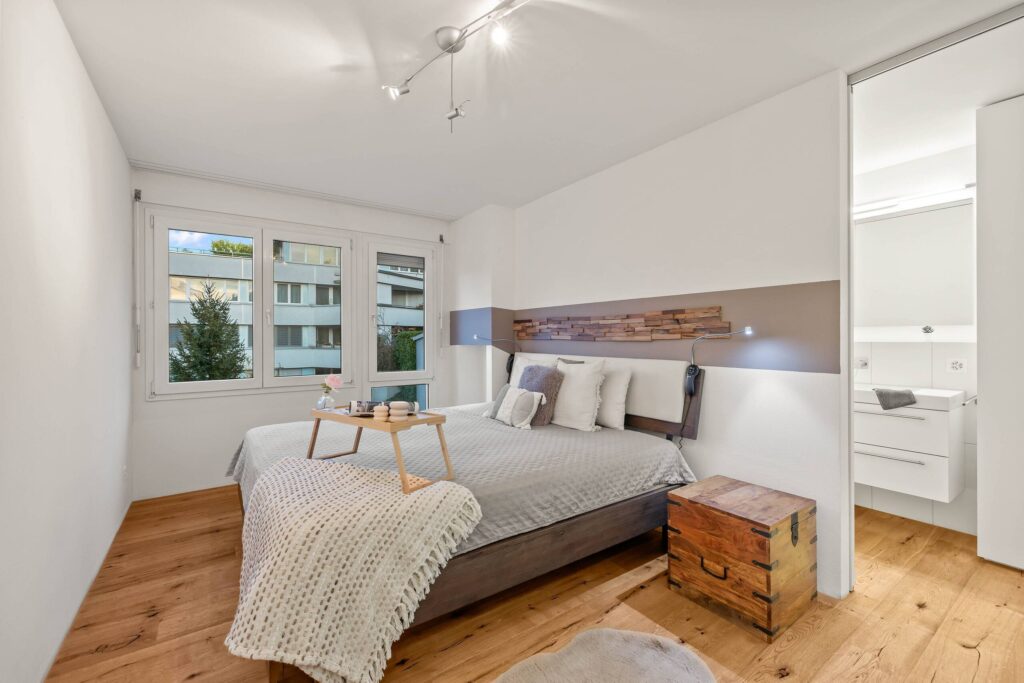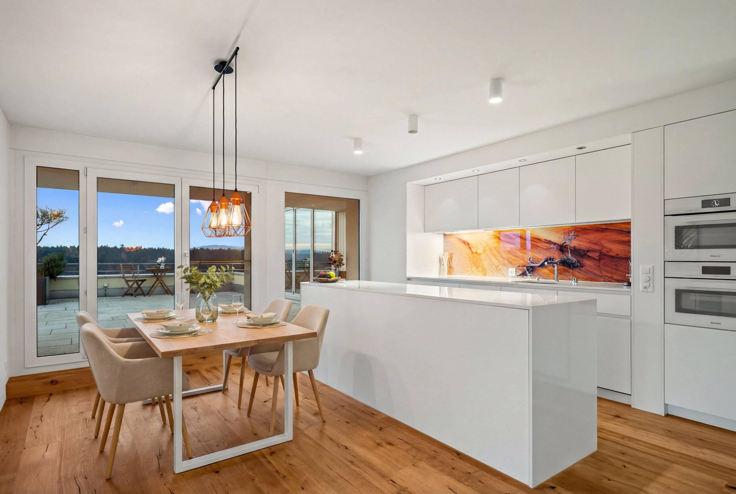 Die hochwertige Materialisierung mit Eichenparkett schafft eine warme Atmosphäre. Der Wohnbereich ist hell und einladend, mit direktem Zugang zur grosszügigen Sonnenterrasse, die mit ihren beeindruckenden 64 m² eine echte Erweiterung des Wohnraums darstellt. Hier geniesst man Weitsicht, Ruhe und viel Platz für Erholung im Freien.