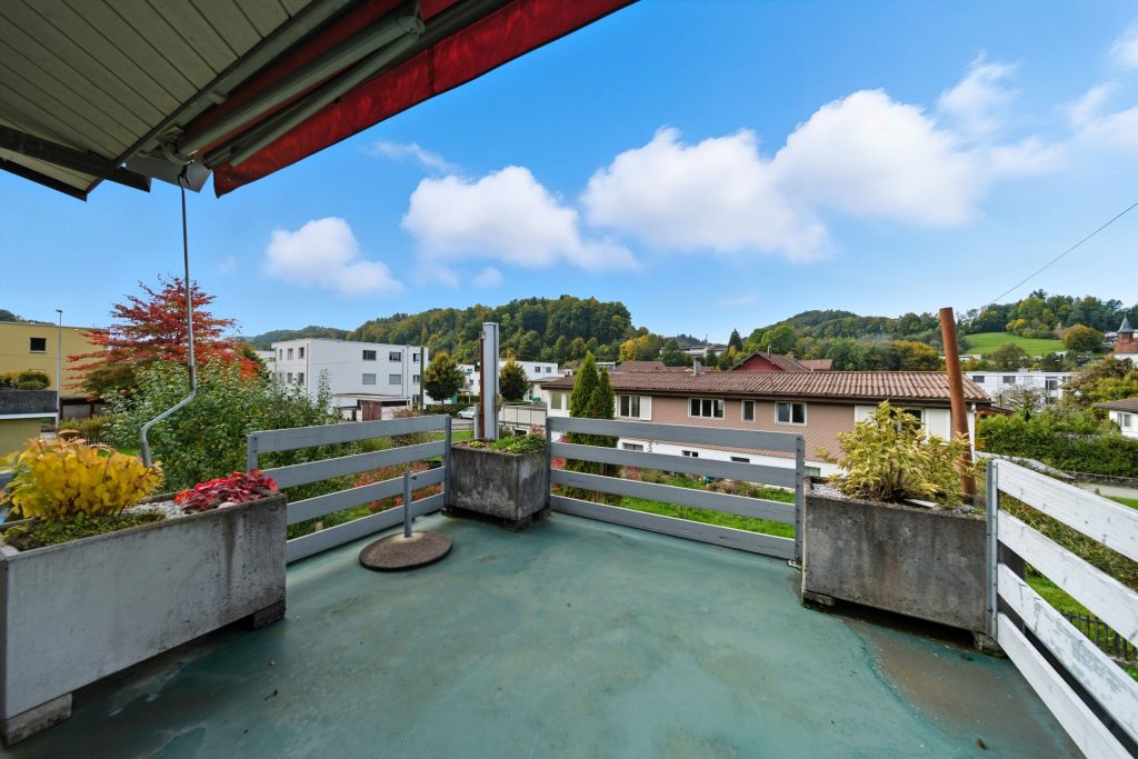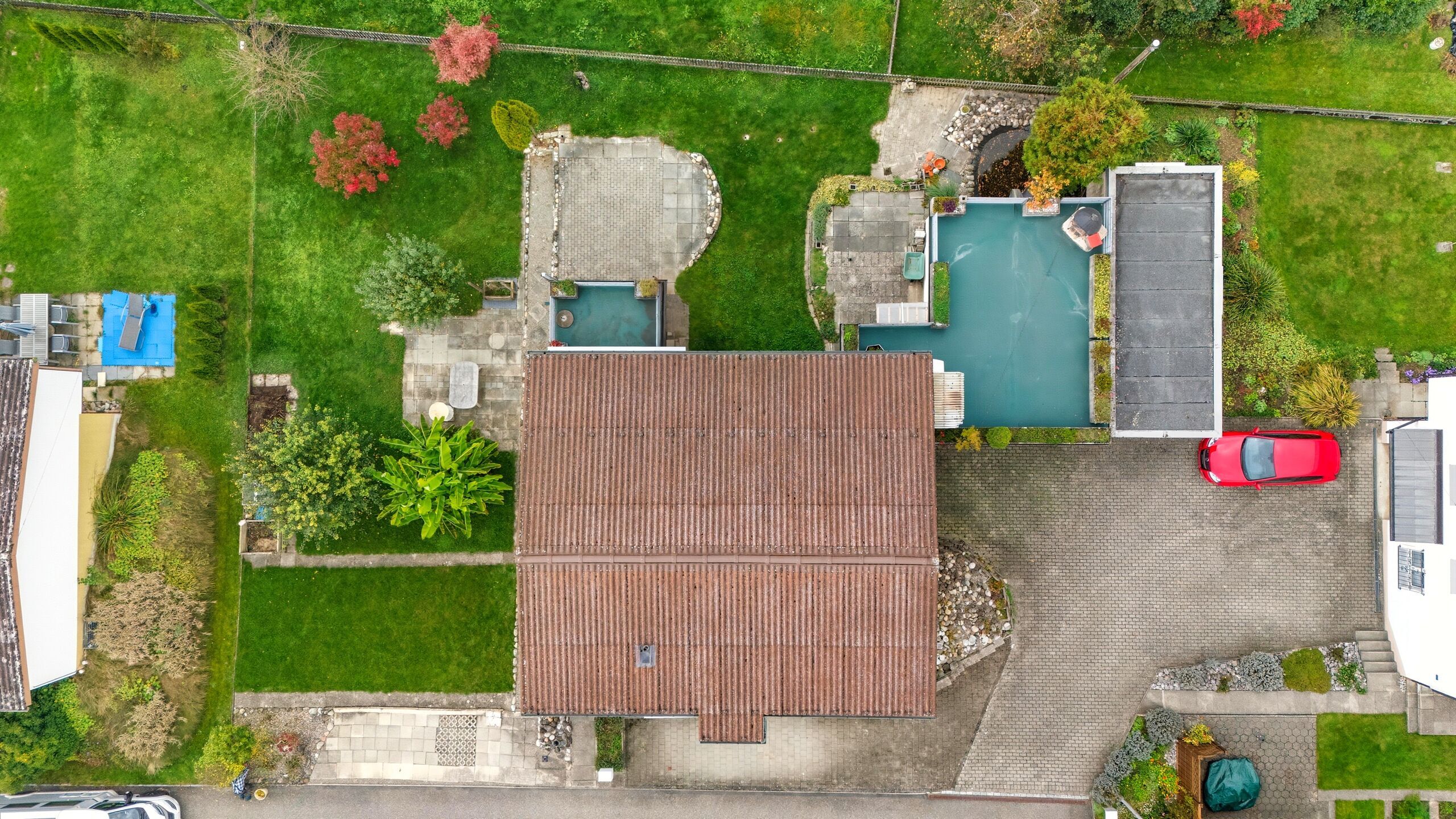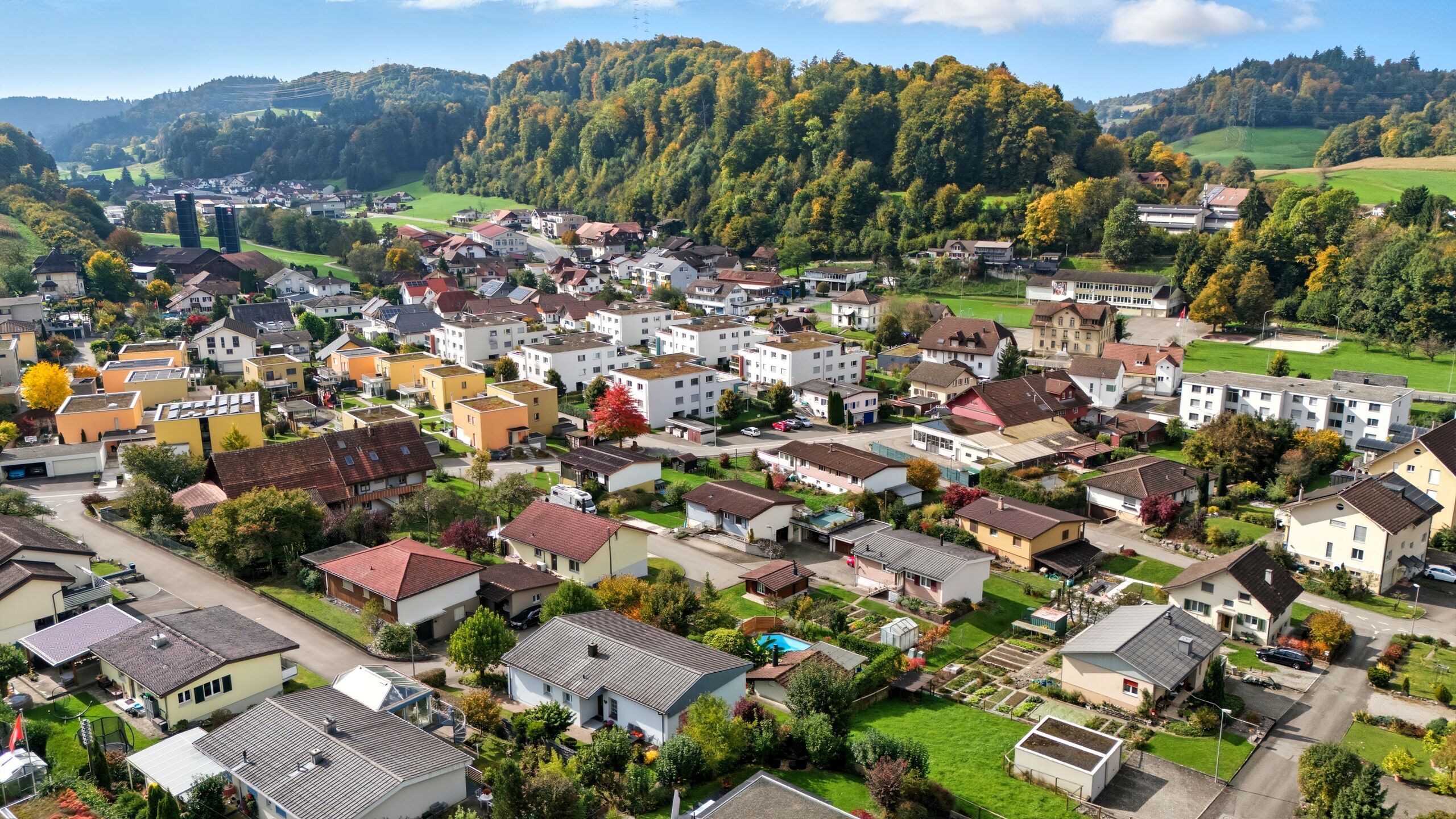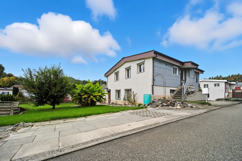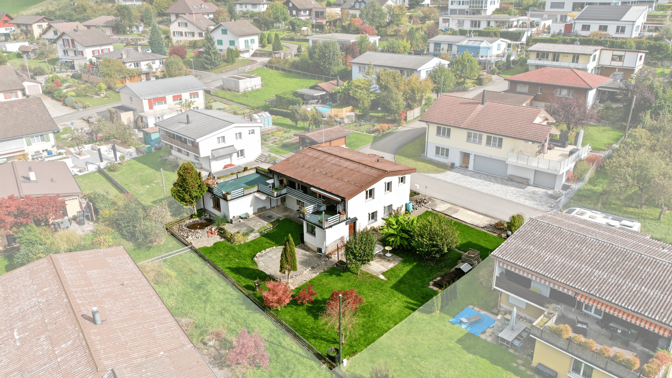 Der Aussenbereich überzeugt mit einem gepflegten Gartensitzplatz, einer schönen Rasenfläche und einem charmanten Gartenhäuschen mit eigenem Ofen – ein Ort, der zum Verweilen einlädt. Drei Garagenplätze und zusätzliche Aussenstellplätze sorgen für eine komfortable Parksituation.
